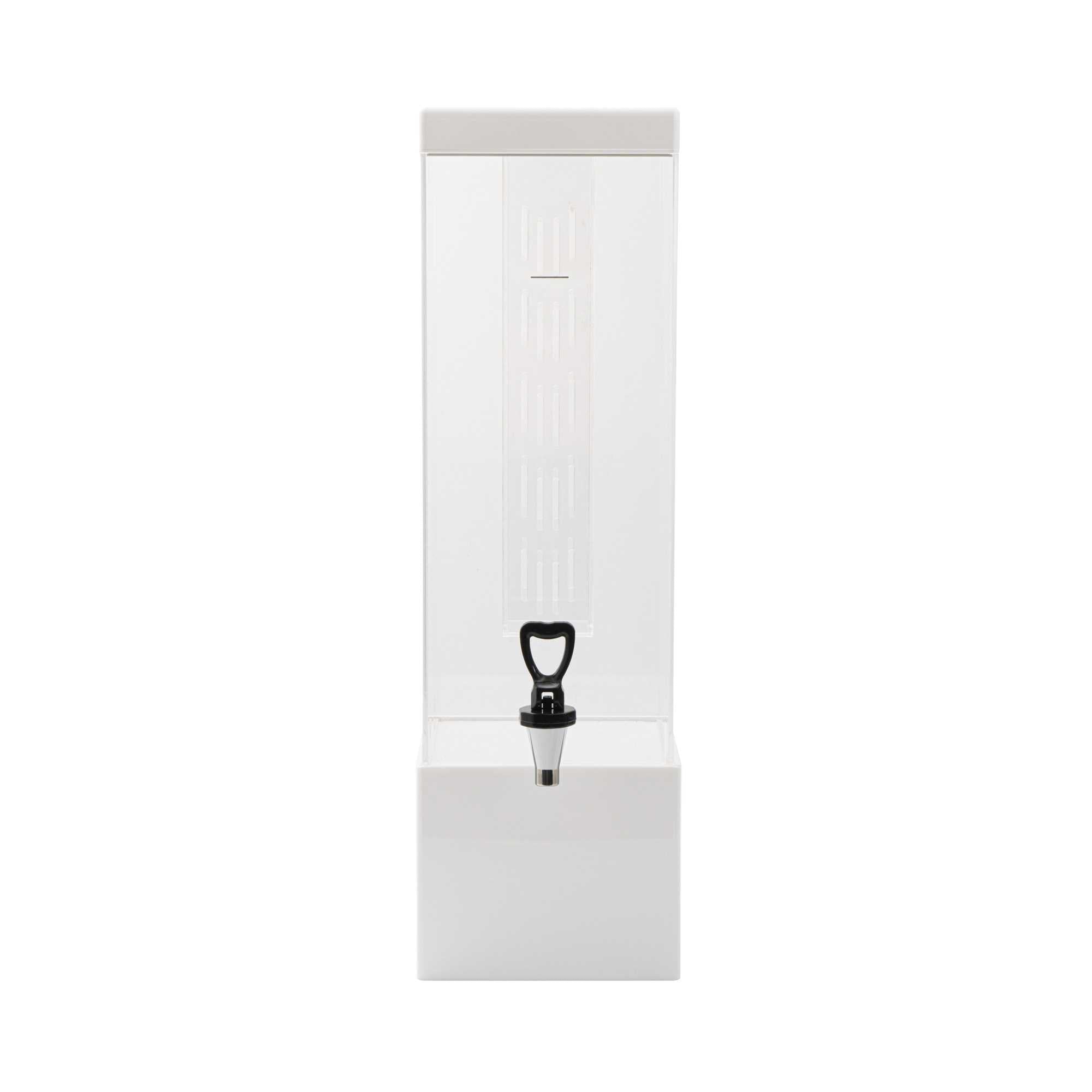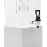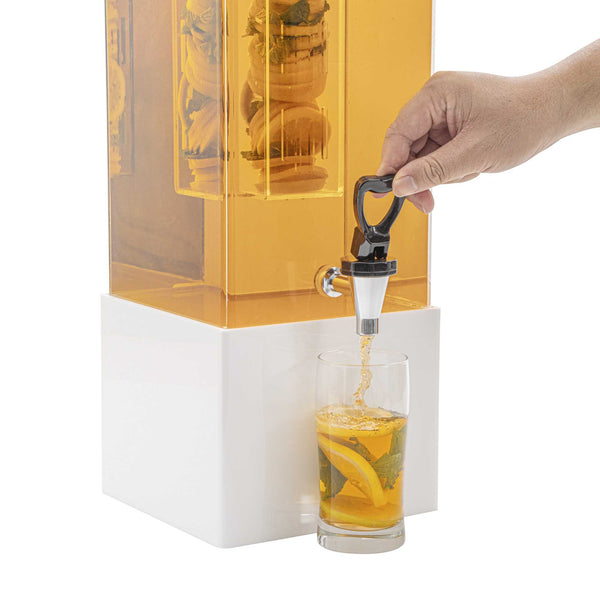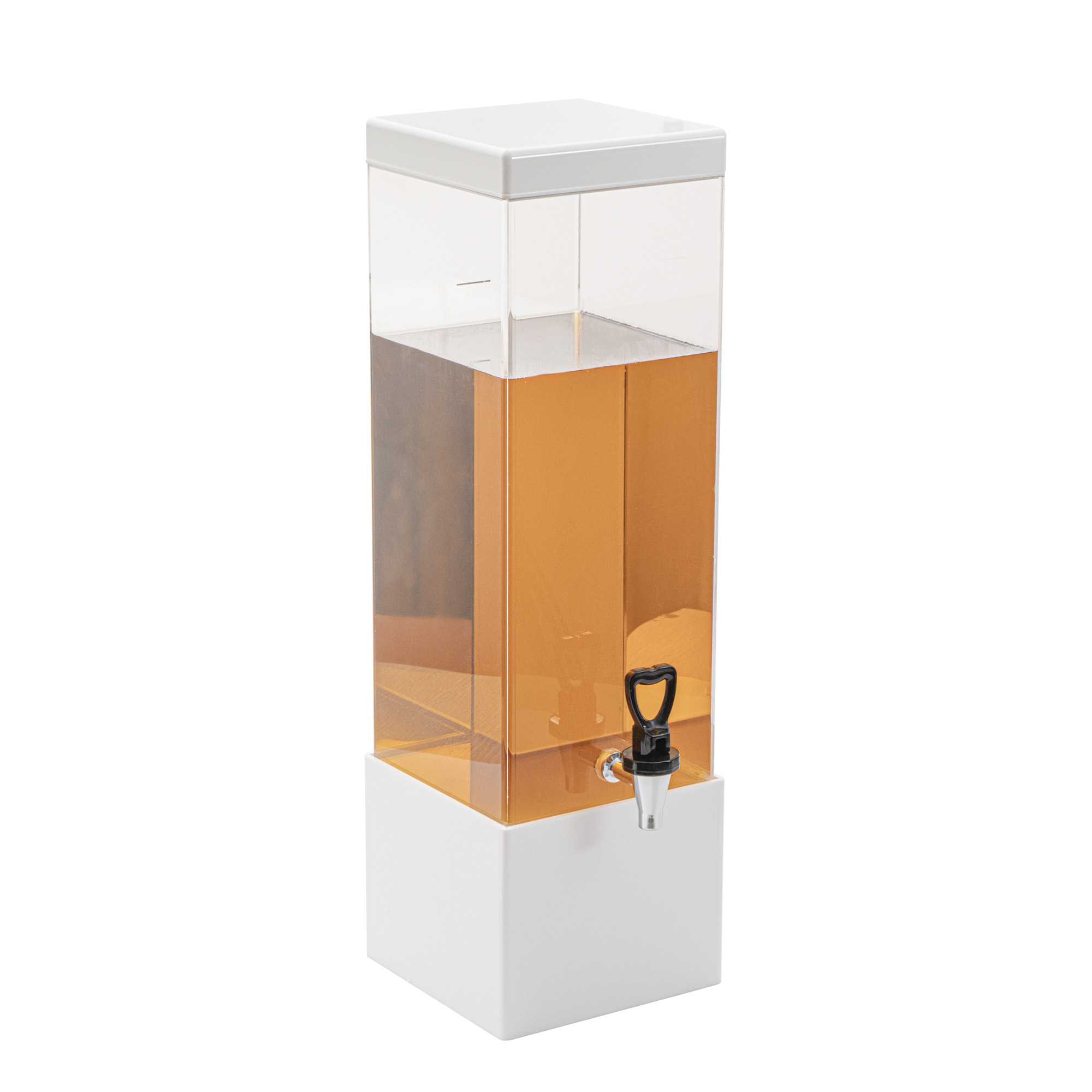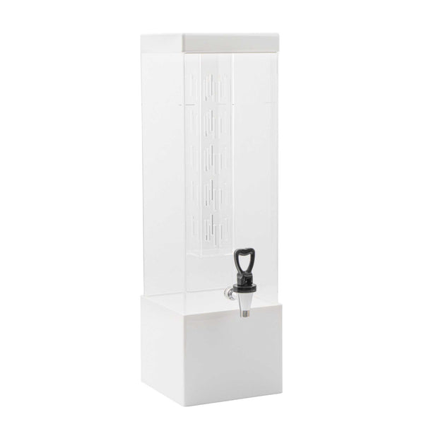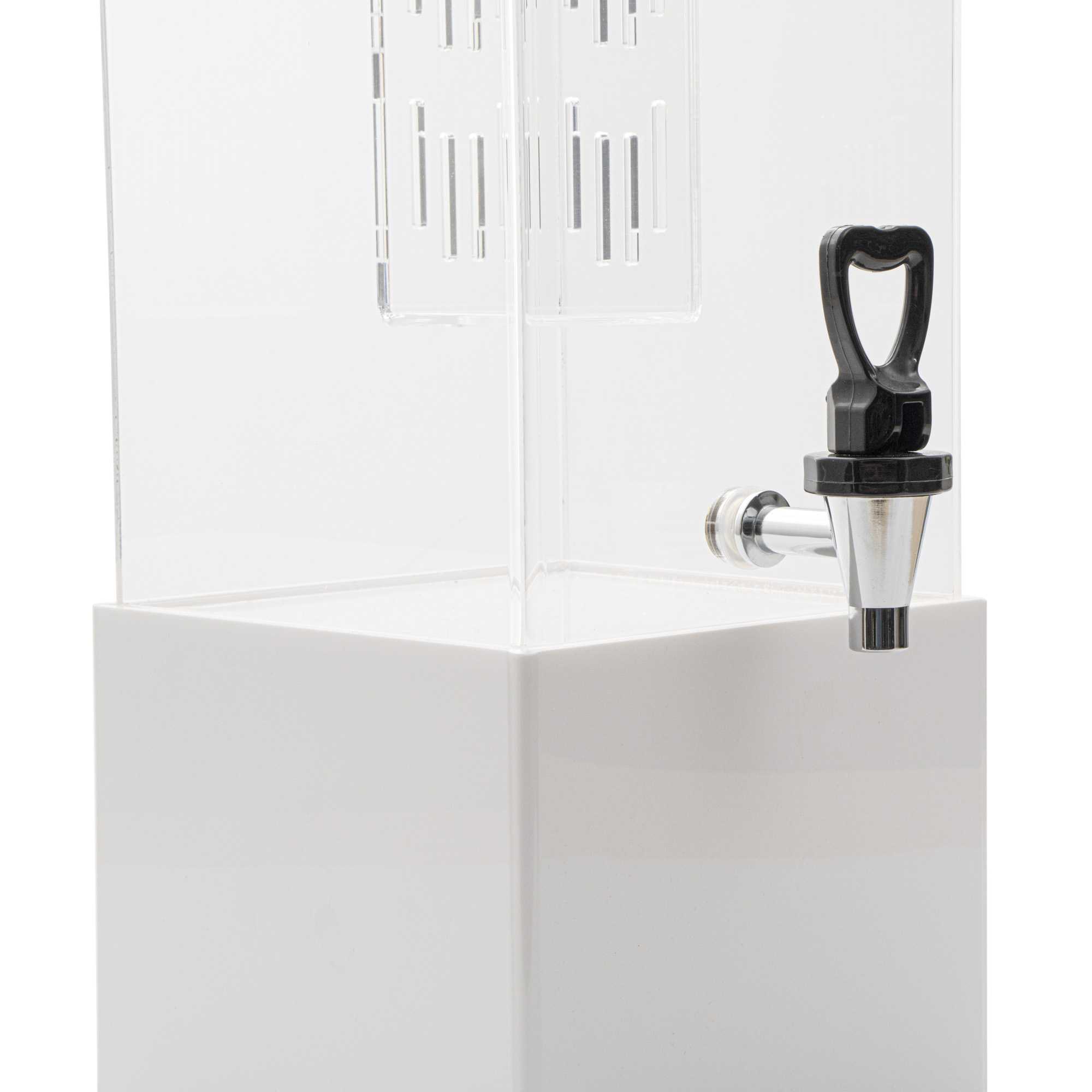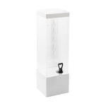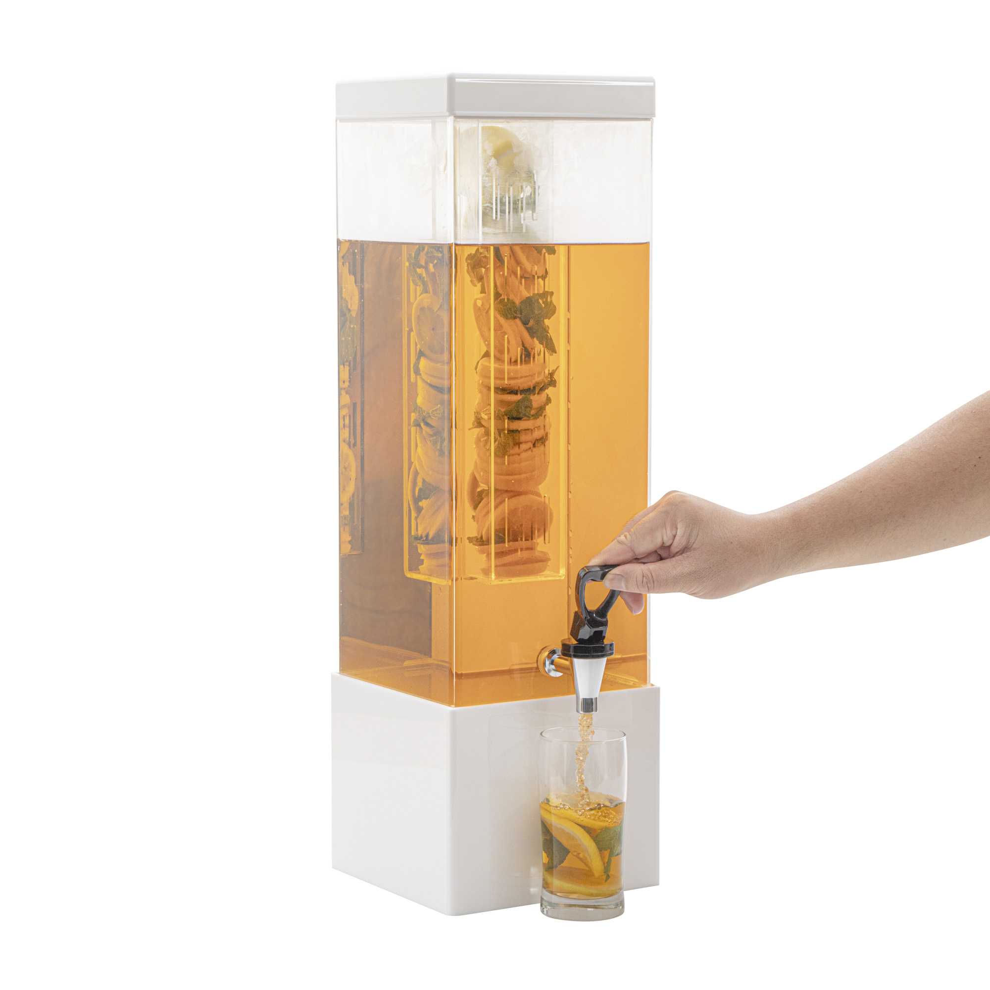 Customers can self serve your delicious drinks with our Bev Tek 3-gal Square Clear Acrylic Beverage Dispenser. The infusion core of this large drink dispenser can be filled with sliced fruit to give drinks a fresh-tasting flavor. This beverage dispenser with infuser can hold up to 3 gallons of punch or tea. Equipped with a white base, this party drink dispenser elegantly enhances beverage displays to impress guests at your catered event. The spigot of this cold drink dispenser won't drip while not in use to minimize messes or spill onto tabletops. Crafted from high-quality acrylic, this infused water dispenser is shatterproof, making it perfect for constant use at your hotel, tea house, or restaurant. Designed with a crystal clear finish, this acrylic beverage dispenser gives customers a full view of your beverage mixed with various fruits. With a square shape, this commercial juice dispenser gives your beverage displays a stylish and modern look. This bar drink dispenser includes removable parts for easy transport and assembly. This 3-gallon beverage dispenser measures 7.75 inches long by 7.75 inches wide by 25.75 inches tall. Sold in a 1 count box.