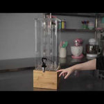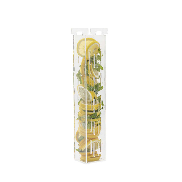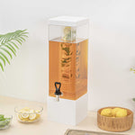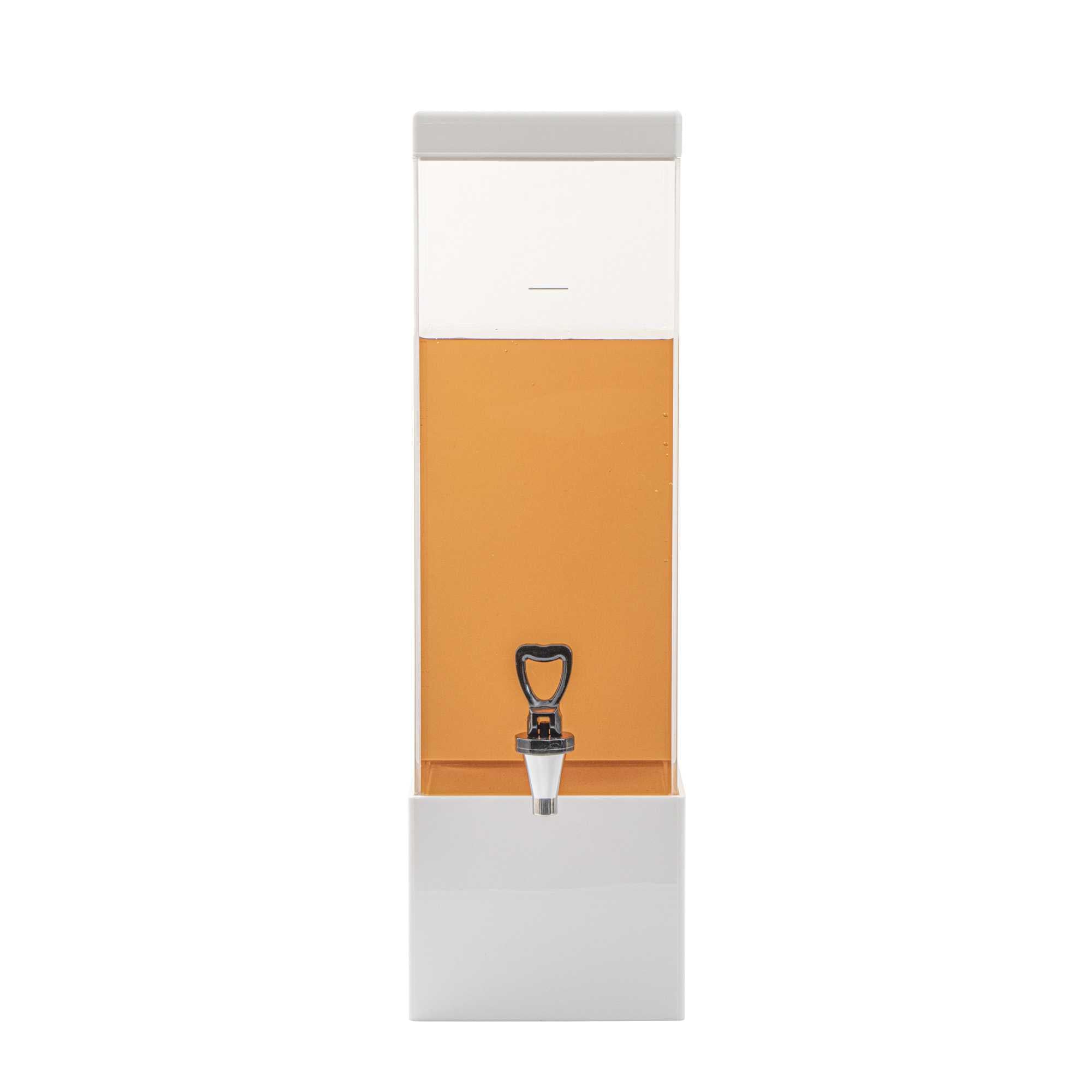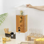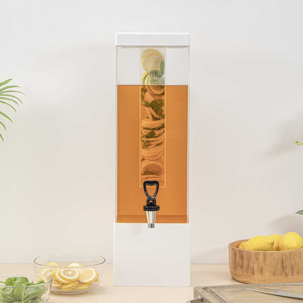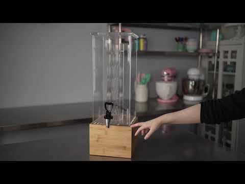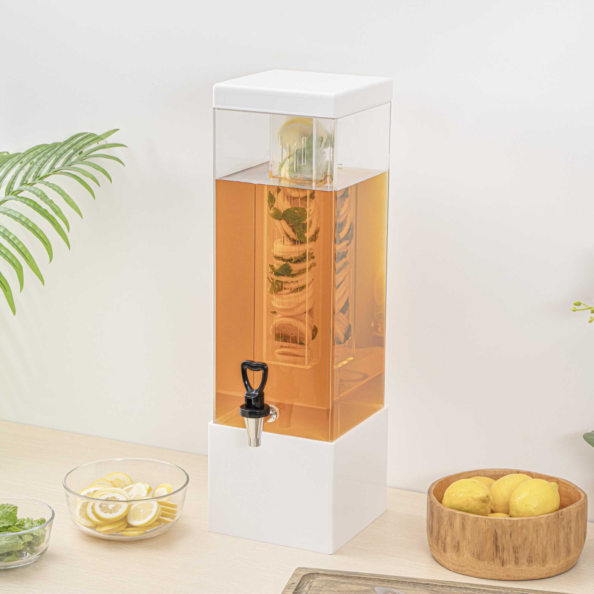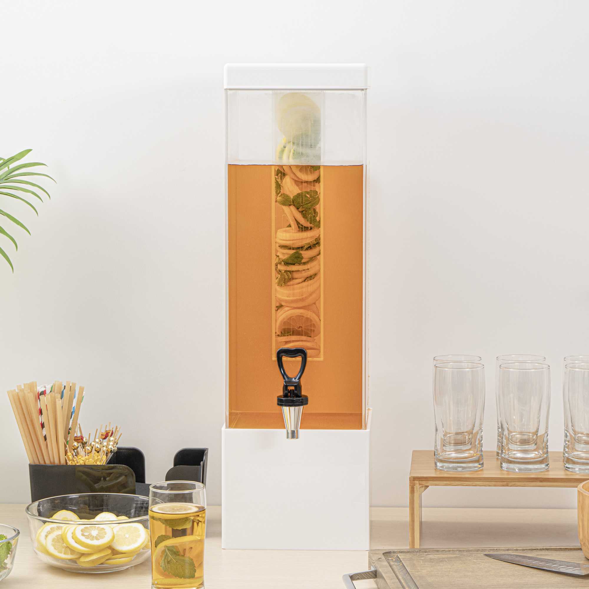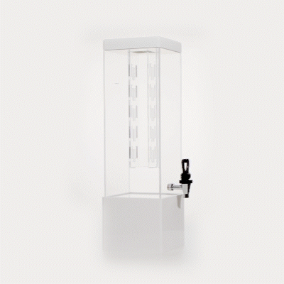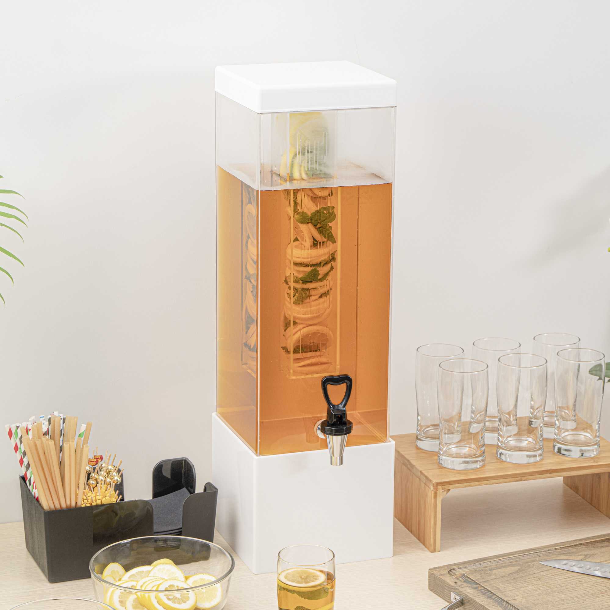 Customers can self serve your delicious drinks with our Bev Tek 3-gal Square Clear Acrylic Beverage Dispenser. The infusion core of this large drink dispenser can be filled with sliced fruit to give drinks a fresh-tasting flavor. This beverage dispenser with infuser can hold up to 3 gallons of punch or tea. Equipped with a white base, this party drink dispenser elegantly enhances beverage displays to impress guests at your catered event. The spigot of this cold drink dispenser won't drip while not in use to minimize messes or spill onto tabletops. Crafted from high-quality acrylic, this infused water dispenser is shatterproof, making it perfect for constant use at your hotel, tea house, or restaurant. Designed with a crystal clear finish, this acrylic beverage dispenser gives customers a full view of your beverage mixed with various fruits. With a square shape, this commercial juice dispenser gives your beverage displays a stylish and modern look. This bar drink dispenser includes removable parts for easy transport and assembly. This 3-gallon beverage dispenser measures 7.75 inches long by 7.75 inches wide by 25.75 inches tall. Sold in a 1 count box.
