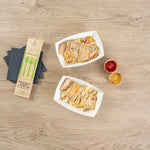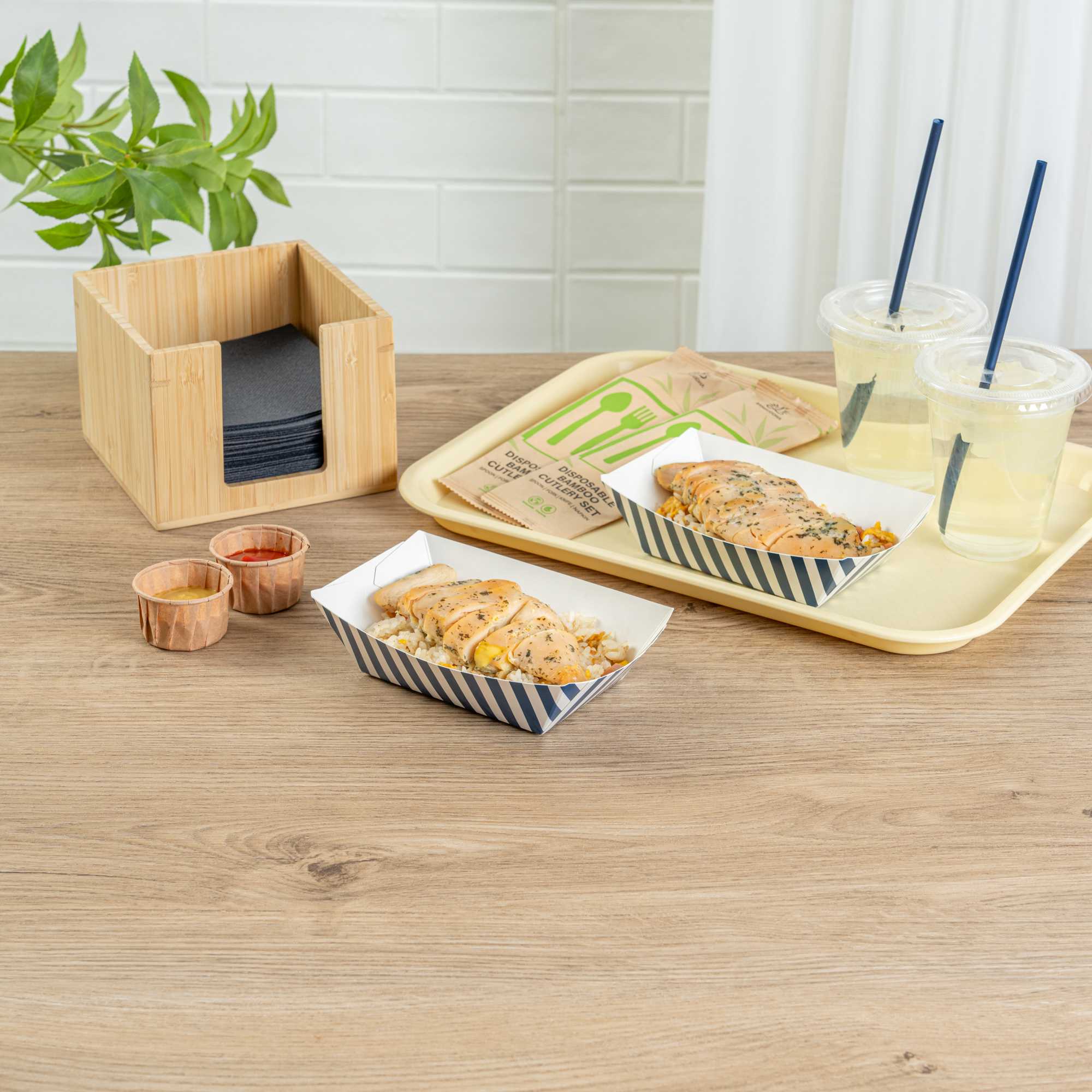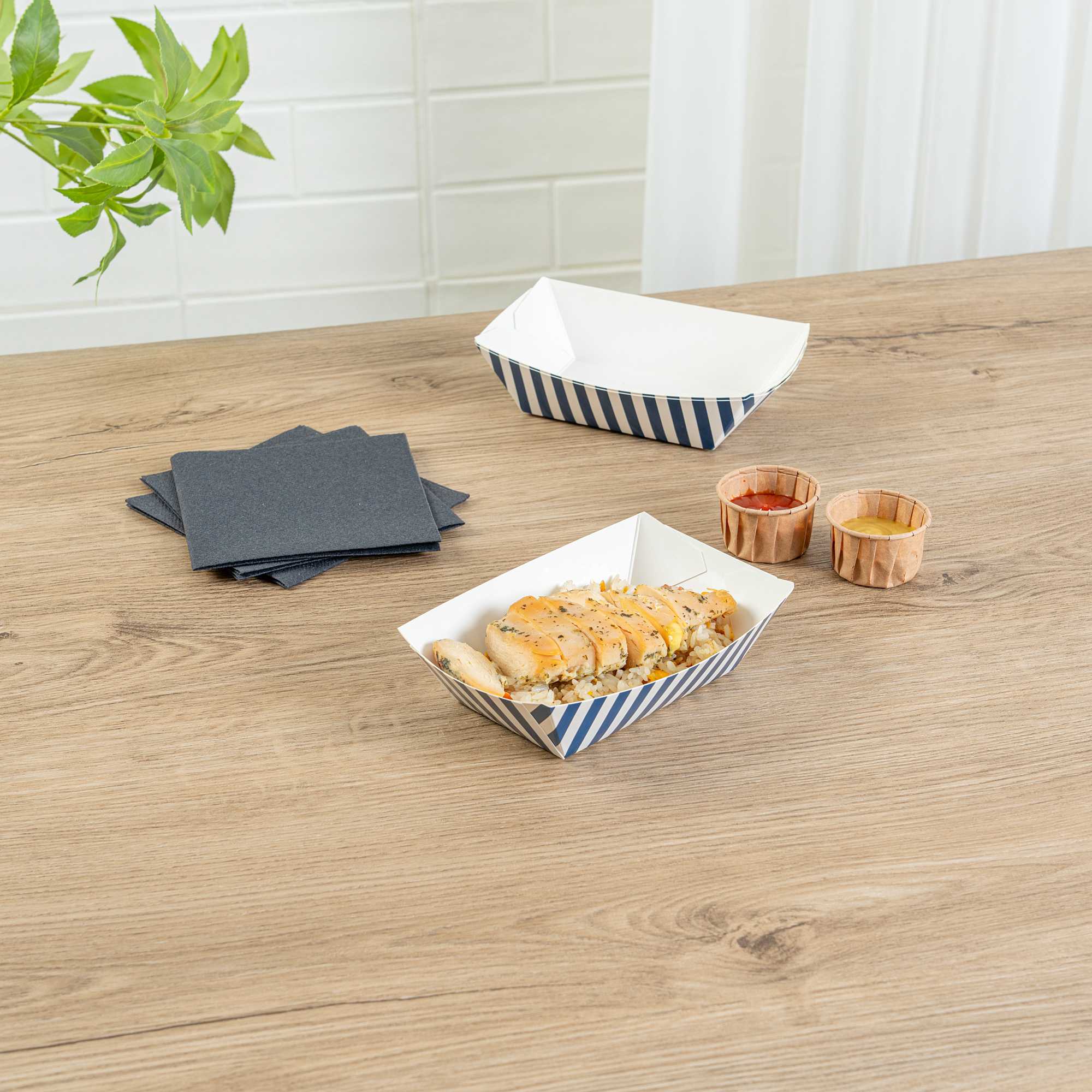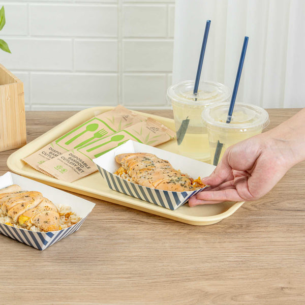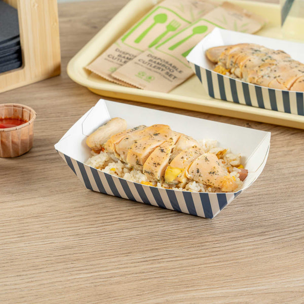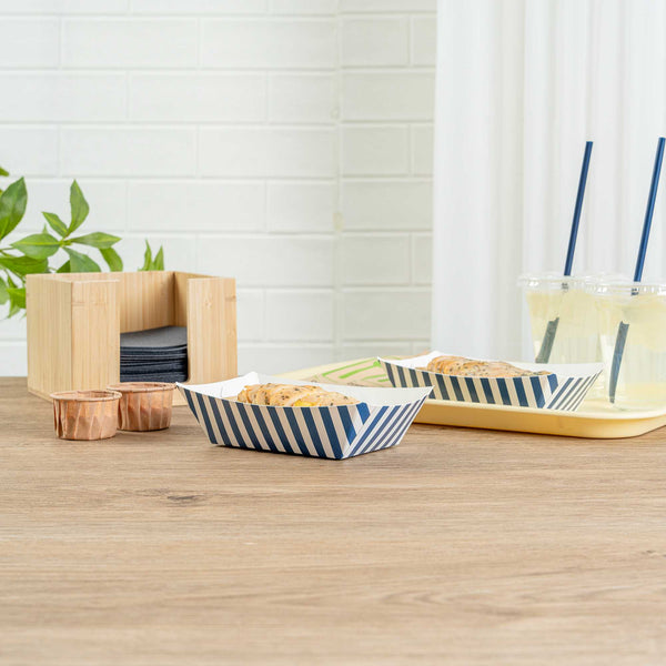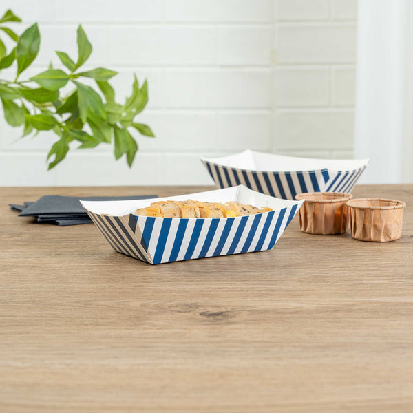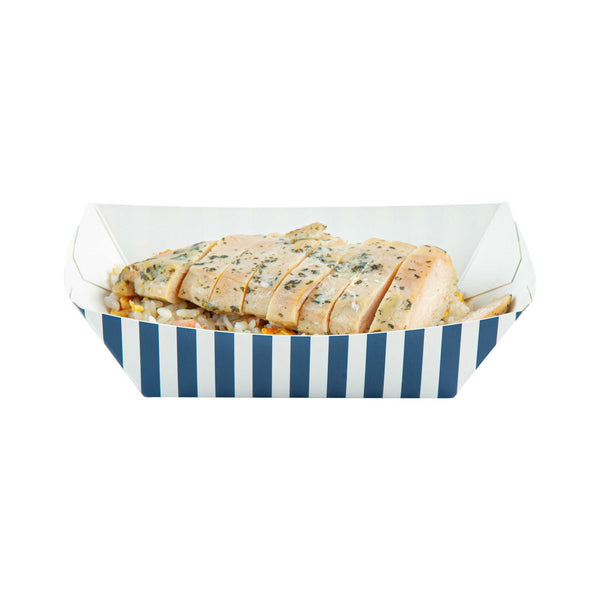 Indulge in elegance with our Bio Tek 0.5-pound Blue and White Stripe Paper #50 Food Tray / Boats. Expertly crafted from sustainable paper, these 0.5-pound striped paper trays lend a touch of sophistication to your culinary offerings. Engineered to accommodate generous portions, these durable trays are perfect for hearty appetites. Enhanced with a greaseproof lining, they are well-suited for dishes laden with oil or moisture. From mouthwatering burgers and lobster rolls to crispy Caesar salads and chicken wings, these #50 paper food trays redefine convenience for takeaway orders. Each tray measures 4.25 inches long by 2.75 inches wide at the base and 7 inches long by 4 inches wide at the top. Sold in a 50 count box.