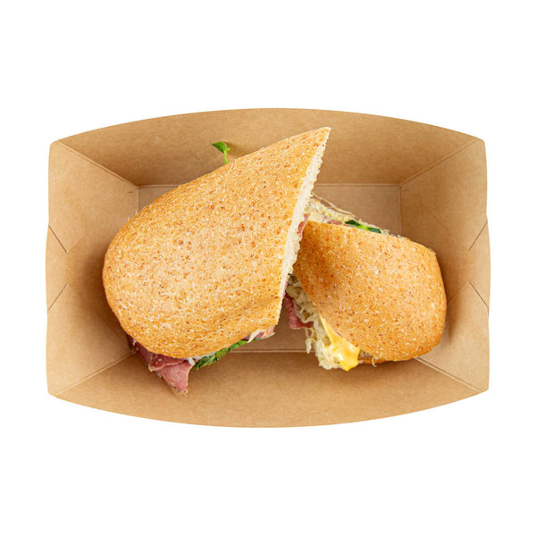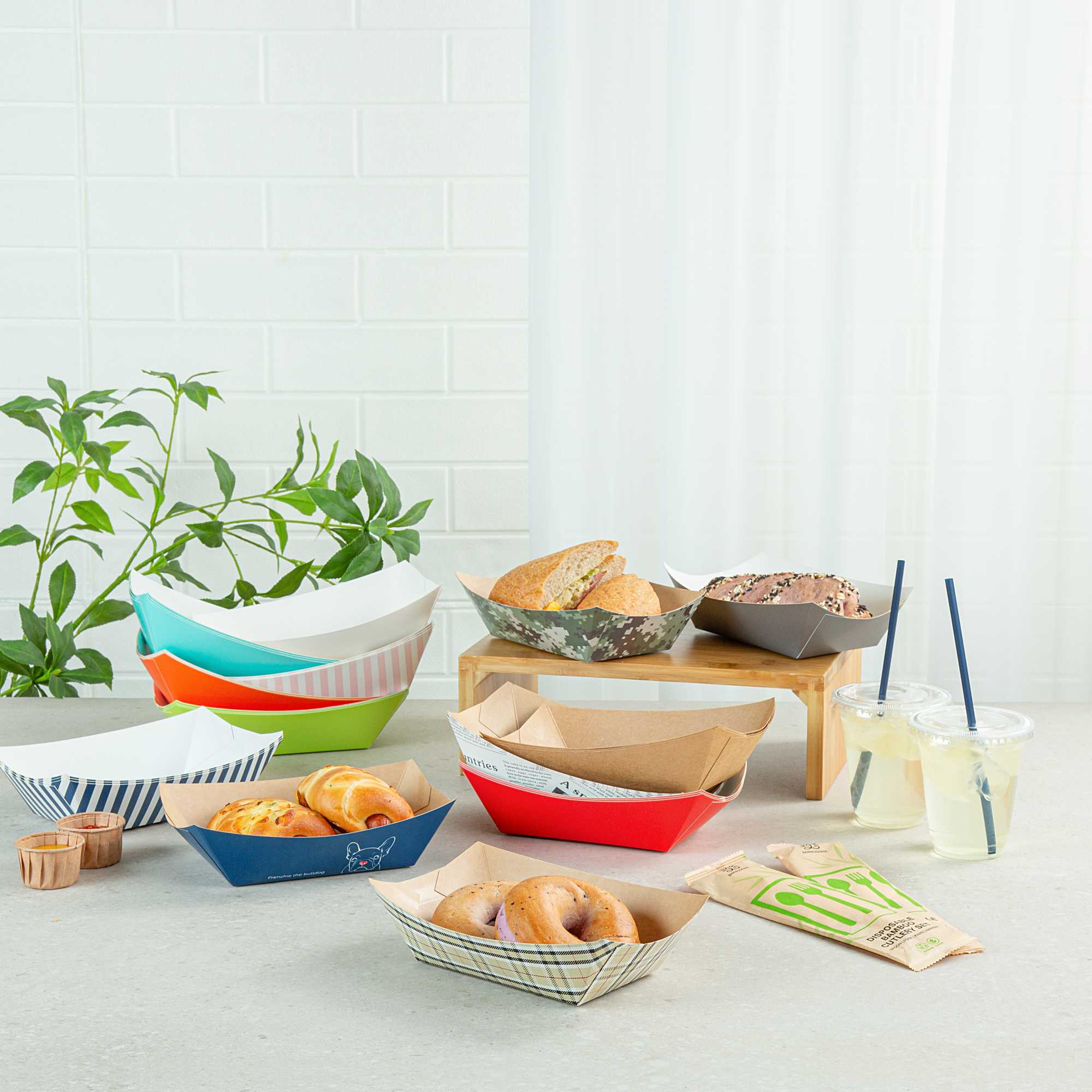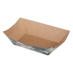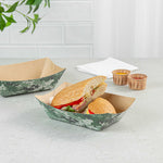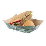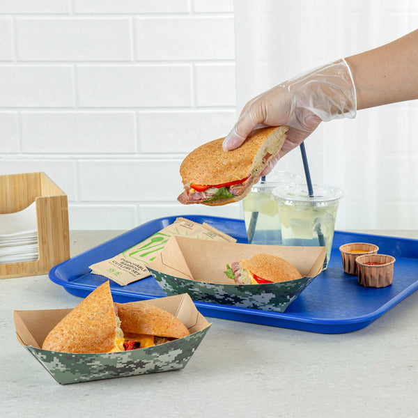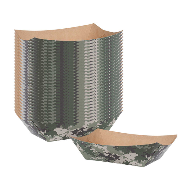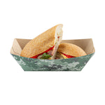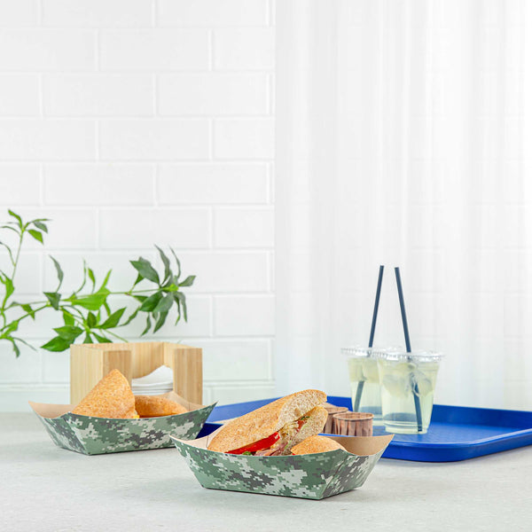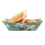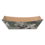 Serve your culinary creations with style using our Bio Tek 1-pound Camouflage Paper #100 Food Tray / Boats. Crafted from durable paper, these 1-pound camouflage trays add a touch of elegance to your food presentation. Designed to accommodate hearty portions, these sturdy trays are perfect for satisfying appetites. Enhanced with a greaseproof lining, they are ideally suited for dishes that are rich in oil or moisture. Whether it's burgers, lobster rolls, Caesar salads, or chicken wings, these paper food trays offer a convenient solution for takeaway dining. Each of these paper food trays measures 5.5 inches long by 3.5 inches wide at the base and 8.4 inches long by 4.5 inches wide at the top. Sold in a 50 count box.
