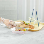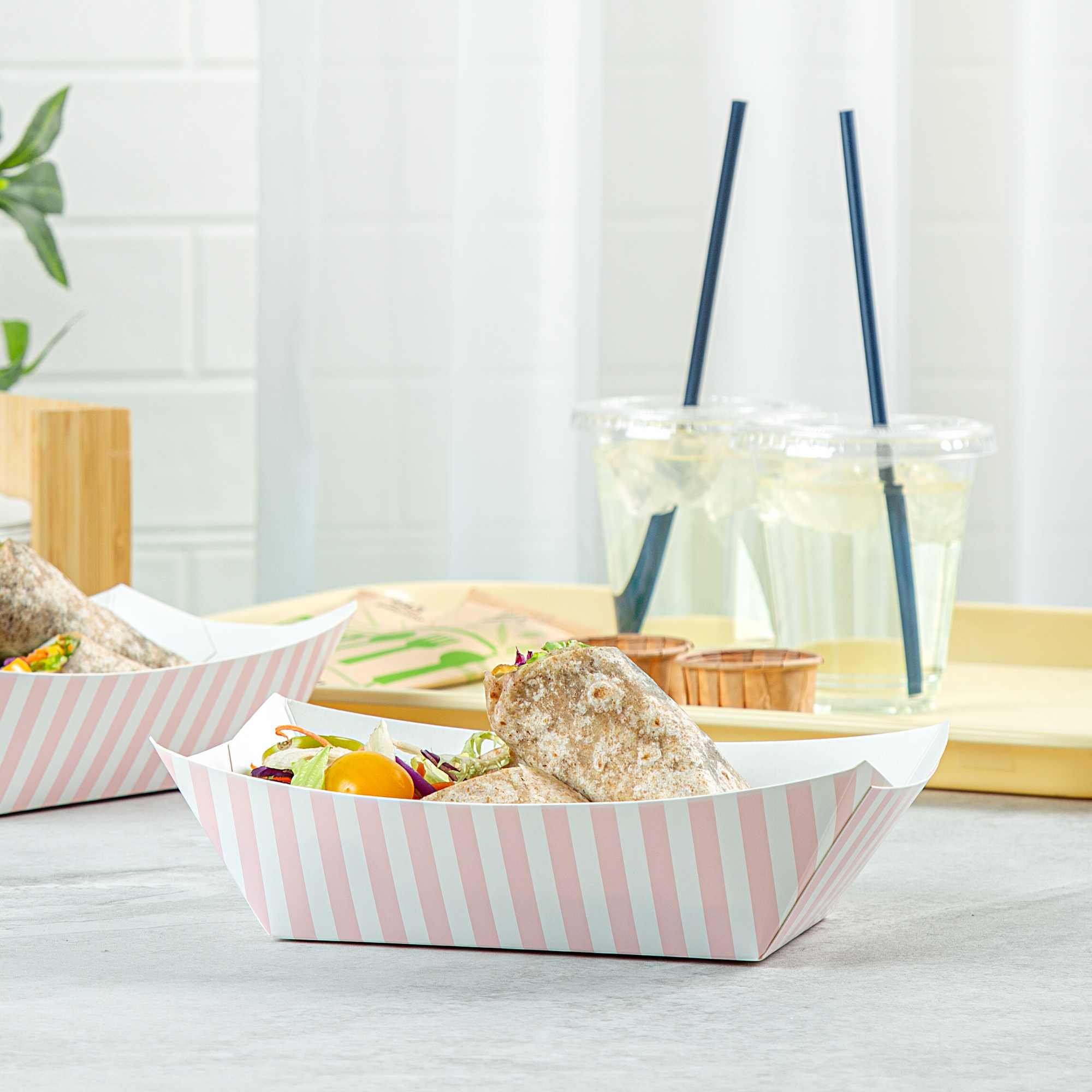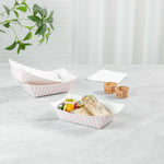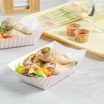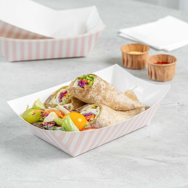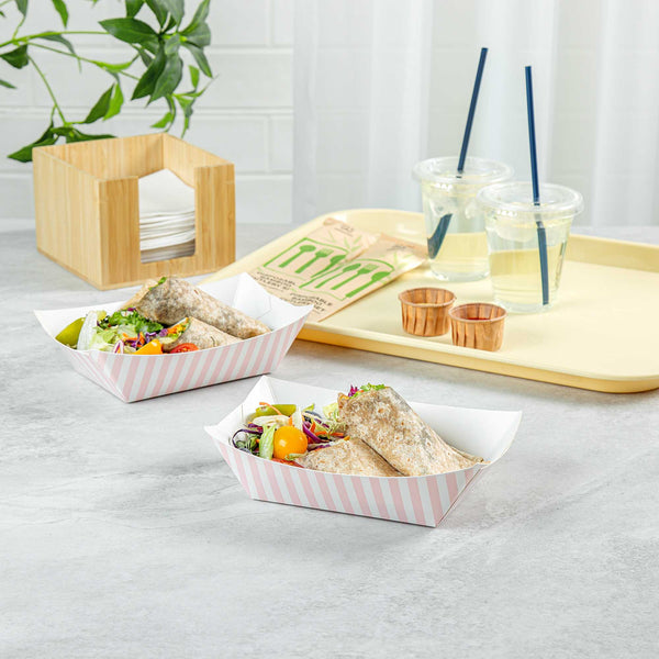 Elevate your dining experience with our Bio Tek 1-pound Pink and White Stripe Paper #100 Food Tray / Boats. Crafted from sustainable paper, these 1-pound striped trays add an air of sophistication to your culinary displays. Designed to accommodate hearty portions, these sturdy trays are perfect for satisfying appetites. Enhanced with a greaseproof lining, they are tailor-made for dishes that are rich in oil or moisture. Whether you're serving burgers, lobster rolls, Caesar salads, or chicken wings, these paper food trays provide a streamlined solution for takeaway dining. Each tray measures 4.2 inches long by 2.7 inches wide at the base and 7 inches long by 4 inches wide at the top. Sold in a 50 count box.