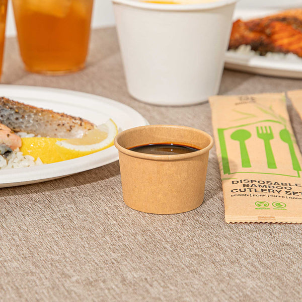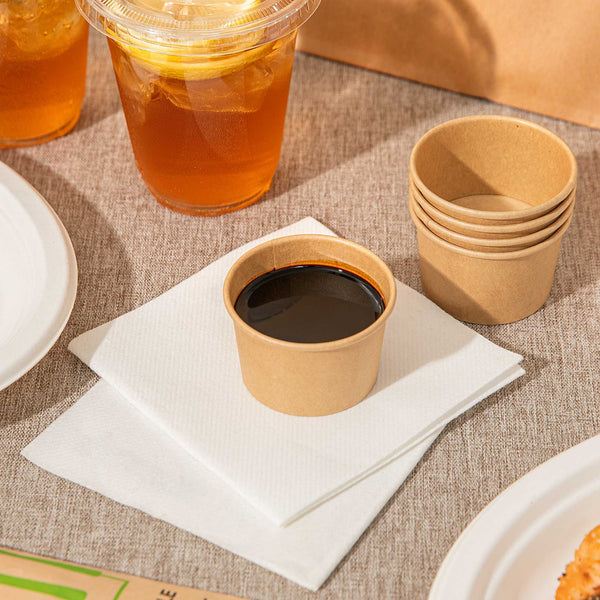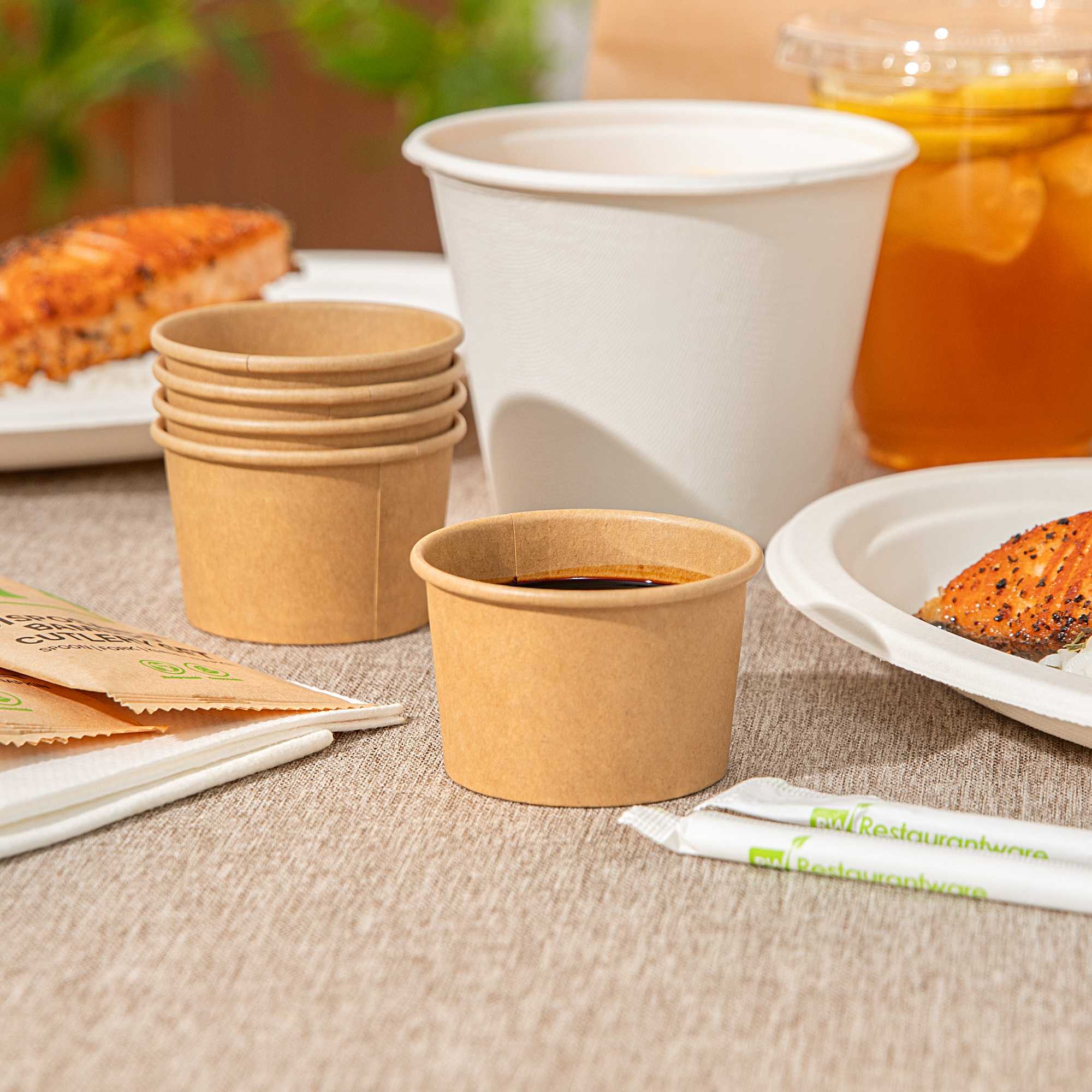 Ensure flawless sauce presentation with our Bio Tek 1 oz Kraft Poly-Coated Paper Portion Cup. This disposable sauce cup, crafted from 210gsm kraft paper with a PE coating, features a greaseproof, leak-proof, and moisture-resistant design that prevents messy spills during service, making it an indispensable tool for busy kitchens. Its freezer-safe construction is perfect for storing desserts, keeping them fresh and ready for plating. Measuring 2.44 inches in diameter by 1.58 inches in width with capacity of 1 ounce, this small sauce container is ideal for both hot and cold foods, offering versatile use across diverse menu offerings. The recyclable nature of this kraft paper sauce cup underscores your commitment to sustainability while providing practical benefits. Elevate your food presentation and streamline operations with the reliability of our sauce cups. Each order includes 2000 Bio Tek 1 oz Kraft Poly-Coated Paper Portion Cups.