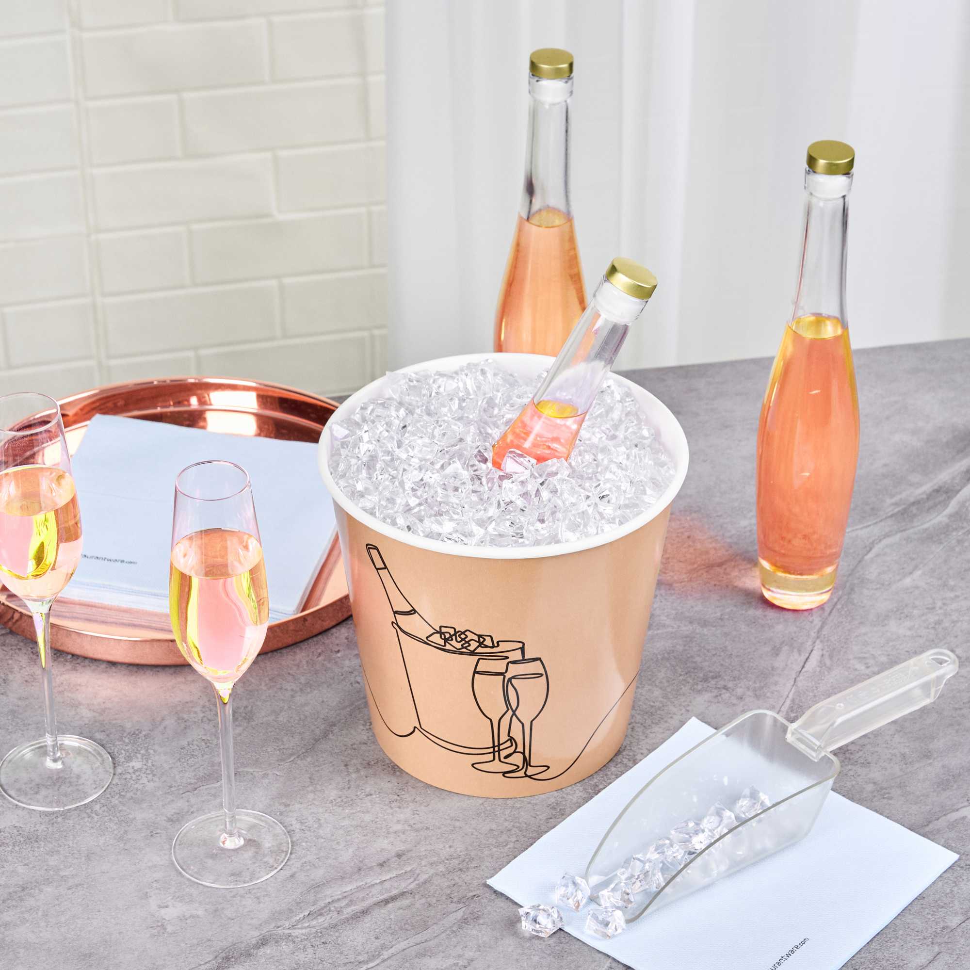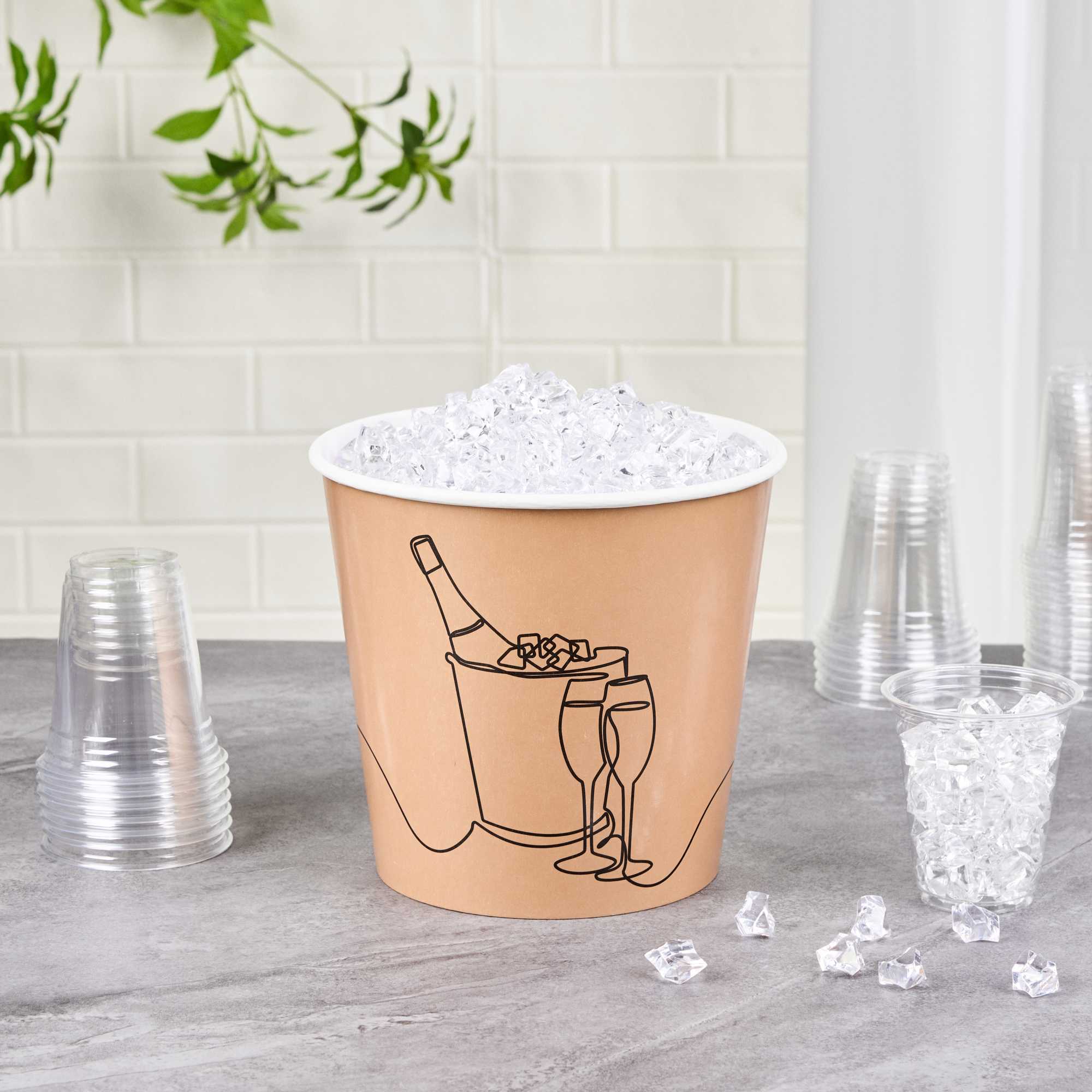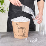 Ensure ice remains chilled with the Bio Tek 10 lb Kraft Disposable Paper Ice Bucket. This kraft paper ice bucket with printed design features a double liner that keeps ice colder for longer periods, making it ideal for hotel room service or event catering. Its freezer-friendly design supports the storage of chilled desserts, allowing you to keep ice cream or sorbets at optimal temperatures. Crafted from sturdy, double-sided poly-coated paper, this disposable ice bucket combines functionality with style. The polyethylene coating makes it leak-resistant and suitable for both hot and cold food applications. Measuring 8.74 inches in length, 8.74 inches in width, and 8.15 inches in height, this kraft paper ice bucket is perfect for a variety of foodservice needs. Enhance your operations with this versatile solution. Sold in a 100 count box.