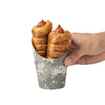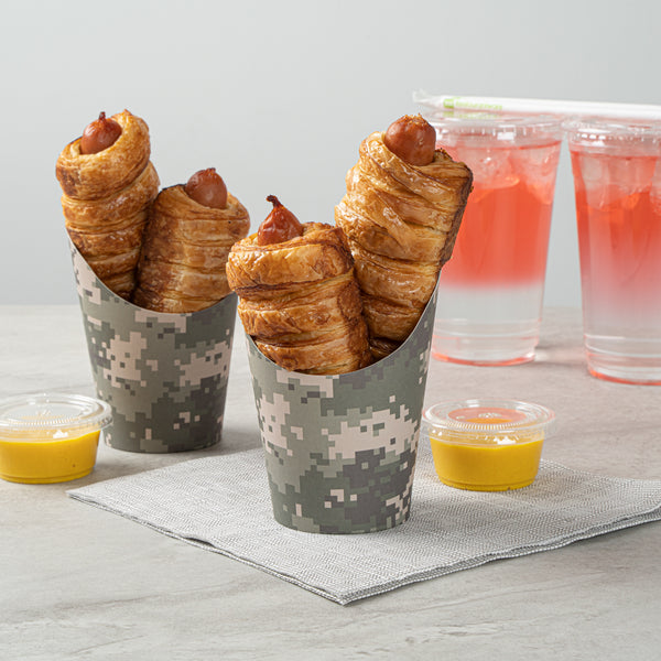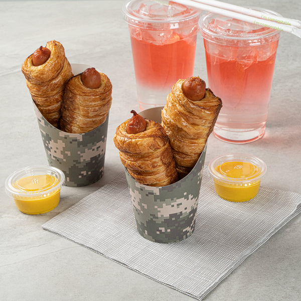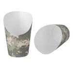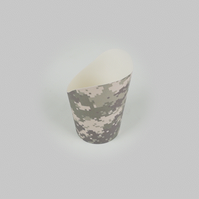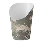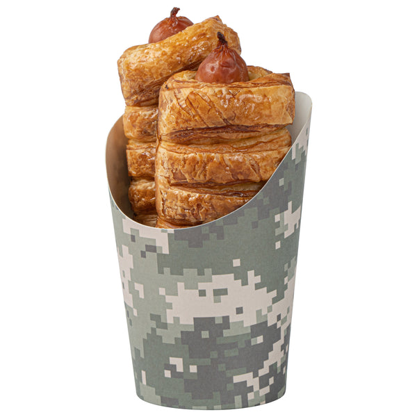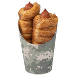 Elevate the look of your snack servings with our Bio Tek 12-ounce Round Camouflage Paper Incline Cups. With a built-in greaseproof lining, these incline cups ensure a clean exterior. The wide inclined rim of these fry cups allows easy scooping of fries from the warmer. These disposable snack cups are made of delicate but durable paper, allowing easy handling and steady positioning. The camouflage design of these fry holders enhances your snack presentation with a unique aesthetic appeal. These recyclable snack cups are designed for effortless stacking, providing easy storage solutions. Measuring 3.5 inches in diameter by 4.75 inches in height, these camouflage incline cups hold up to 12 ounces of snacks. Sold in a 100 count box.