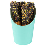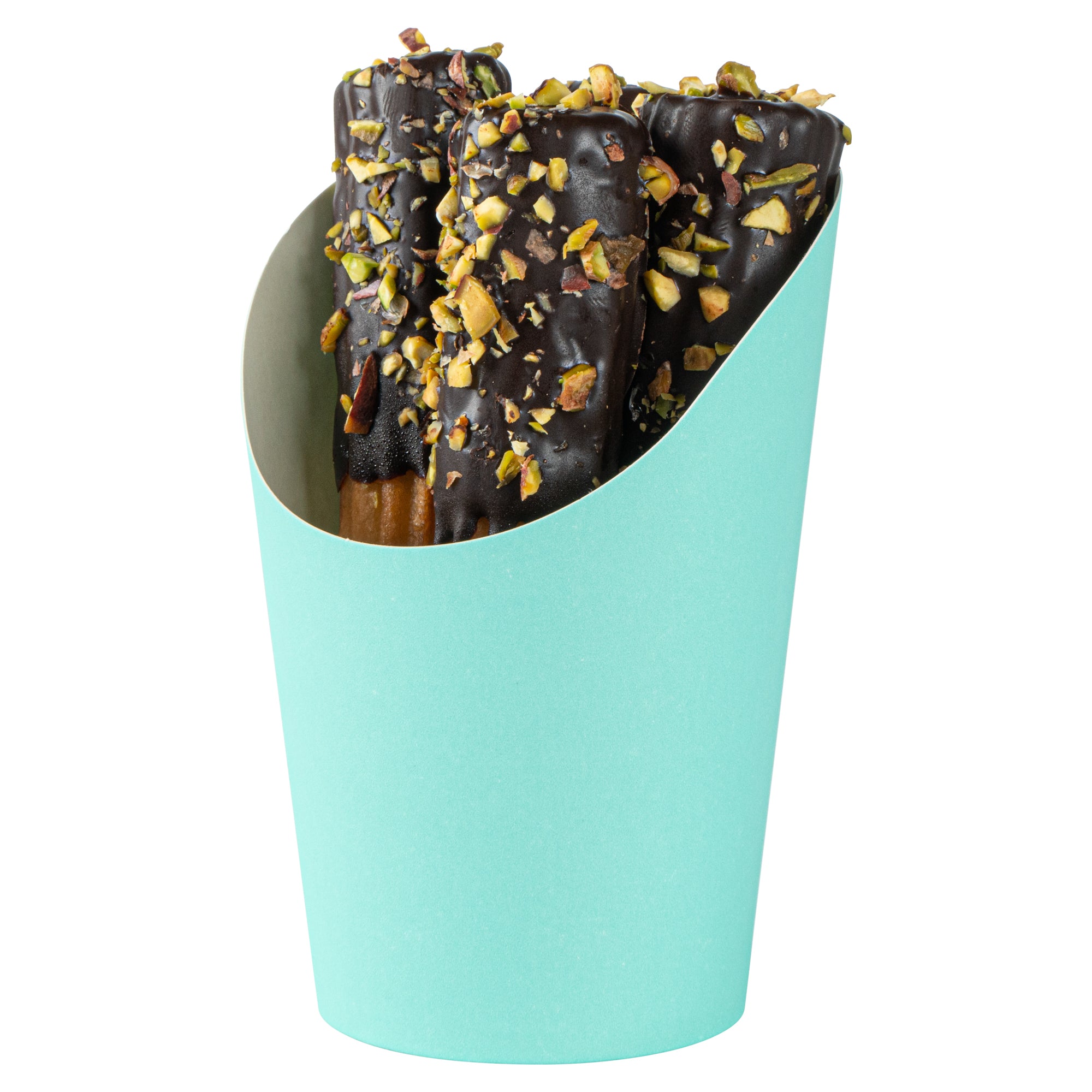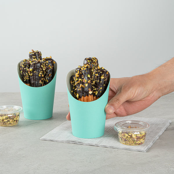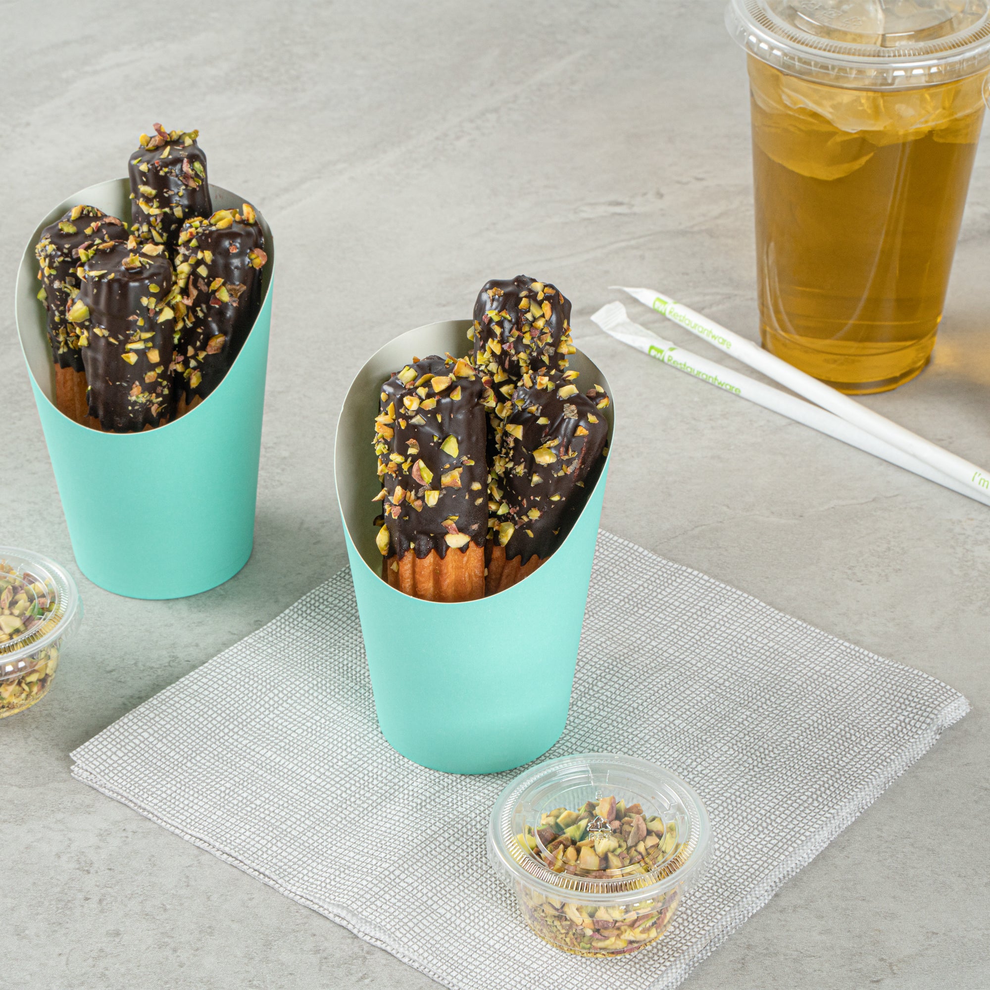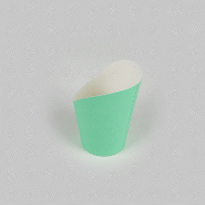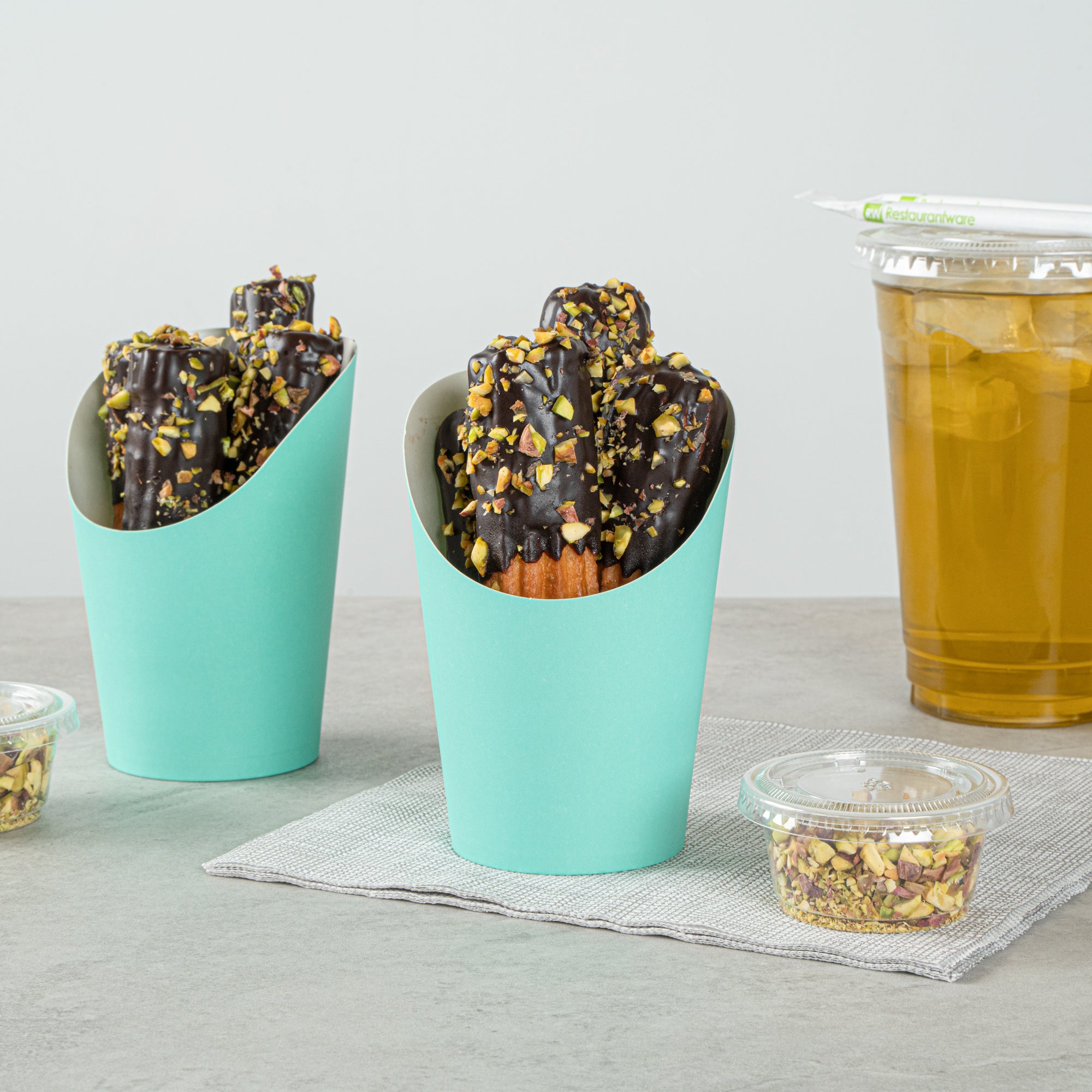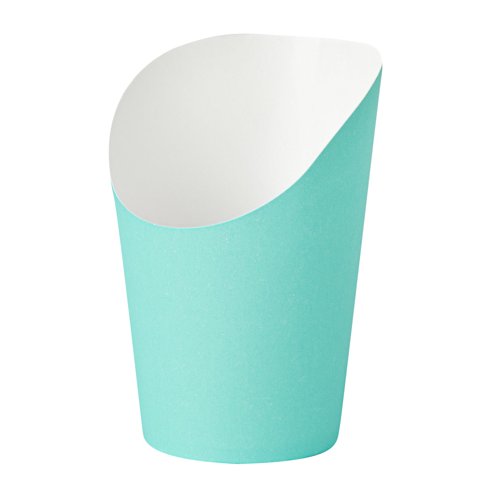 Revitalize your snack service with our Bio Tek 12-ounce Round Turquoise Paper Incline Cups. With a greaseproof lining, these incline cups avert oily blemishes for a pristine appearance. These snack cups are designed with a wide, inclined rim that allows quick and easy scooping of fries from the warmer. Made from top-notch paper, these disposable french fry containers ensure comfortable grip and stability during snacking. Featuring a vibrant turquoise finish, these turquoise paper cups add an appealing aesthetic to your side dishes and snacks. Being stackable, these french fry holders help in optimizing storage space. These recyclable paper snack cups are 3.5 inches in diameter and 4.75 inches high, with a capacity of 12 ounces. Sold in a 100 count box.