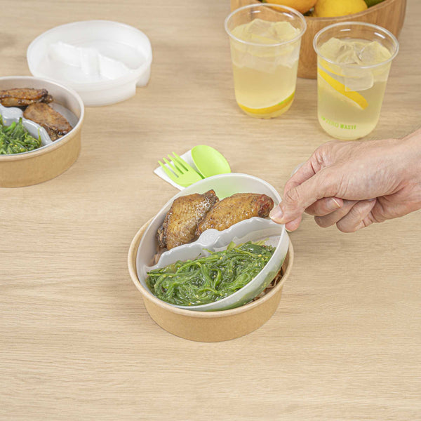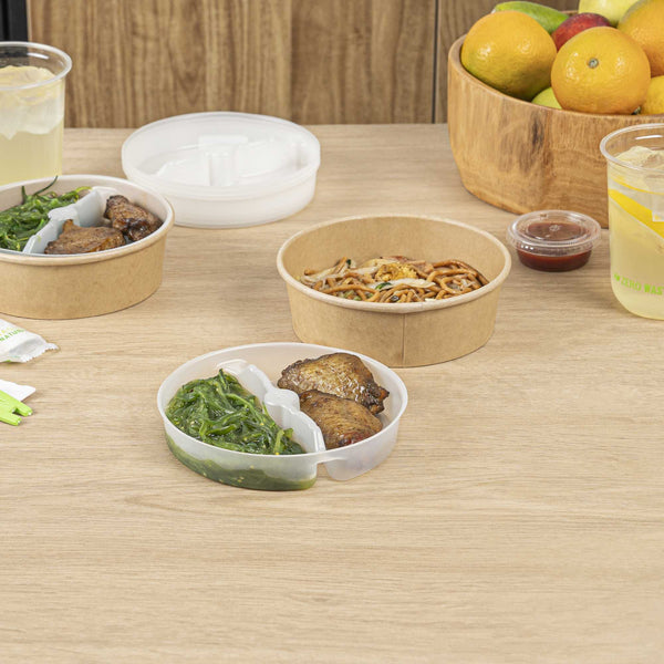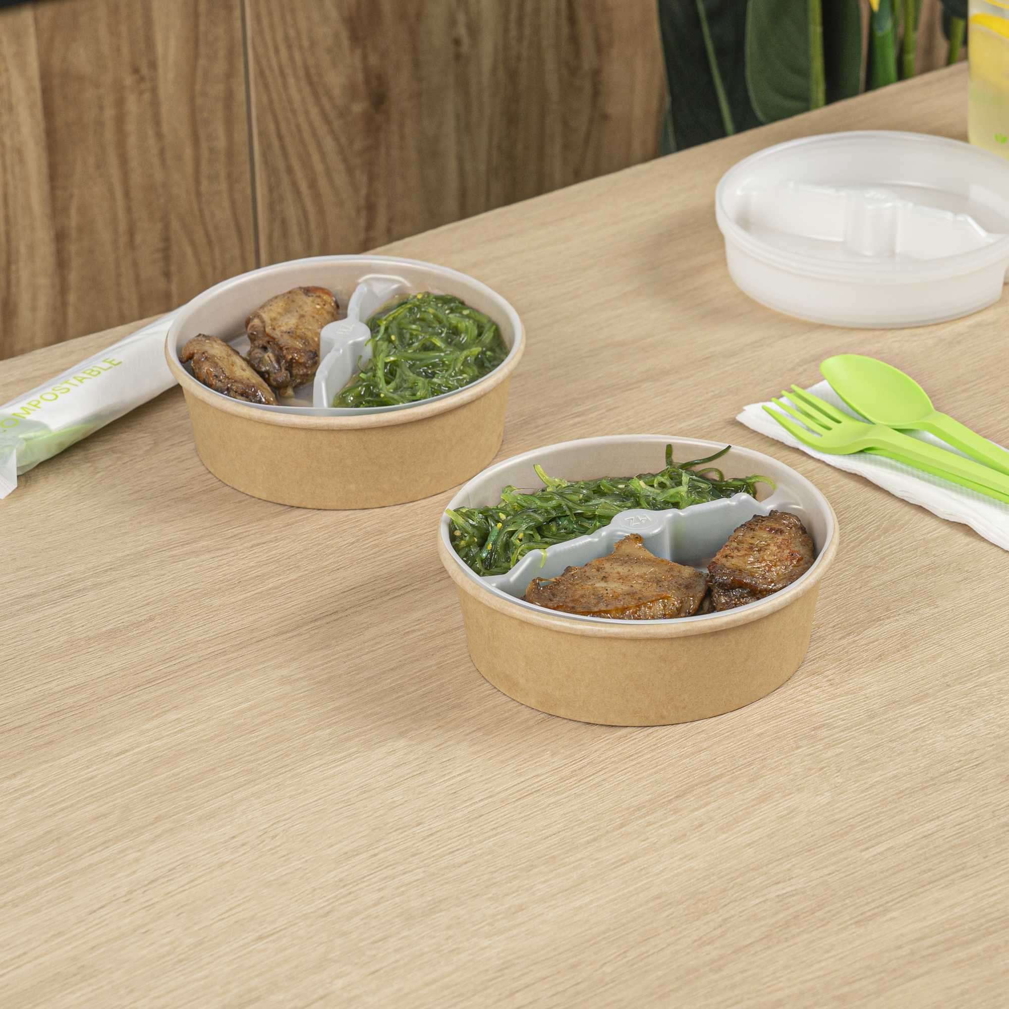 Elevate your food presentation with our Bio Tek 12-ounce White Plastic 2-Compartment Insert Trays. The 2-compartment design of these disposable food inserts allows you to pack a variety of food items conveniently. Pair these food trays with our collection of compatible take out containers for a perfect fit and streamlined foodservice experience. Designed for convenience, these insert trays are microwavable, allowing you to easily reheat meals without transferring dishes. Made from premium plastic, these serving trays are suitable for both hot and cold food items, ensuring versatility in your foodservice operations. Plus, these cafeteria trays are disposable and can be discarded after use, making cleanup quick. For an eco-friendly solution, these food plates are recyclable, helping you reduce your environmental impact. With a capacity of 12 ounces, these catering trays measure 6 inches in diameter by 1 inch in height, fitting perfectly into your foodservice routine. Sold in a 50 count box. Containers are available and sold separately.