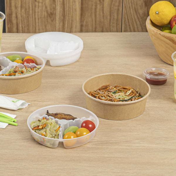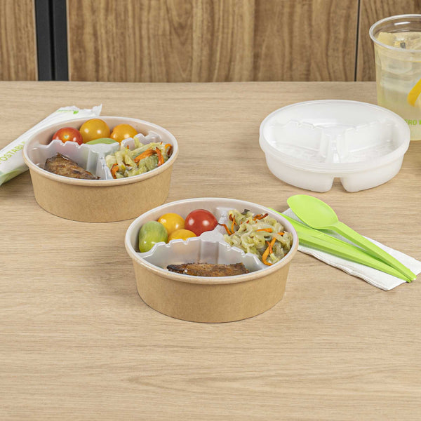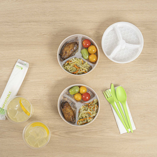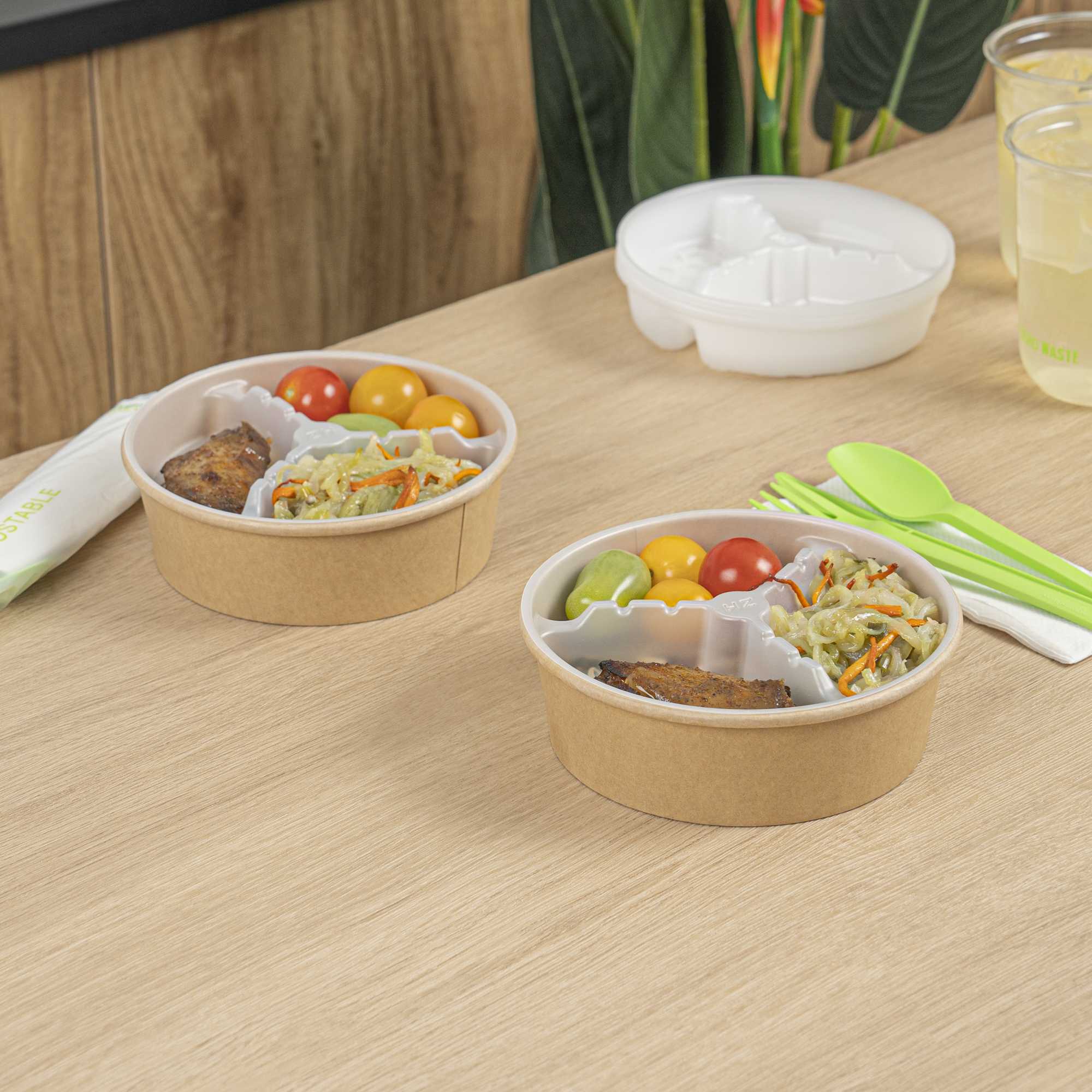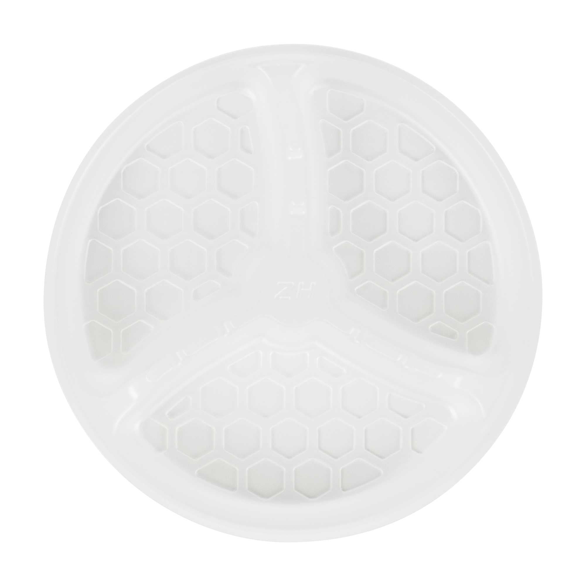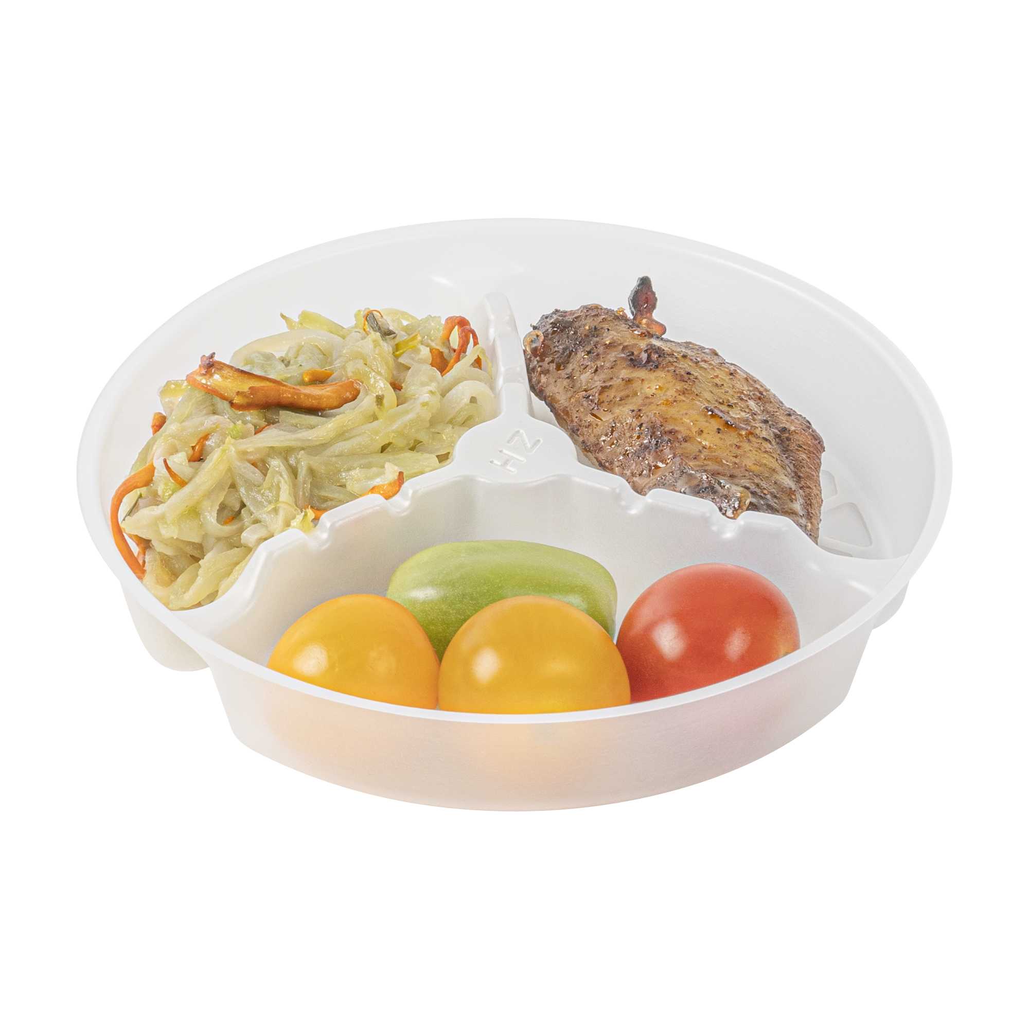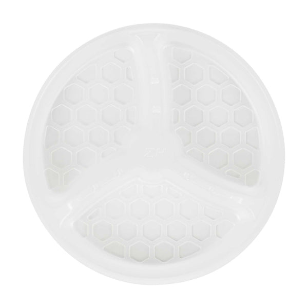 Elevate your food presentation with our Bio Tek 12-ounce White Plastic 3-Compartment Insert Trays. Designed with 3 compartments, these food trays offer versatile serving options for organizing various dishes efficiently. Pair these food insert trays with our collection of Bio Tek matching take out containers ensures a perfect fit and organized food transport. For added convenience, these plastic trays are microwavable, allowing you to easily reheat your meals. Crafted from premium plastic, these serving trays are suitable for both hot and cold food items, making them versatile for any catering event. These cafeteria trays are disposable and provide an easy cleanup, saving you time and effort. Plus, these dinner trays are recyclable, offering an eco-friendly way to serve meals. Measuring 6 inches in diameter by 1 inch in height, these catering trays have a capacity of 12 ounces. Sold in a 50 count box. Containers are available and sold separately.