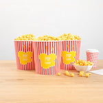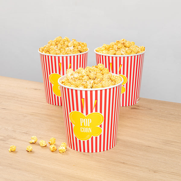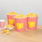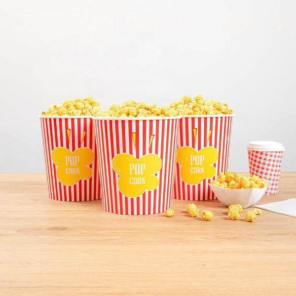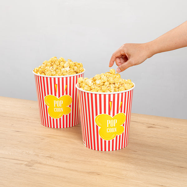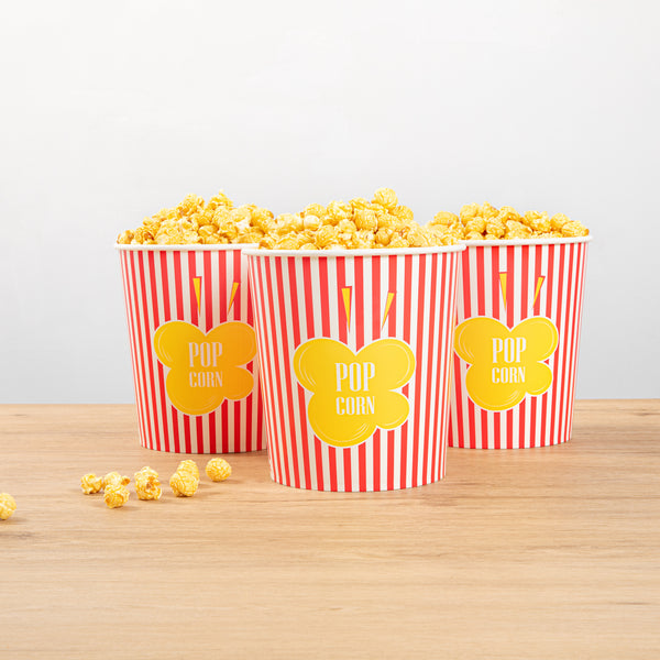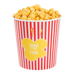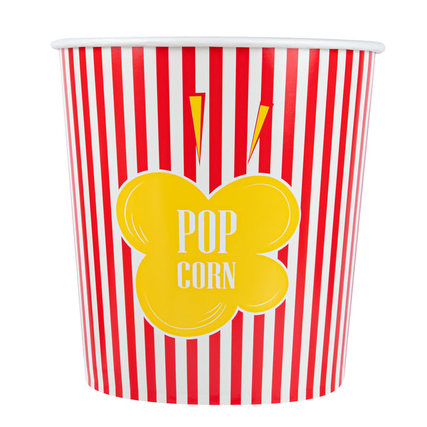 Deliver an authentic cinema experience with ease. The Bio Tek Greaseproof Disposable Popcorn Bucket, designed for optimal performance, features a greaseproof coating that ensures your popcorn stays fresh and your customers' hands stay clean, making it an ideal choice for any disposable popcorn bucket need. Crafted from recyclable paper, this bucket supports eco-friendly practices, reducing your business's environmental impact while still providing the durability necessary for a reliable serving experience. With a large 130-ounce capacity, this bucket is a perfect fit for serving generous portions of popcorn, minimizing the need for frequent refills and enhancing operational efficiency with its large popcorn container design. Its classic striped print elevates the presentation, creating a cinematic ambiance that delights guests and enhances their movie theater popcorn bucket experience. Its dimensions of 7.36 inches in length, 7.36 inches in width, and 7.6 inches in height ensure ample space and a sturdy structure. Elevate your concession stand or theater offerings with this essential popcorn bucket. Each order includes 100 Bio Tek Greaseproof Disposable Popcorn Buckets.