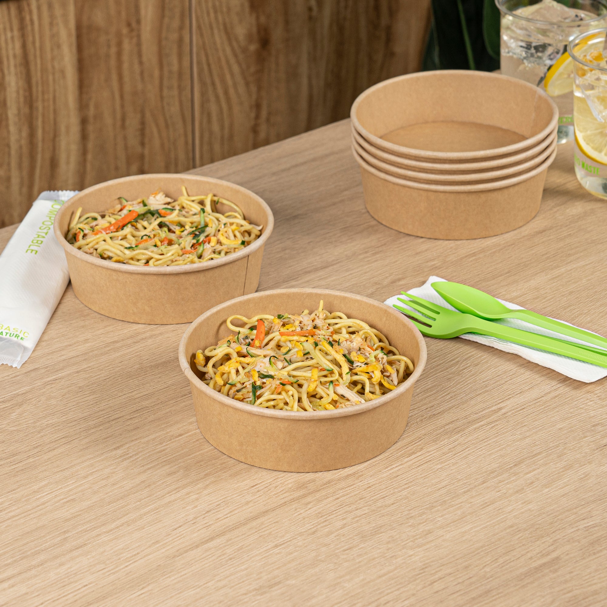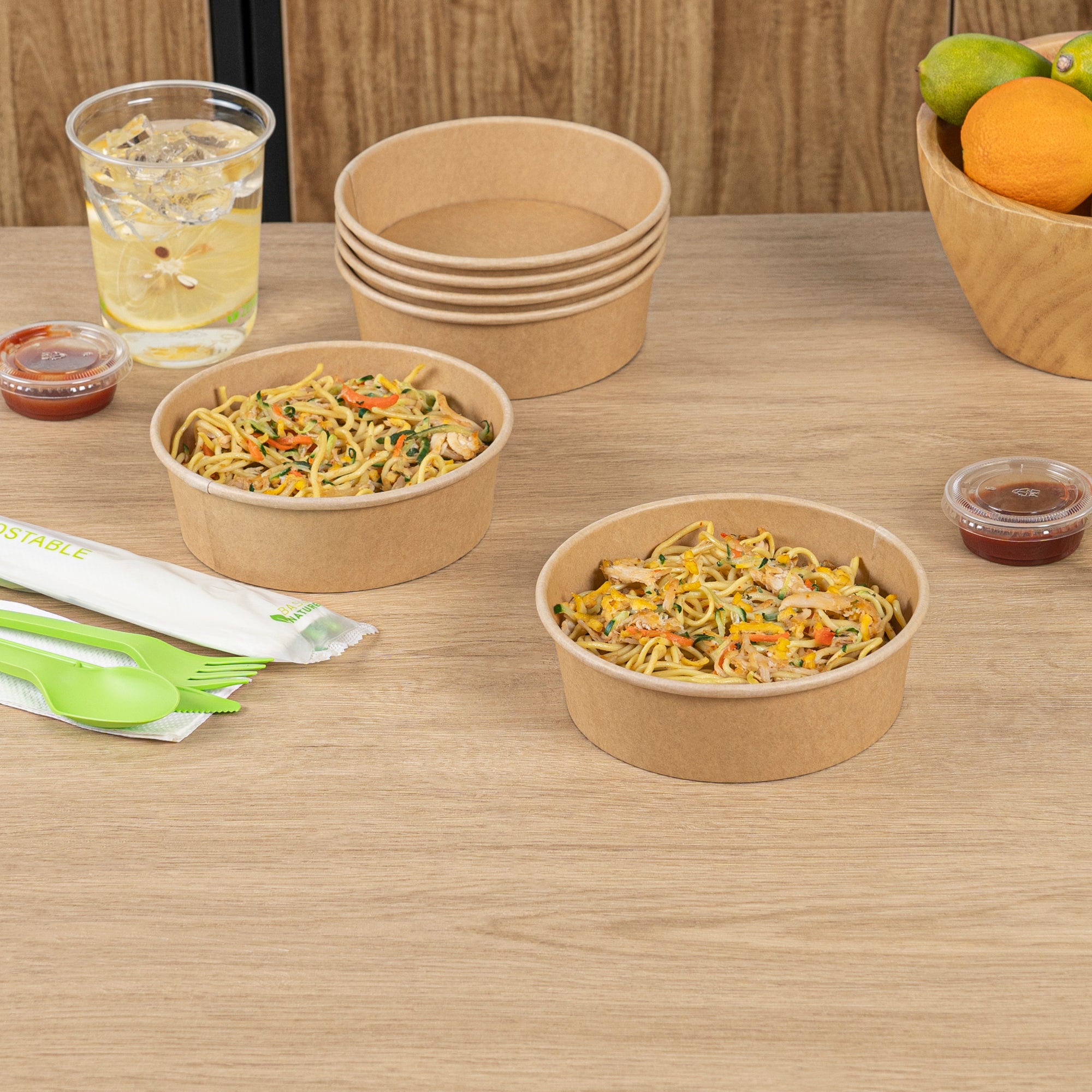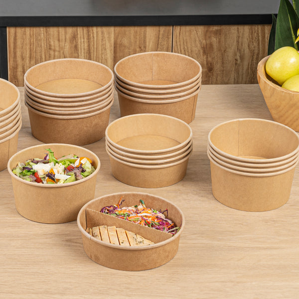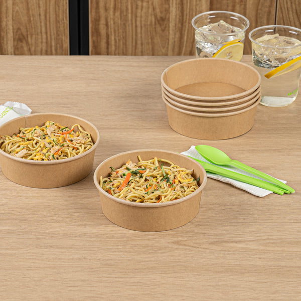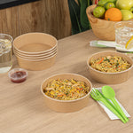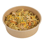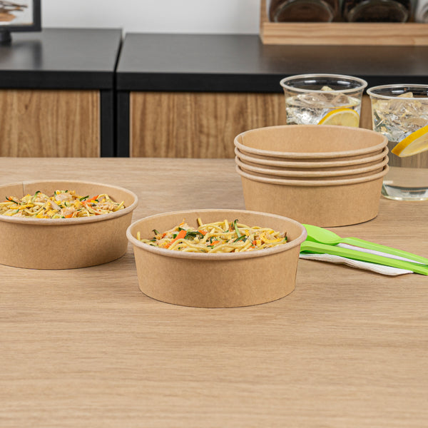 Enhance your foodservice operations with our Bio Tek 17-ounce Round Kraft Paper Take Out Containers. Pair these takeaway containers with their coordinating plastic lids (SKU: RWA1436C) to protect your culinary creations in transit. The grease-resistant design of these paper take out containers prevents sauces and grease from soaking through and ensures a neat food presentation. These take out food containers have a PP lining, making them microwave-safe and can withstand high temperatures up to 248F. Made from thick kraft paper, these to go containers are suitable for holding various hot and cold food items. The rustic kraft finish of these carry out containers creates a charming look for your take out orders. These disposable food containers are recyclable and ideal for showcasing your eco-conscious practices to your patrons. For an easy cleaning experience, these take out boxes are disposable and can be disposed of after use. These containers measure 6 inches in diameter by 1.75 inches in height and can hold up to 17 ounces. Sold in a 200 count box. Lids are available and sold separately.