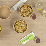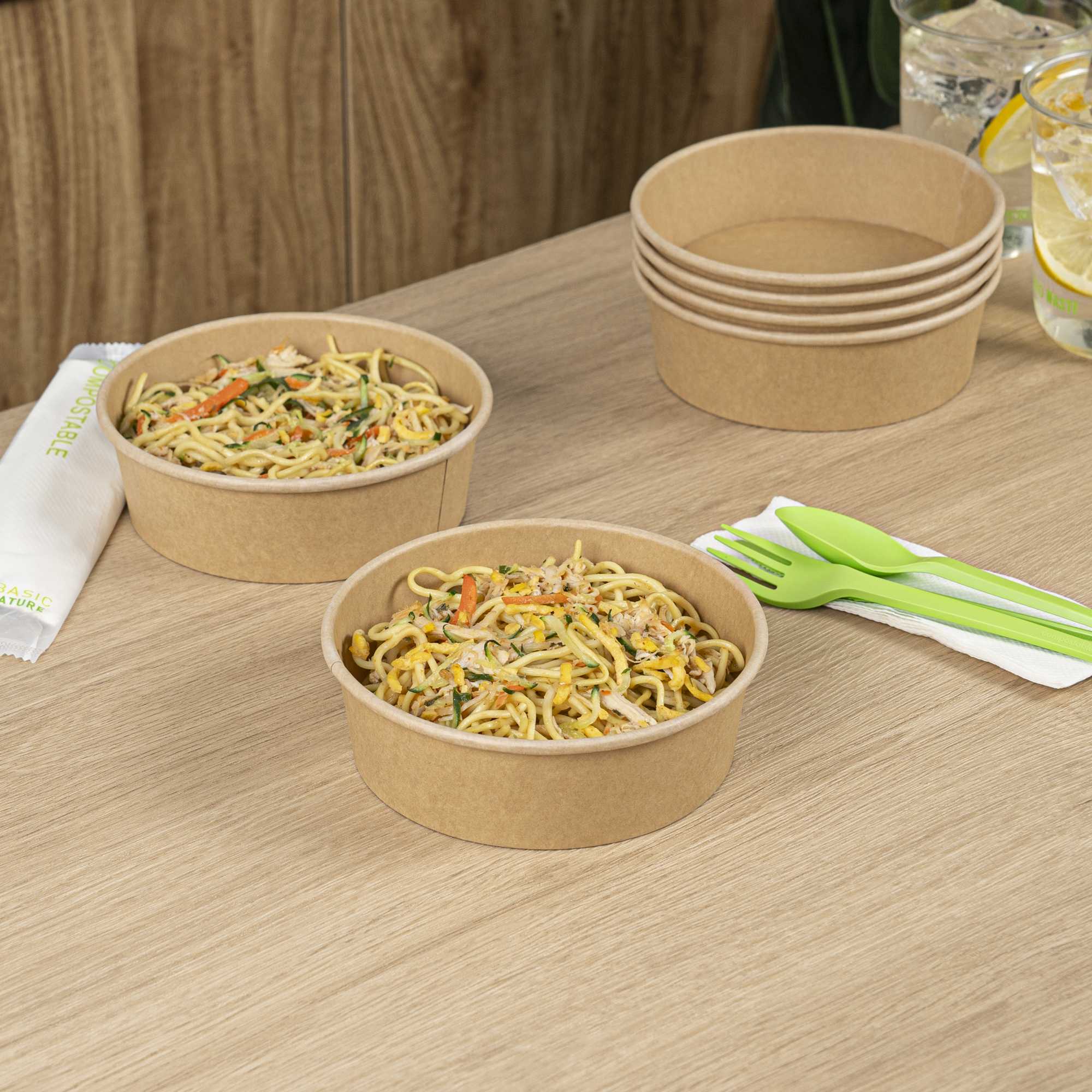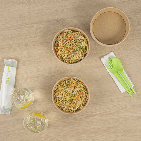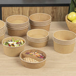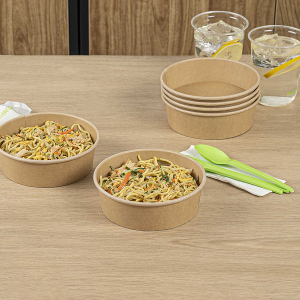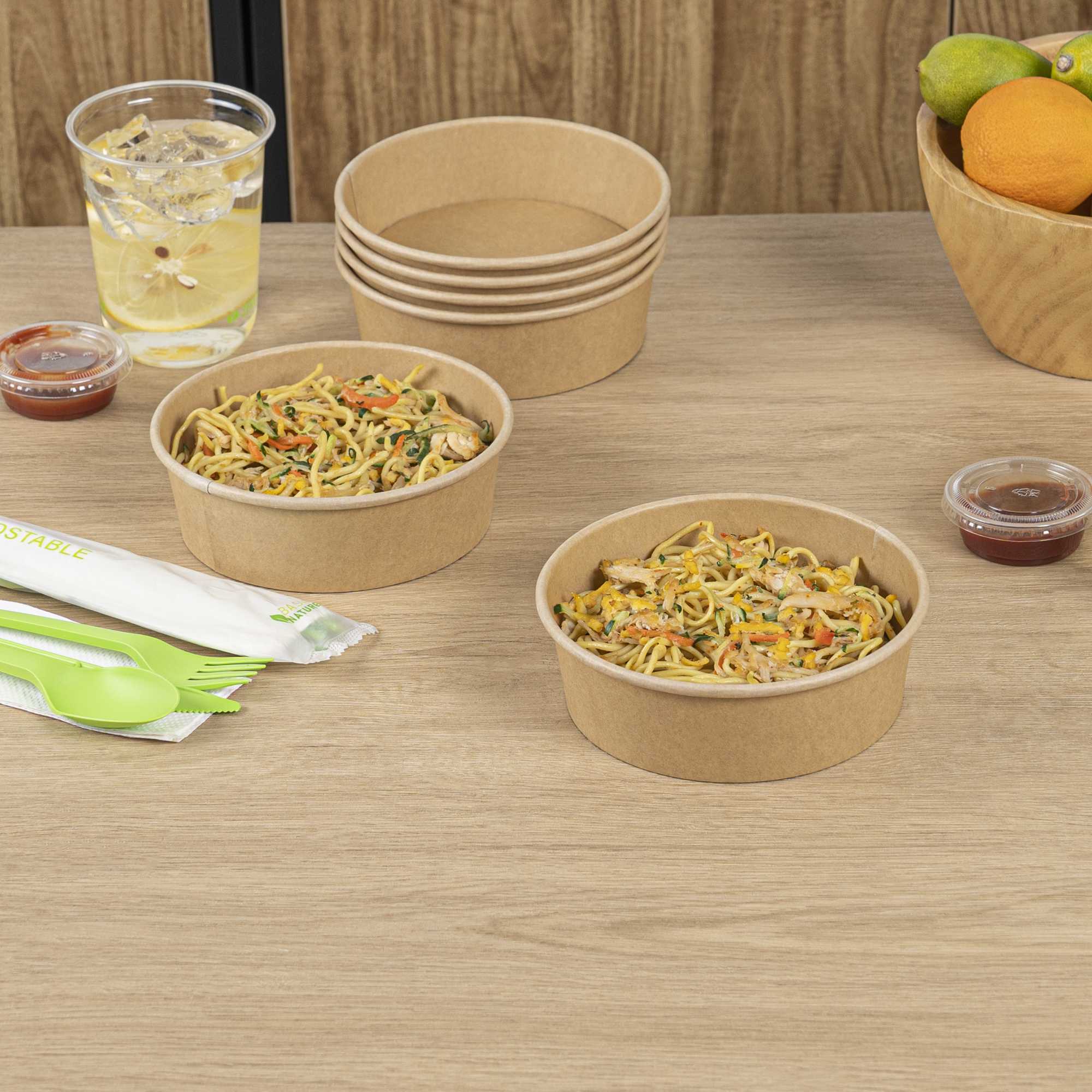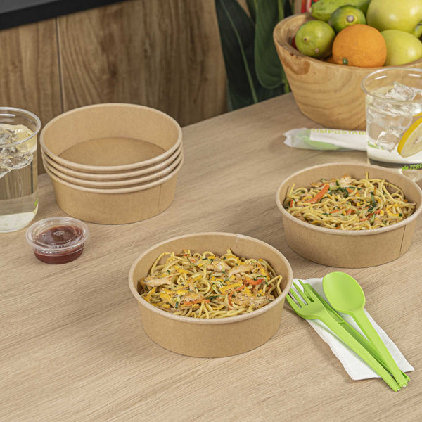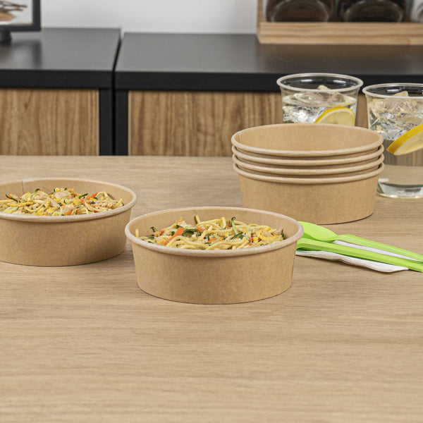 Enhance your foodservice operations with our Bio Tek 17-ounce Round Kraft Paper Take Out Containers. Pair these takeaway containers with their coordinating plastic lids (SKU: RWA1436C-50) to protect your culinary creations in transit. The grease-resistant design of these paper take out containers prevents sauces and grease from soaking through and ensures a neat food presentation. These take out food containers have a PP lining, making them microwave-safe and can withstand high temperatures up to 248F. Made from thick kraft paper, these to go containers are suitable for holding various hot and cold food items. The rustic kraft finish of these carry out containers creates a charming look for your take out orders. These disposable food containers are recyclable and ideal for showcasing your eco-conscious practices to your patrons. For an easy cleaning experience, these take out boxes are disposable and can be disposed of after use. These containers measure 6 inches in diameter by 1.75 inches in height and can hold up to 17 ounces. Sold in a 50 count box. Lids are available and sold separately.