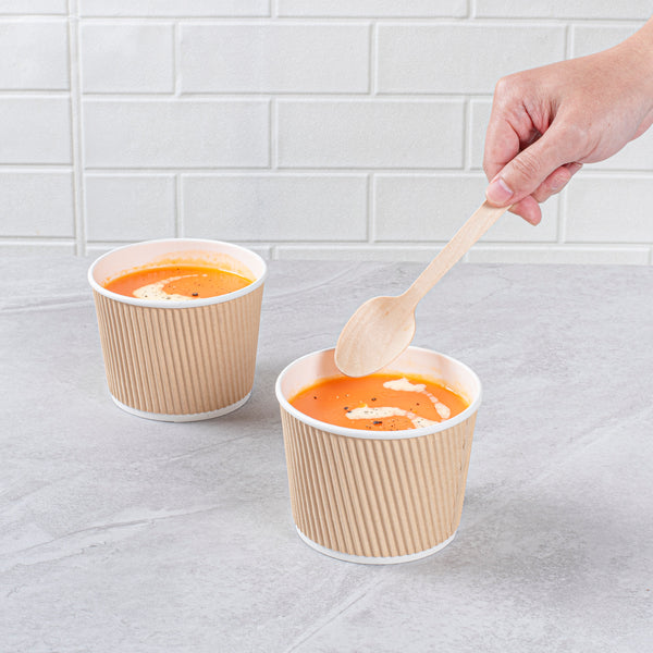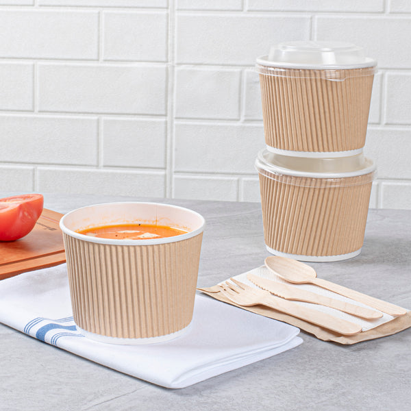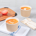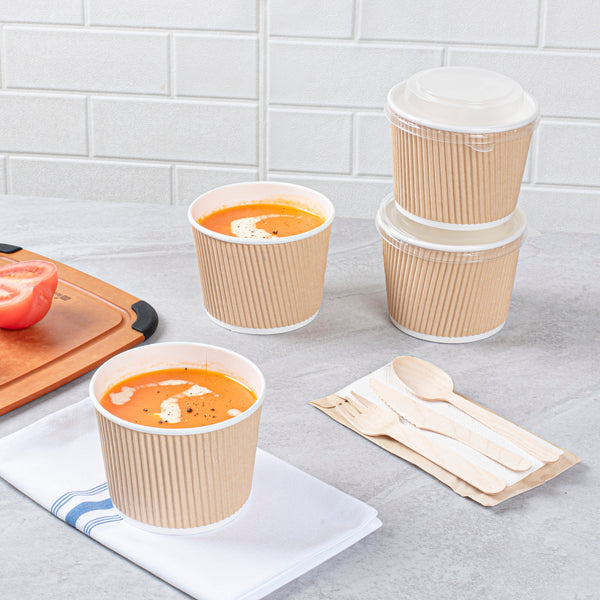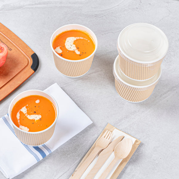 Ensure safe transport of soups with spillproof containers. Bio Tek Kraft Paper Disposable Soup Bowls feature a ripple wall design and tightly rolled rims, guaranteeing durability and maintaining product integrity during transit, making them ideal disposable soup bowls for foodservice. These bowls become spillproof when paired with compatible lids, providing worry-free transport of hot soups and stews, essential for any takeout soup container. Measuring 3.5 inches in diameter and 3.31 inches in height, these bowls are hot and cold food friendly, perfectly suited to contain both steaming soups and chilled broths, accommodating diverse menu items. Crafted from kraft paper with a PE lining, they enhance durability and prevent leaks, ensuring reliable use in high-volume settings. Their stackable design allows for efficient storage in busy kitchens, optimizing space without compromising accessibility. Enhance your takeout service with these reliable paper soup cups, ensuring customer satisfaction with every order. Each order includes 200 Bio Tek Kraft Paper Disposable Soup Bowls.