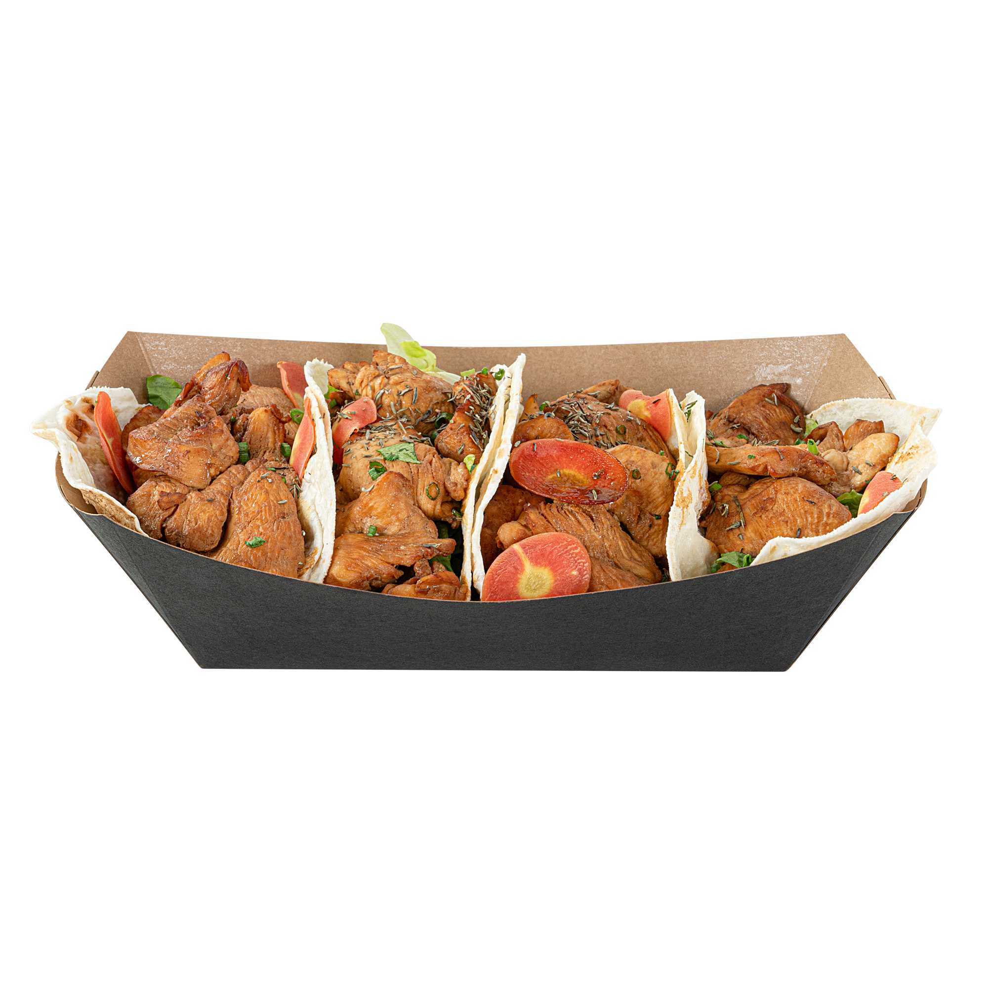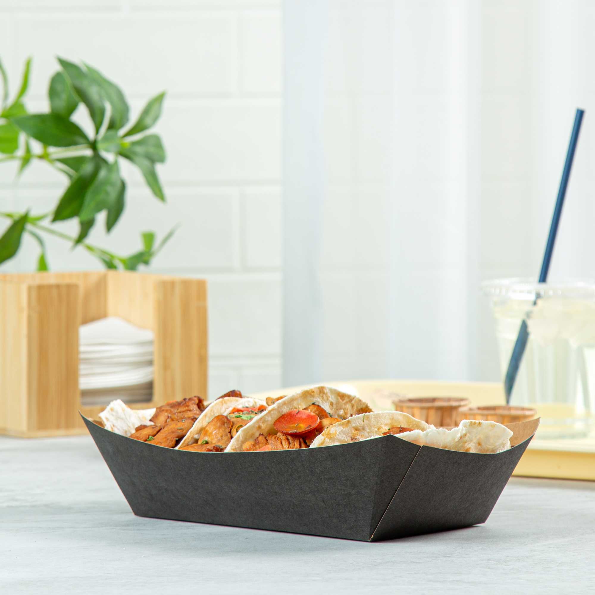 These paper food boat trays have an ultra-portable design to easily serve meals. Ideal for food trucks, family parties, and catering companies!