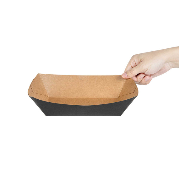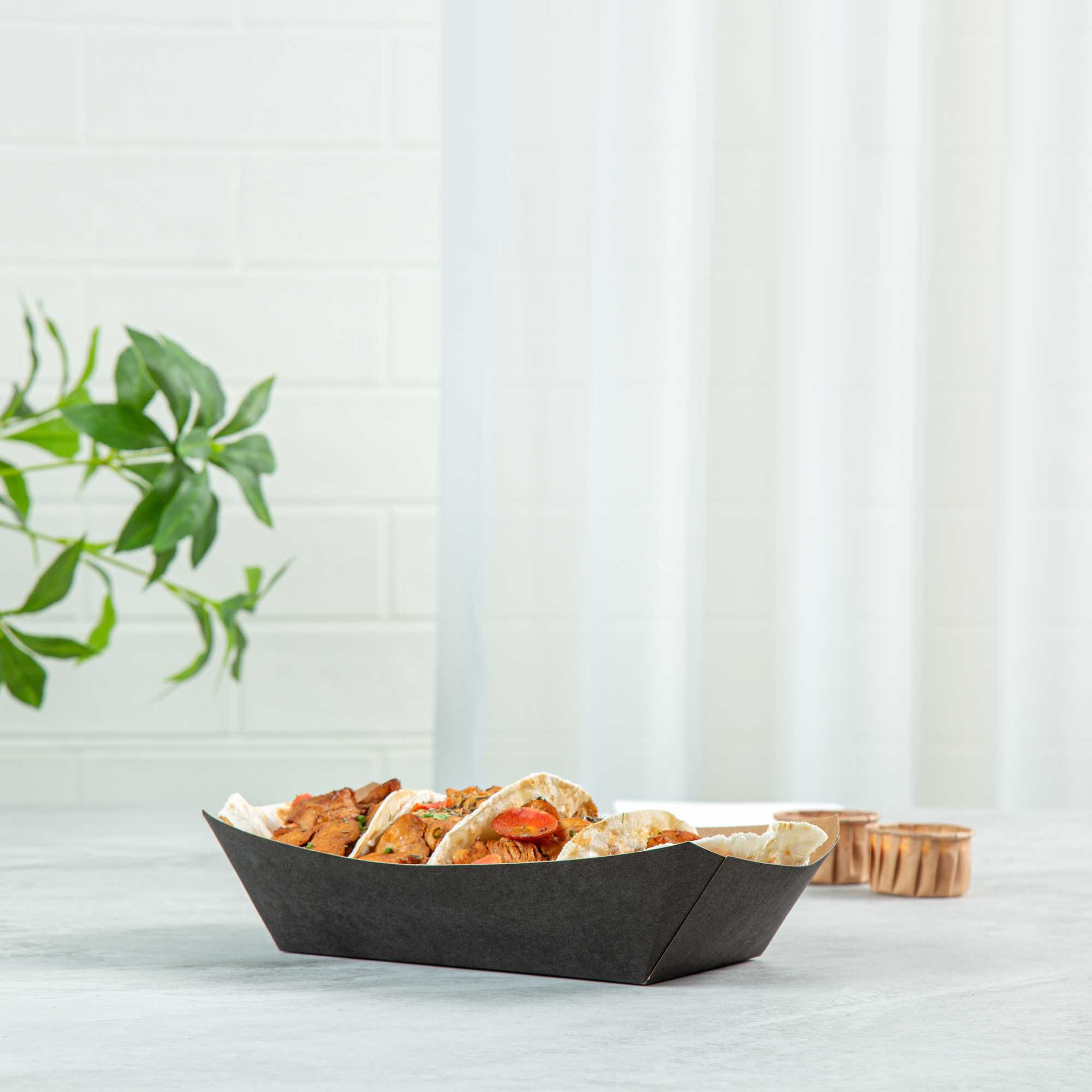 Discover a new level of sustainable elegance with our Bio Tek 2-pound Black Paper #200 Food Tray / Boats. Skillfully crafted from sustainable paper, these black trays add a touch of refinement to your culinary displays. Designed to accommodate substantial portions, these 2-pound sturdy trays are ideal for satisfying appetites. Enhanced with a greaseproof lining, they're perfectly suited for dishes enriched with oil or moisture. Whether you're serving burgers, lobster rolls, Caesar salads, or chicken wings, these #200 paper food trays redefine convenience for take-away dining. Each of these paper food trays measures 6.5 inches long by 3.75 inches wide at the base and 9 inches long by 5.25 inches wide at the top. Sold in a 200 count box.