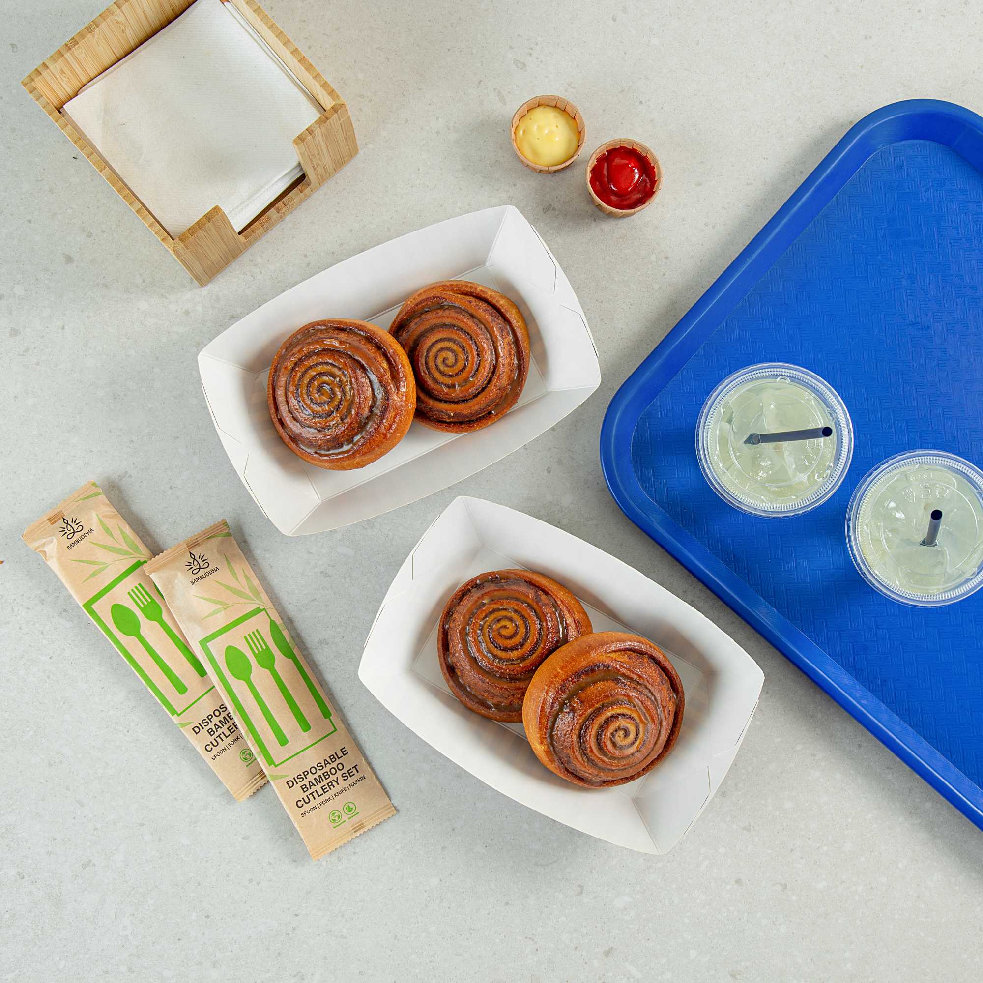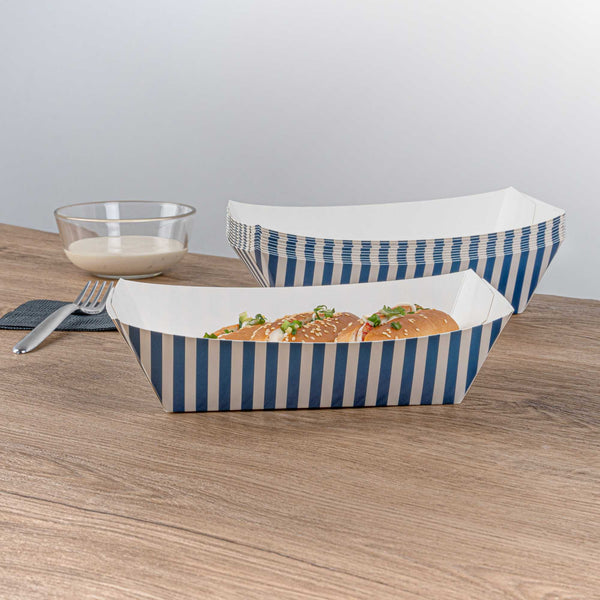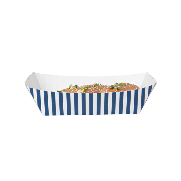 Introduce your fare with eco-friendly panache using our Bio Tek 2-pound Blue and White Stripe Paper #200 Food Tray / Boats. Made from high-quality kraft paper, these striped cardboard trays infuse a touch of rustic charm to your appetizers, main courses, or desserts. The reliable construction of these serving trays are great to accommodate sizable portions of delightful recipes. Featuring a greaseproof lining, these food baskets effectively tackles any oily or fatty foods. With an easy-to-hold style, these disposable food trays are excellent for dishing out hamburgers and lobster rolls accompanied by french fries or substantial Caesar salads and crunchy chicken wings! These #200 paper food containers ensure a neat and easy solution for guests to carry your culinary creations to-go. Each food tray measures 9 inches long by 6.75 inches wide at the top and 6.62 inches long by 3.87 inches wide by 2.62 inches tall at the base. Sold in a 200 count box.
