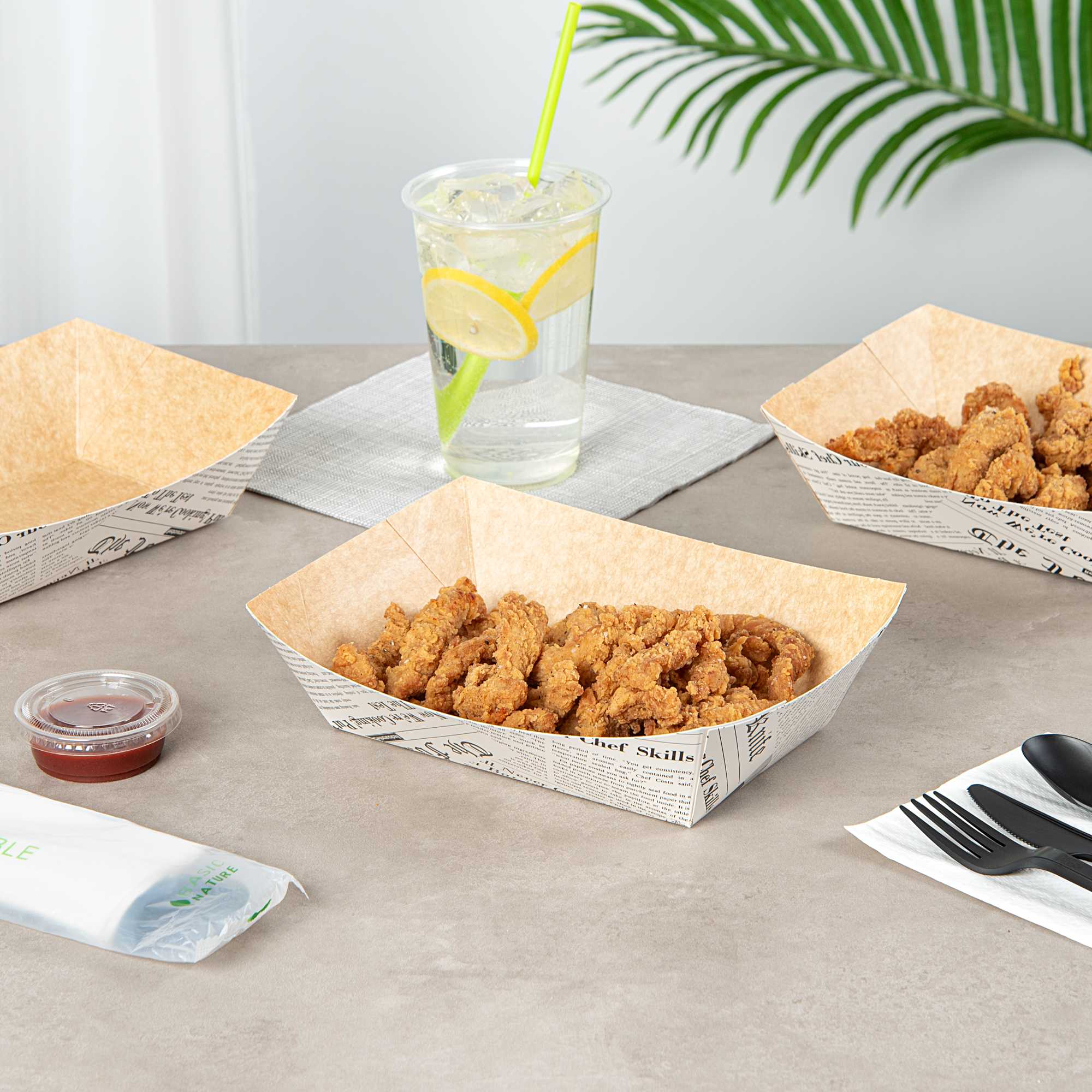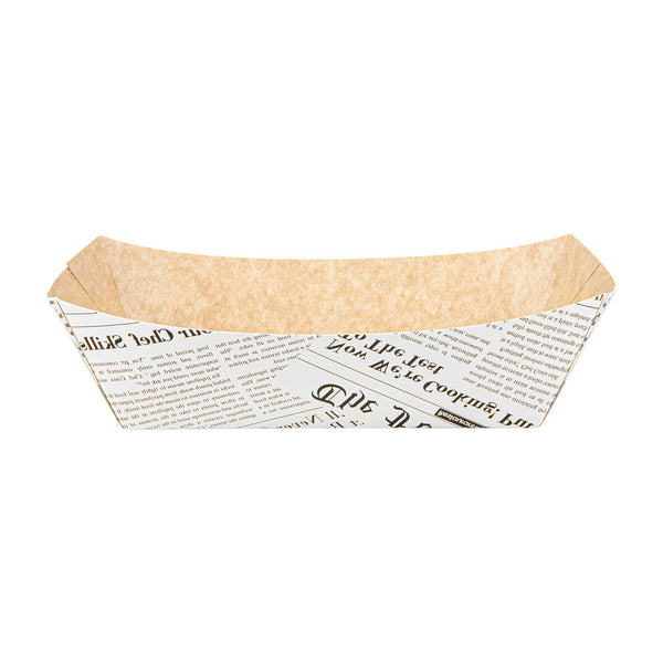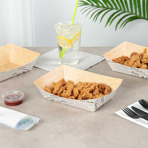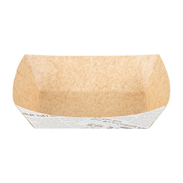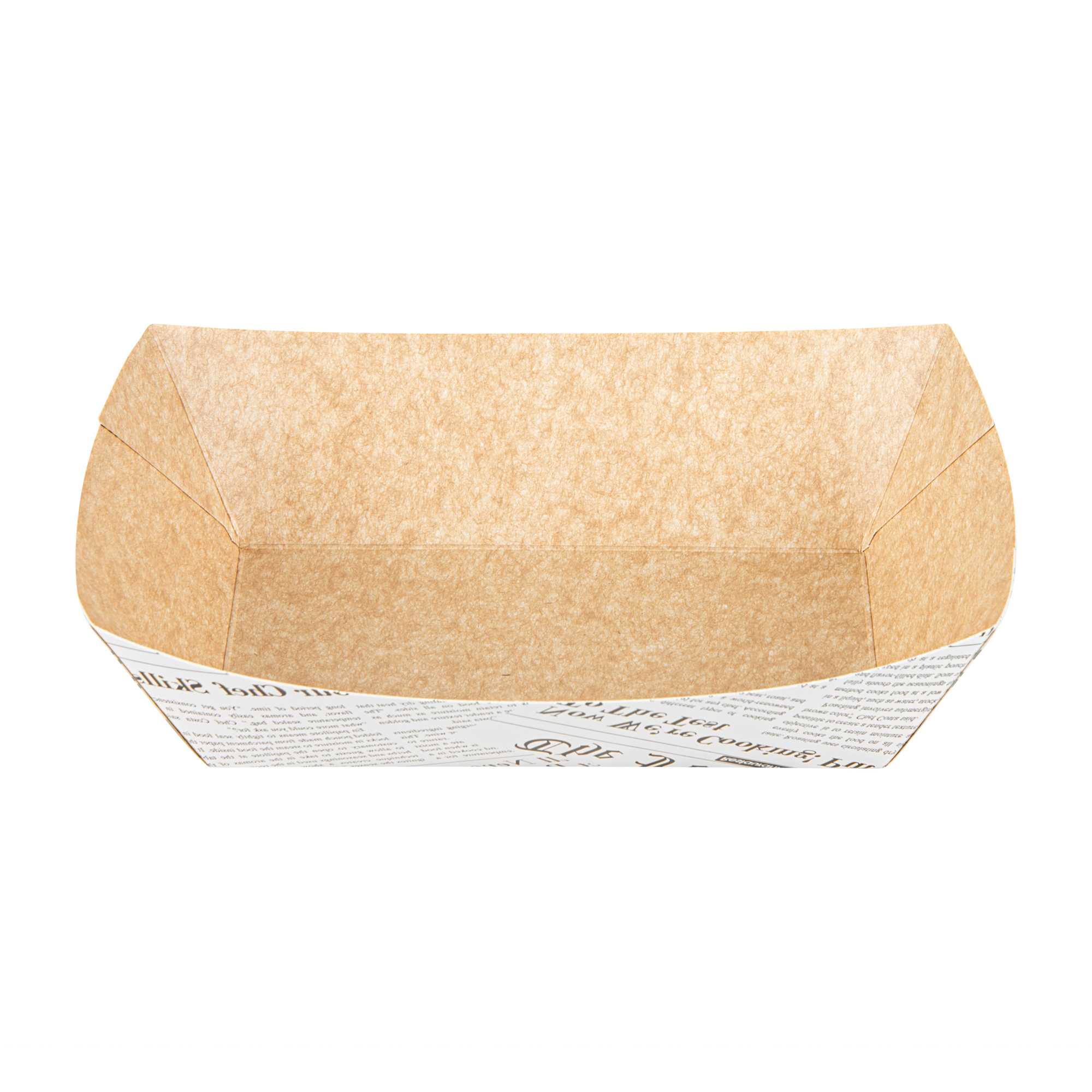 Enhance your food presentation with versatile kraft paper food trays. The Bio Tek 2 lb Newsprint Paper #500 Food Tray / Boat features a hot food-friendly design, making it perfect for serving meals and entrees without compromising the structural integrity of the tray. Made from 300g kraft paper with a PE coating, these disposable food trays prevent leaks and sogginess, ensuring your dishes remain appetizing during transport. Measuring 8.86 inches in length by 6.69 inches in width by 2.36 inches in height, this street food container is ideal for both hot and cold dishes, including salads and chilled desserts, making it a valuable addition to foodservice operations. The recyclable design supports eco-conscious practices, aligning with the sustainability goals of modern foodservice businesses. Integrate these trays into your catering supplies to impress customers with both functionality and style. Each order includes 200 Food Trays.