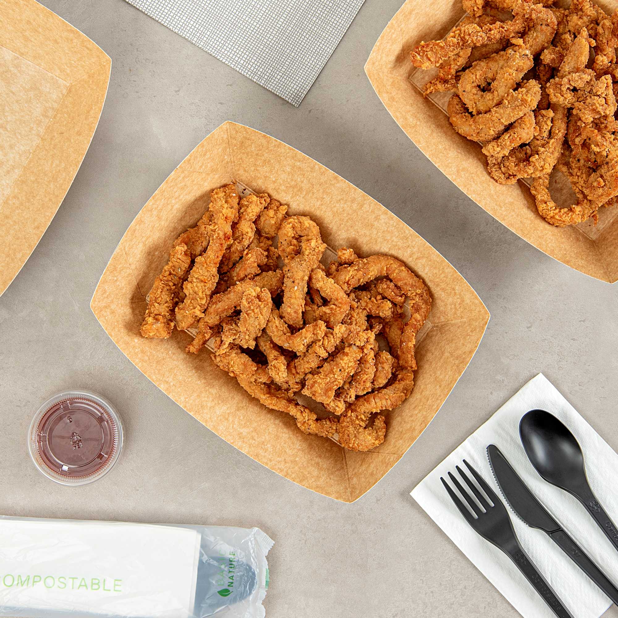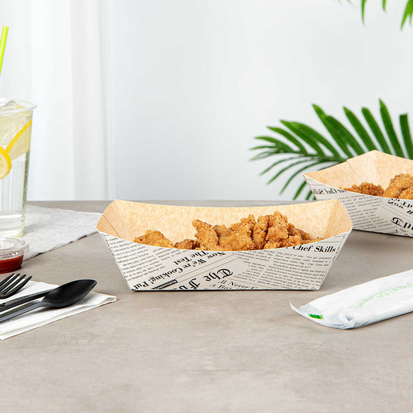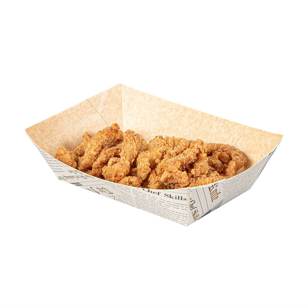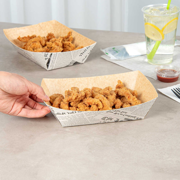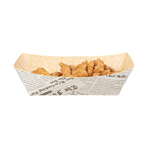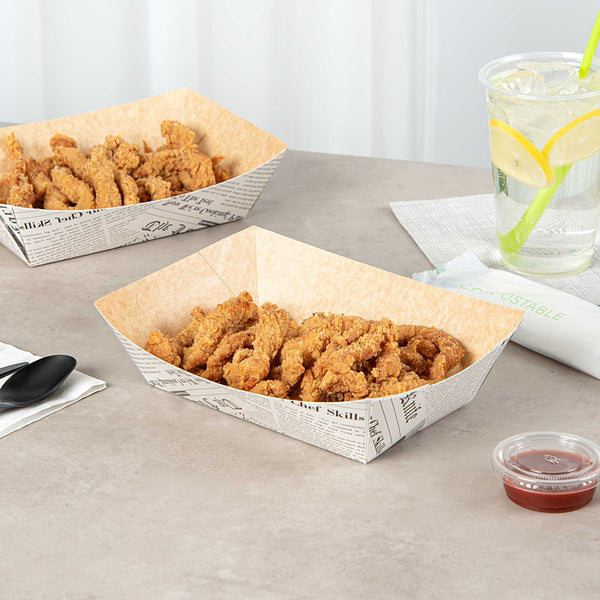 Enhance your food presentation with versatile kraft paper food trays. The Bio Tek 2 lb Newsprint Paper #500 Food Tray / Boat features a hot food-friendly design, making it perfect for serving meals and entrees without compromising the structural integrity of the tray. Made from 300g kraft paper with a PE coating, these disposable food trays prevent leaks and sogginess, ensuring your dishes remain appetizing during transport. Measuring 8.86 inches in length by 6.69 inches in width by 2.36 inches in height, this street food container is ideal for both hot and cold dishes, including salads and chilled desserts, making it a valuable addition to foodservice operations. The recyclable design supports eco-conscious practices, aligning with the sustainability goals of modern foodservice businesses. Integrate these trays into your catering supplies to impress customers with both functionality and style. Each order includes 200 Food Trays.