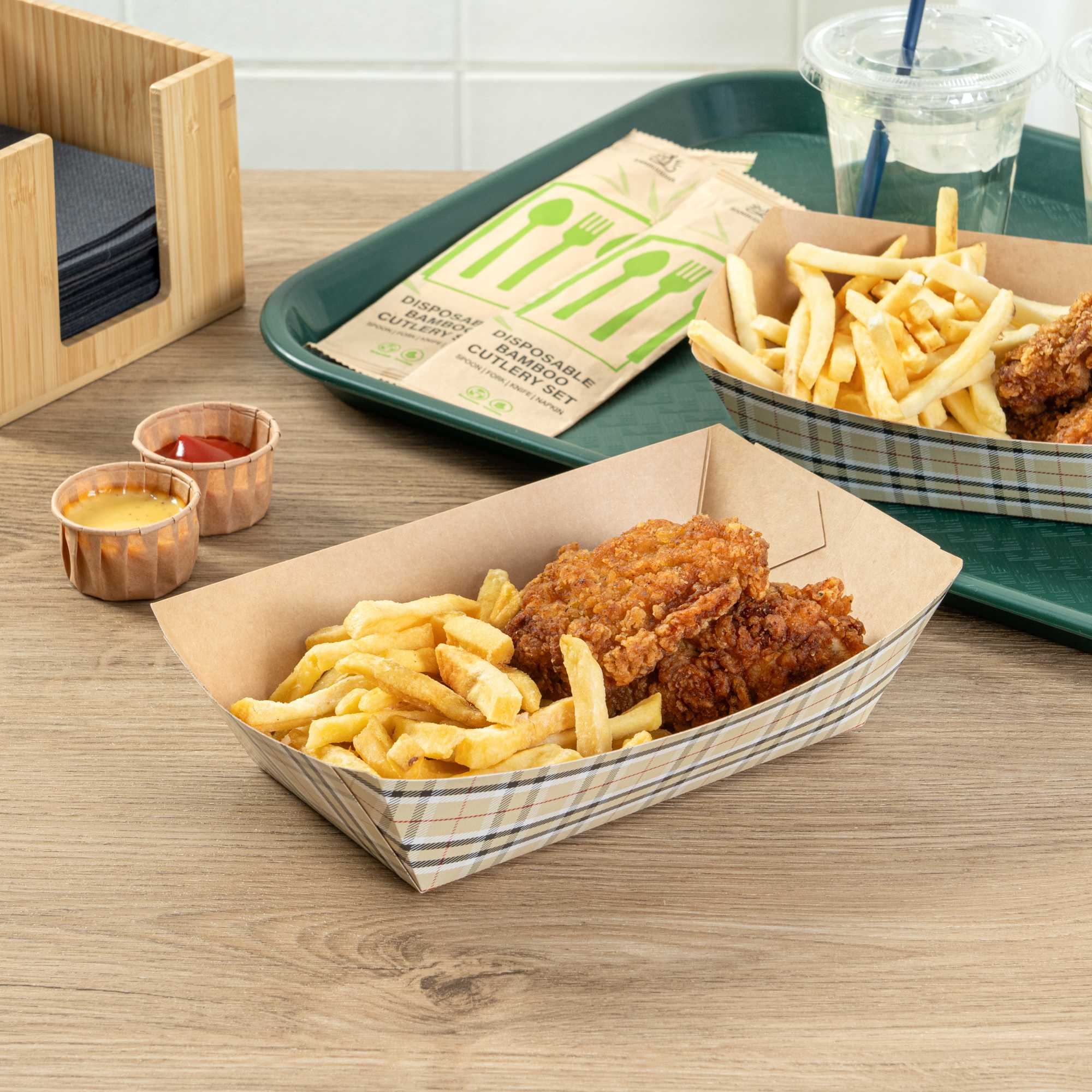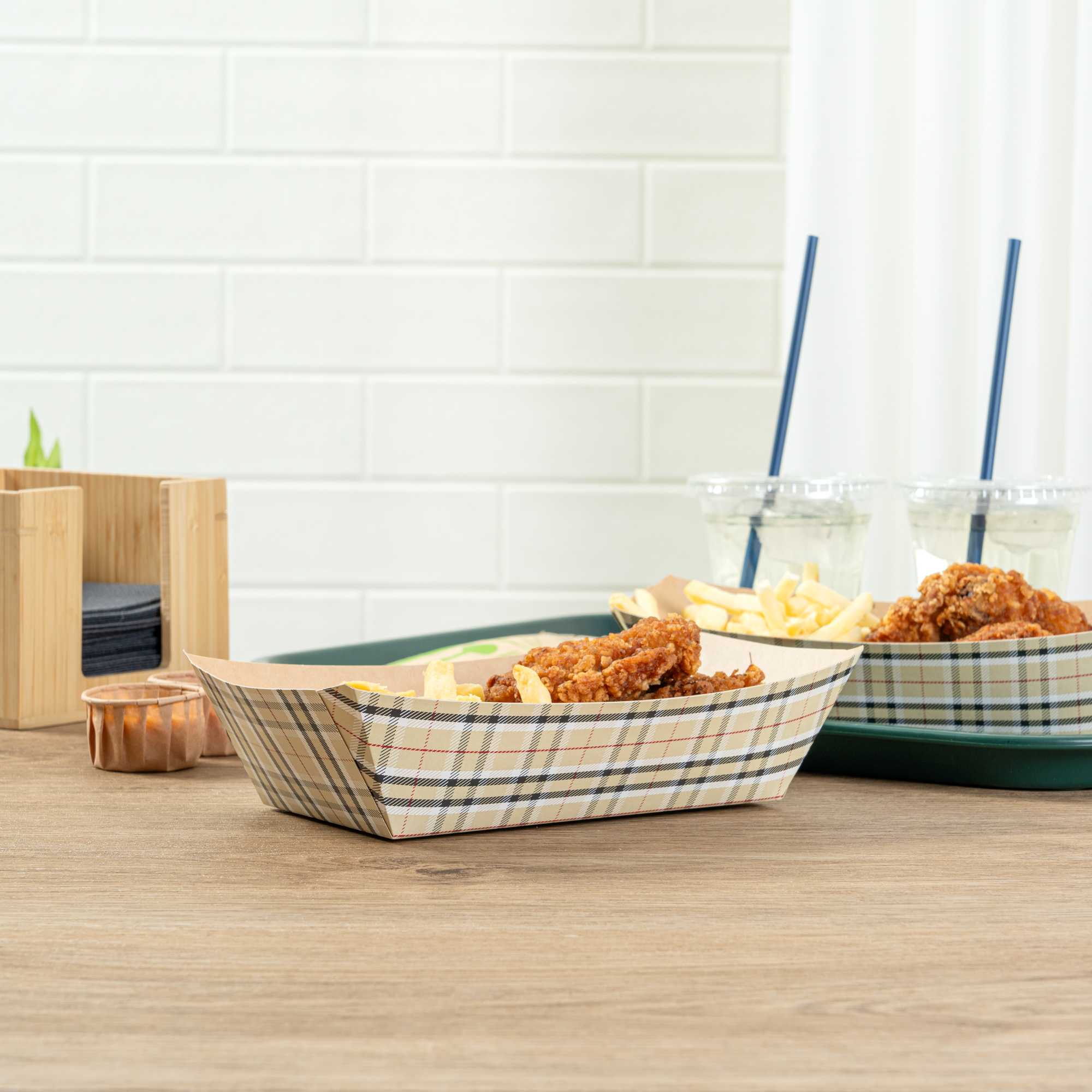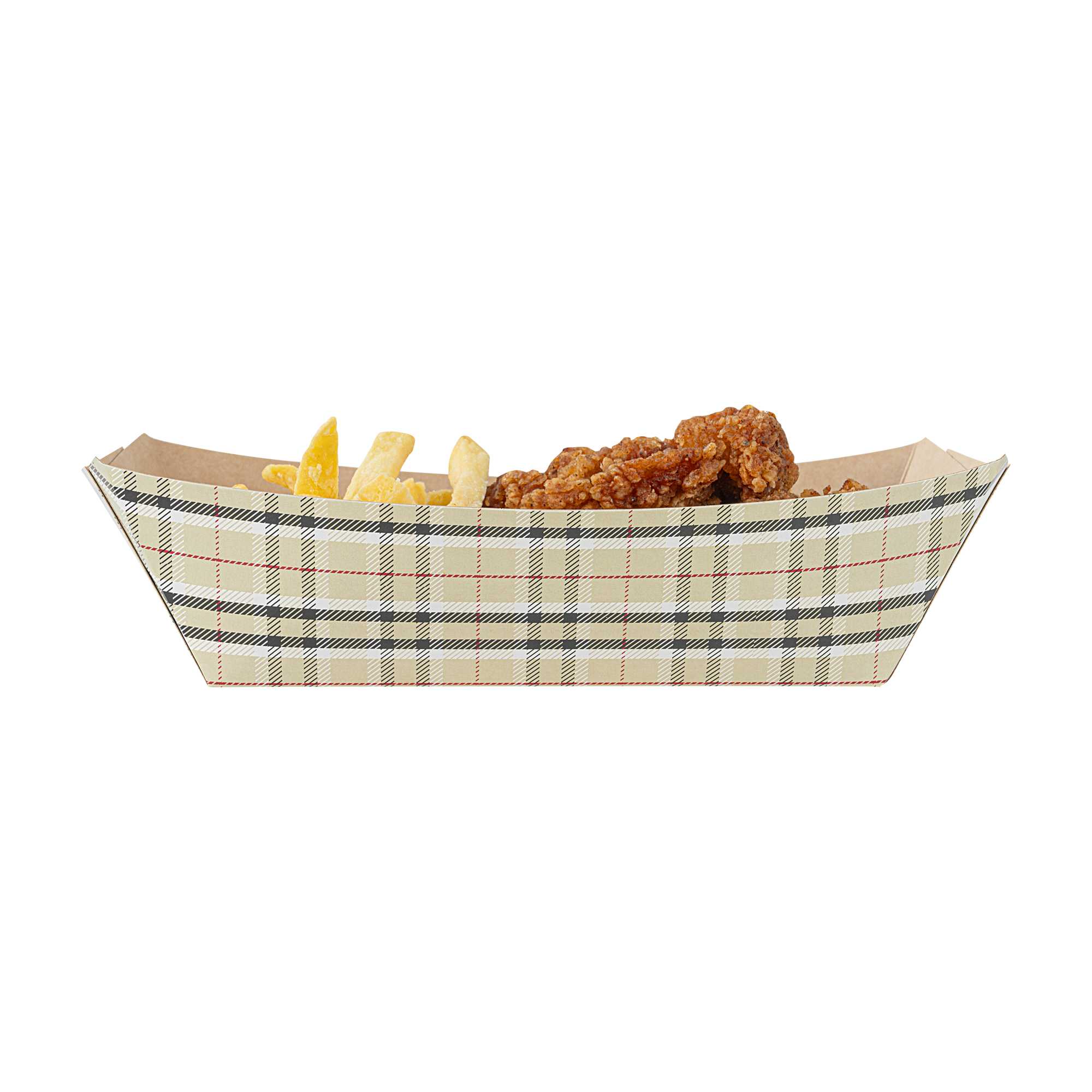 Present your dishware in style using our Bio Tek 2-pound Plaid Paper #200 Food Tray / Boats. Crafted from kraft paper, these plaid cardboard food trays add a charming aesthetic touch to any appetizer, main course, or dessert. The durable construction of these food baskets can comfortably handle the weight of sumptuous items, while the greaseproof lining effectively combats oily or overly rich foods. The handy design of these disposable food boats makes them perfect for serving items such as burgers or lobster rolls with side dishes or even generously portioned salads or savory chicken wings! These #200 paper boats are disposable for an easy cleaning experience. Each snack tray measures 6.5 inches long by 3.75 inches wide by 2.25 inches tall. Shipped in a 50 count box.