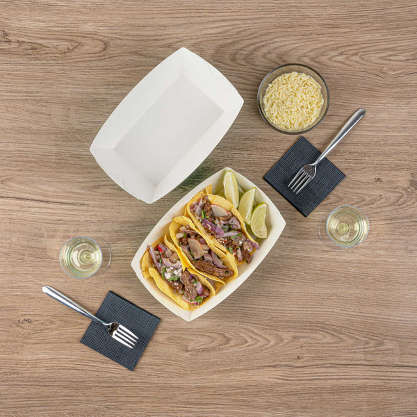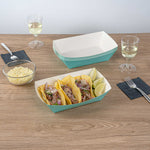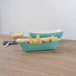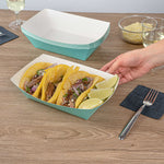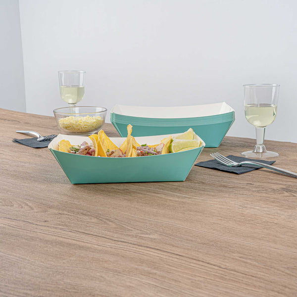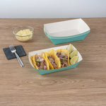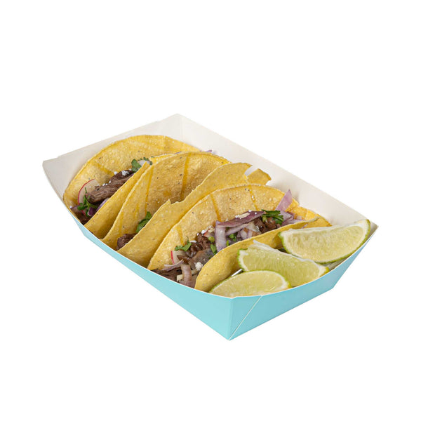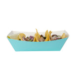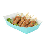 Showcase your dishes sustainably with our Bio Tek 2-pound Turquoise Paper #200 Food Tray / Boats. Crafted from premium paper, these vibrant turquoise trays add a pop of color to your appetizers, mains, or desserts. The sturdy construction of these food baskets are built to handle large servings of your delicious fare, while the greaseproof lining helps manage oily or fatty foods. These snack boats have an easy-to-hold design that is ideal for serving combo meals or sizable salads and fried treats. For a quick cleaning experience, these #200 paper boats are disposable. Each snack boat measures 6.5 inches long by 3.75 inches wide by 2.25 inches tall. Shipped in a 200 count box.
