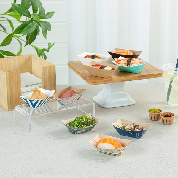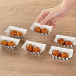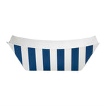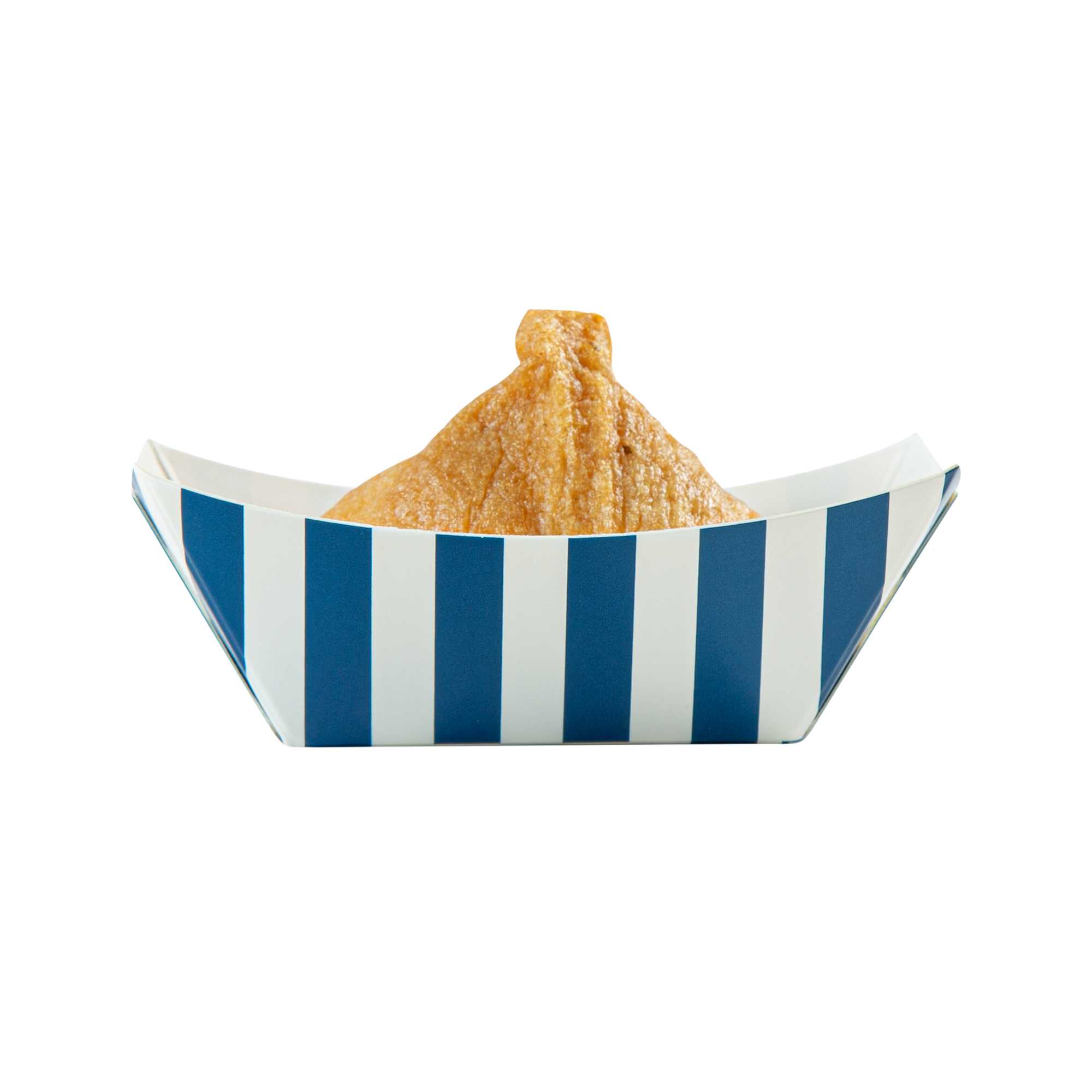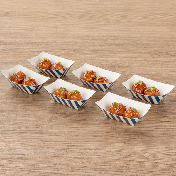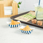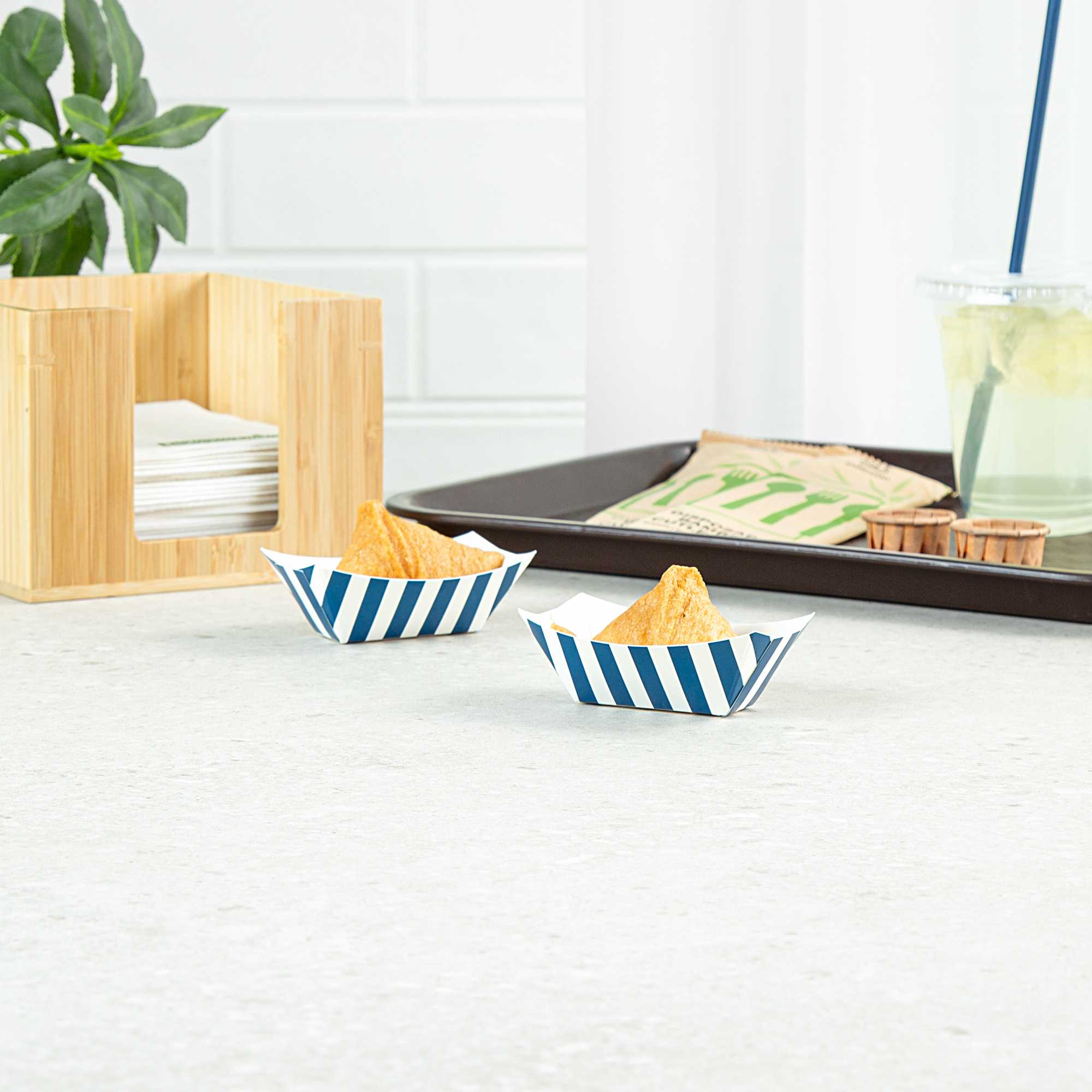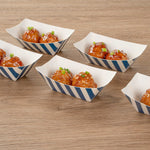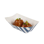 Serve your famous appetizers, snacks, or desserts with our Bio Tek 2-ounce Blue and White Stripe Paper Food Tray / Boats. Featuring a greaseproof lining, these paper food trays are built to hold greasy and oily food without getting soggy to ensure your customers can comfortably enjoy their meals. Constructed from eco-friendly paper, these disposable food trays are conveniently recyclable to allow your employees to streamline their cleaning process at your restaurant, food truck, or cafeteria. These small food boats have a blue and white striped finish to brilliantly complete the look of your bite-sized treats while adding rustic flair to the decor at any establishment. Measuring 3.25 inches long by 2.25 inches wide by 1.25 inches tall, these durable food trays have a capacity of 2 ounces and are great for serving cookies, pastries, meatballs, and other dishes. Sold in a 400 count box.