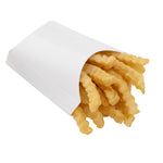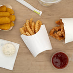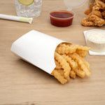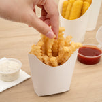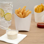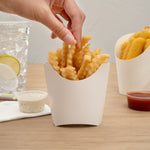 Efficiently serve mouthwatering fries using our Bio Tek White Paper Fry Cups / Snack Containers. These fry cups, lined with a greaseproof layer, effectively impede oils from soaking in and creating residue. With an angled rim, these fry scoop cups are perfect for scoping fried snacks directly into the cup. Made from first-rate paper, these fry scoops allow customers to comfortably carry delicious hot snacks on the move. Exhibiting a clean, white finish, these paper cups contribute a classy aesthetic to your snack presentation. Designed for space economy, these fry cups are cheaply stackable and recyclable, favoring easy and green cleanup. Each 2-ounce fry cup measures 4 inches long by 2.75 inches wide by 3.5 inches tall. Sold in a 100 count box.