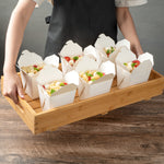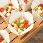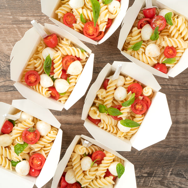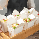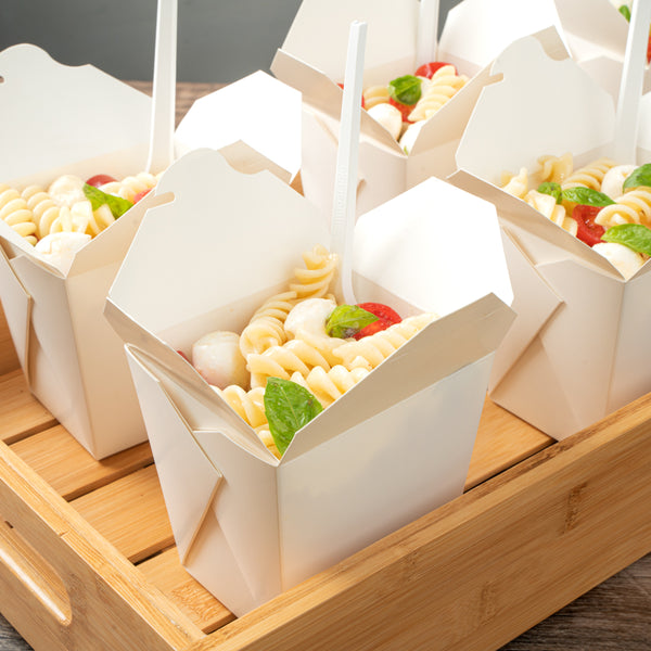 These takeaway boxes are made from thick paper and can easily hold hot and cold foods. Ideal for packing lunches for work!