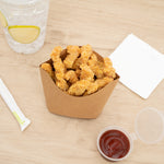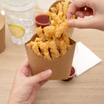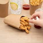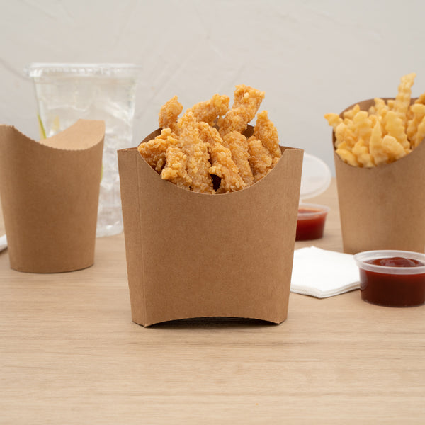Enjoy serving snacks on the go with our Bio Tek Kraft Paper Fry Cups / Snack Containers. These fry scoops feature a greaseproof lining to prevent oil leaks and messes. The wide, angled rim allows for straightforward scoping or filling with a fry scooper. Crafted from high-quality paper, these cups provide protection from hot food. The natural kraft finish imparts an earthy charm to your presentation. These space-efficient paper scoop cups are stackable and recyclable, ensuring a simple and eco-friendly cleanup. Each 3-ounce cup measures 4.5 inches long by 3.25 inches wide by 3.75 inches tall. Sold in a 100 count box.