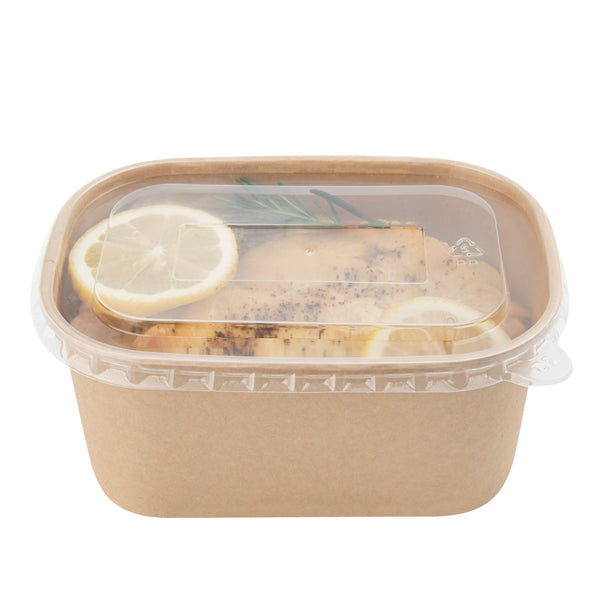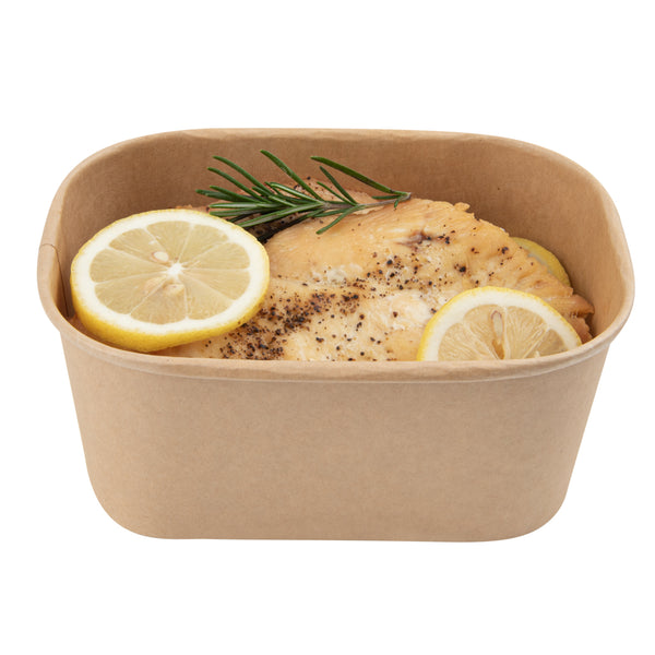 Fill up our Bio Tek 34-ounce Oval Kraft Paper Serving Containers with your delicious meals. Featuring a PE lining, these take out containers are grease-resistant to keep saucy entrees and salads with dressings locked in. Pair these to go food containers with our compatible lids (SKU: RWA1054K and RWA1055C) to securely seal in side dishes and prevent messes during transport. Made from thick kraft paper, these disposable meal prep containers won't easily absorb heat from employees' or customers' hands, making them perfect for cold foods. These take out boxes are freezer-safe for storing prepped meals in your refrigerator. To save space in your storage area, these paper lunch boxes are conveniently stackable. For quick and effortless cleanup at your catered events, these paper food containers are recyclable. Containing up to 34 ounces, these take away containers measure 6.75 inches long by 4.5 inches wide and 3 inches tall. Sold in a 100 count box. Lids are available and sold separately.