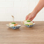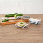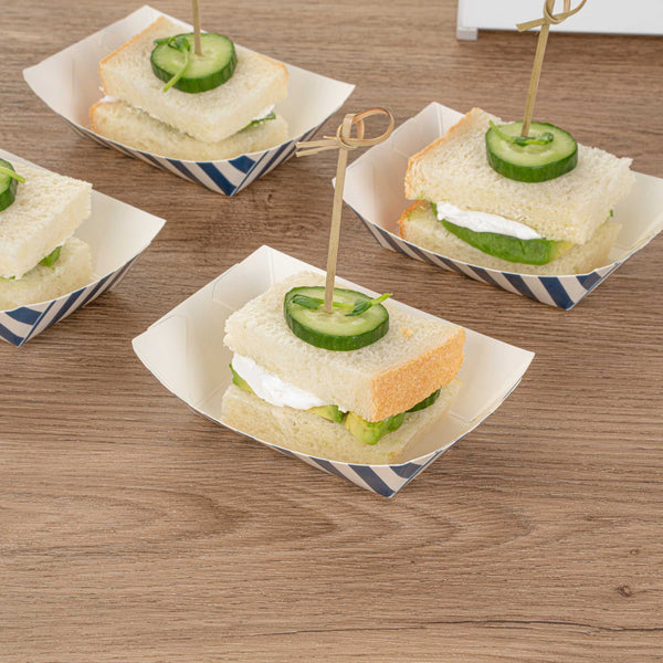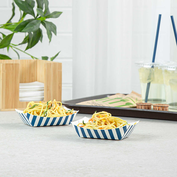 Discover the pinnacle of convenience with our Bio Tek 4-ounce Blue and White Stripe Paper #25 Food Tray / Boats. Crafted from premium, recyclable paper, these cardboard snack trays boast sturdy bases and robust walls, the ideal solution for mess-free indulgence on the move. Serve up delectable side dishes, finger foods, and appetizers with ease using these small paper food trays. After events, these disposable paper food boats facilitate effortless cleaning. Featuring a greaseproof lining, these small food boats conveniently dish out sweet potato fries at your food truck and present appetizers without any unsightly oil splotches. The trendy blue and white striped design enhances the charm, making them a hit at weddings, corporate events, cocktail gatherings, and catered functions. Measuring 3 inches long by 2 inches wide by 1 inch tall, these #25 paper food trays can hold up to 4 ounces. Sold in a 400 count box.