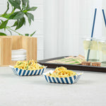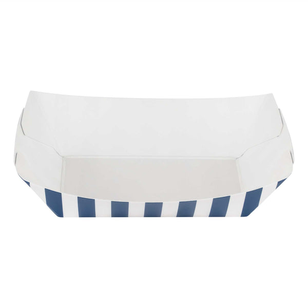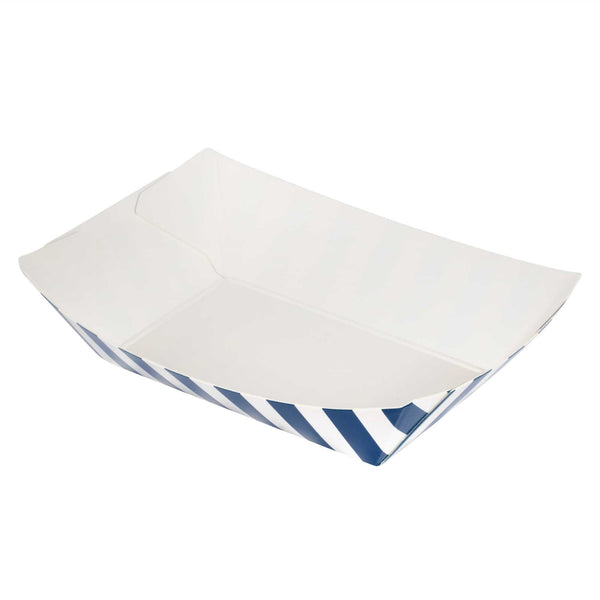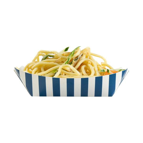 Discover the pinnacle of convenience with our Bio Tek 4-ounce Blue and White Stripe Paper #25 Food Tray / Boats. Crafted from premium, recyclable paper, these cardboard snack trays boast sturdy bases and robust walls, the ideal solution for mess-free indulgence on the move. Serve up delectable side dishes, finger foods, and appetizers with ease using these small paper food trays. After events, these disposable paper food boats facilitate effortless cleaning. Featuring a greaseproof lining, these small food boats conveniently dish out sweet potato fries at your food truck and present appetizers without any unsightly oil splotches. The trendy blue and white striped design enhances the charm, making them a hit at weddings, corporate events, cocktail gatherings, and catered functions. Measuring 3 inches long by 2 inches wide by 1 inch tall, these #25 paper food trays can hold up to 4 ounces. Sold in a 50 count box.