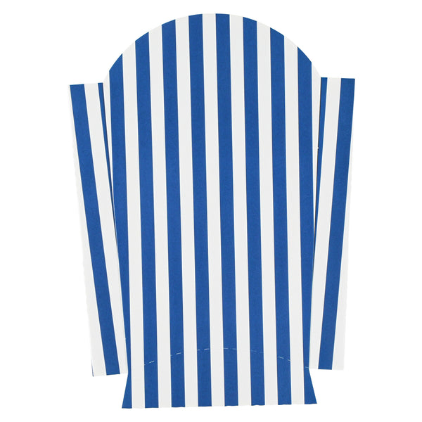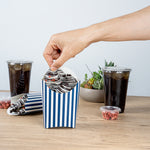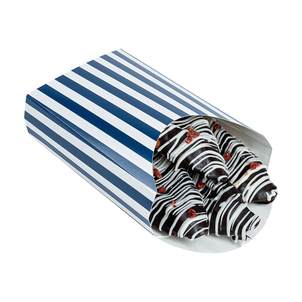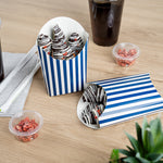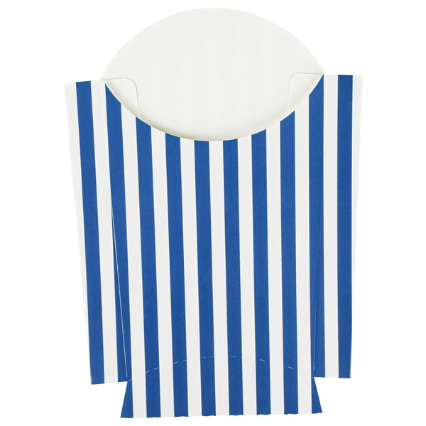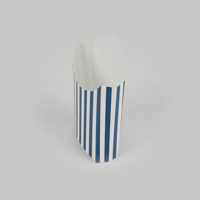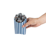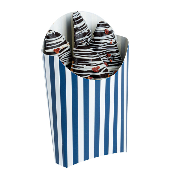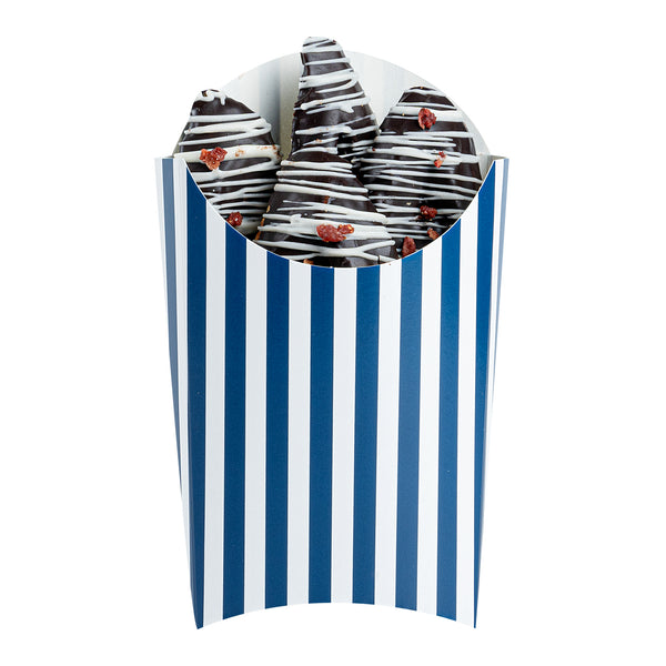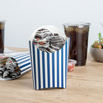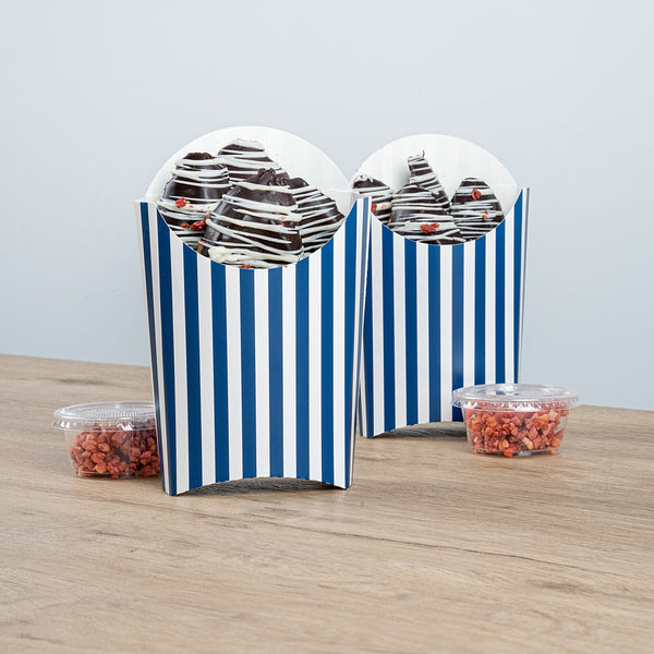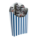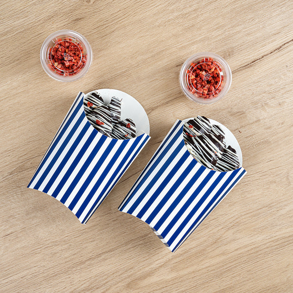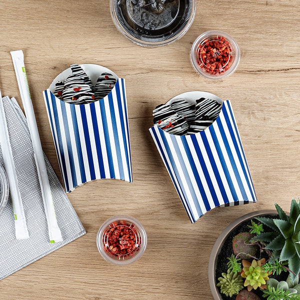 Simplify your snack packing procedures with our Bio Tek Blue and White Stripe Paper Fry Cups / Snack Containers. With a grease-resistant lining, these disposable fry holders securely contain sauces and oils, thus preventing unpleasant leaks. The broad, slanted rim enhances scoping efficiency from popcorn or onion rings bins. Made from robust paper, these cups shield hands from hot contents. The striking blue and white stripe design gives your takeaway packaging an appealing aesthetic. These cups also stack effortlessly reducing packaging time and are disposable for easy cleanup. These 4-ounce cups measures 4.75 inches in length by 3.5 inches in width by 5 inches in height. Sold in a 100 count box.