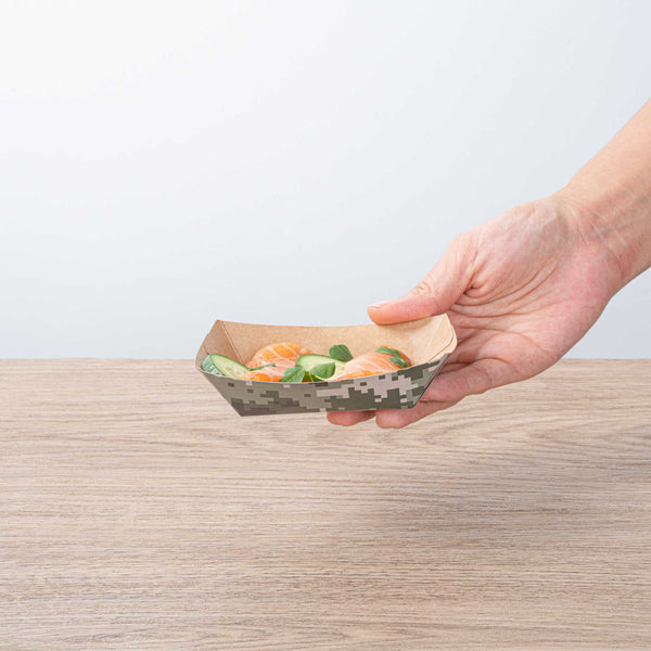 Embark on a journey of convenience with our Bio Tek 4-ounce Camouflage Paper #25 Food Tray / Boats. Crafted from premium greaseproof paper, these cardboard snack trays feature robust bases and sturdy walls, providing an effortless way to relish side dishes, finger foods, and appetizers while on the move. Employ these small paper food trays to effortlessly serve sweet potato fries at your food truck or showcase your restaurant's prized appetizers at tastings. These disposable paper food boats take the hassle out of post-event cleanup. The camouflage design of these premium paper boats adds a unique touch, ensuring their appeal at weddings, corporate luncheons, cocktail affairs, and other catered gatherings. Measuring 3 inches long by 2 inches wide by 1 inch tall, these #25 paper food trays hold up to 4 ounces. Sold in a 400 count box.