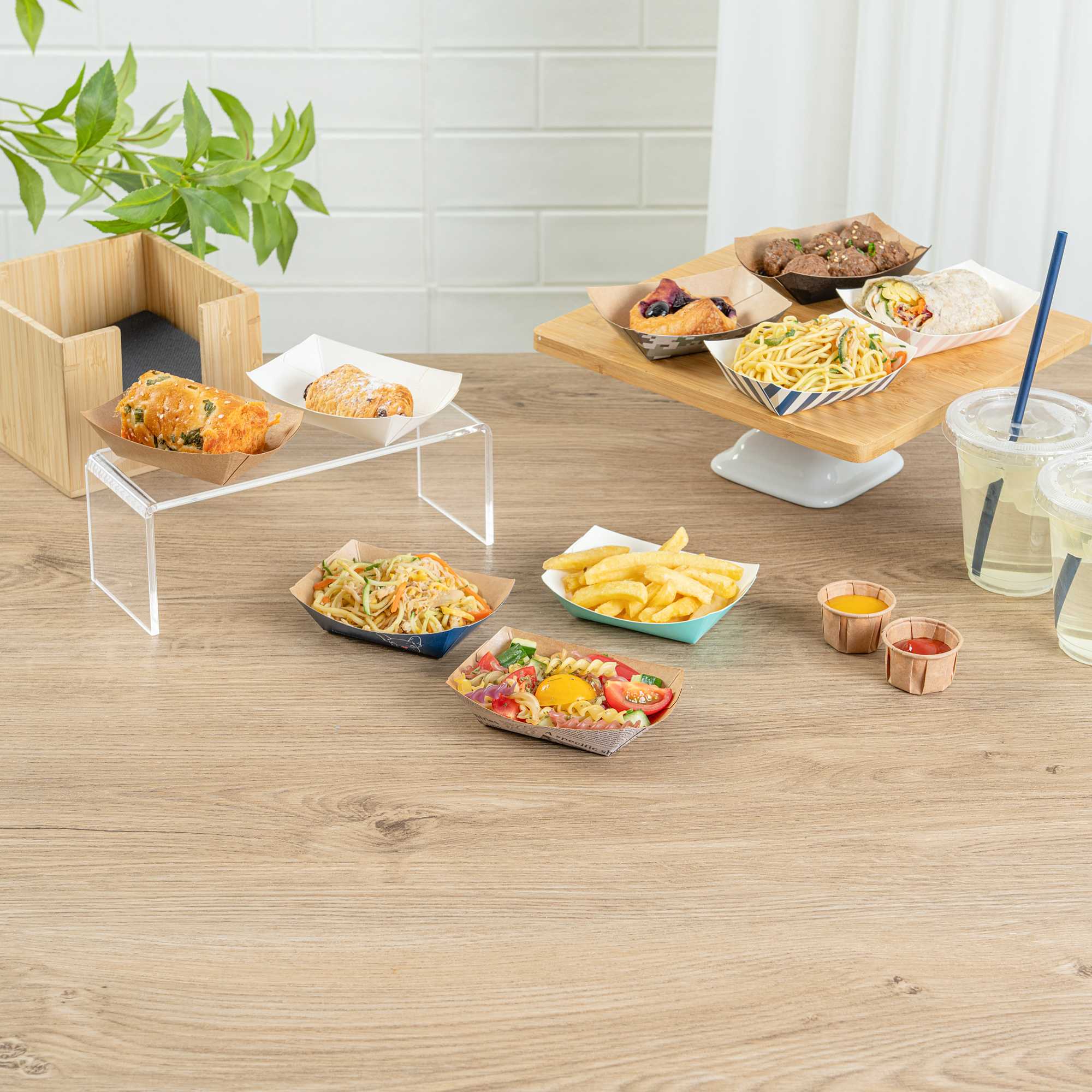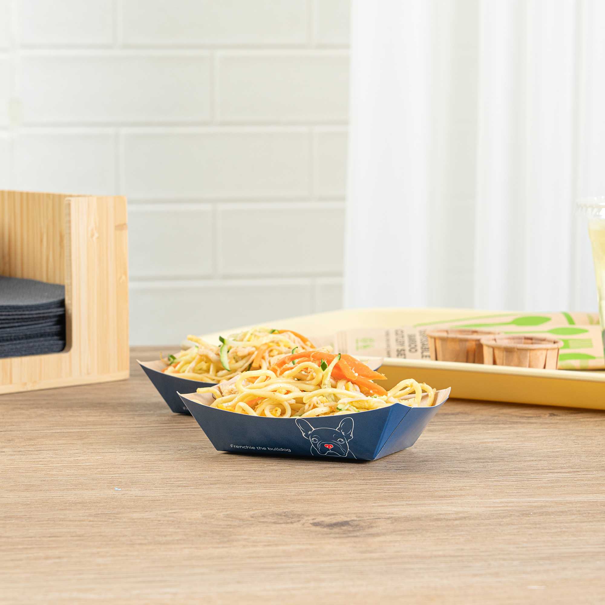 Elevate your catering game with our Bio Tek 4-ounce Frenchie Paper #25 Food Tray / Boats. Created from top-quality paper, these premium paper food boats redefine convenience. Crafted with robust foundations and resilient walls, these cardboard snack trays ensure your delectable side dishes, finger foods, and appetizers remain intact on the move. The convenience of these disposable paper food boats simplifies post-event cleanup. Featuring a greaseproof lining, these small paper food boats effortlessly serve sweet potato fries at your food truck or showcase your restaurant's signature bite-sized delights at any tasting occasion without leaks or messes. With a trendy Frenchie design, these recyclable paper food boats add a rustic touch, perfect for weddings, corporate luncheons, cocktail soirees, and more. Measuring 3 inches long by 2 inches wide by 1 inch tall, these #25 paper food boats can hold up to 4 ounces. Sold in a 400 count box.