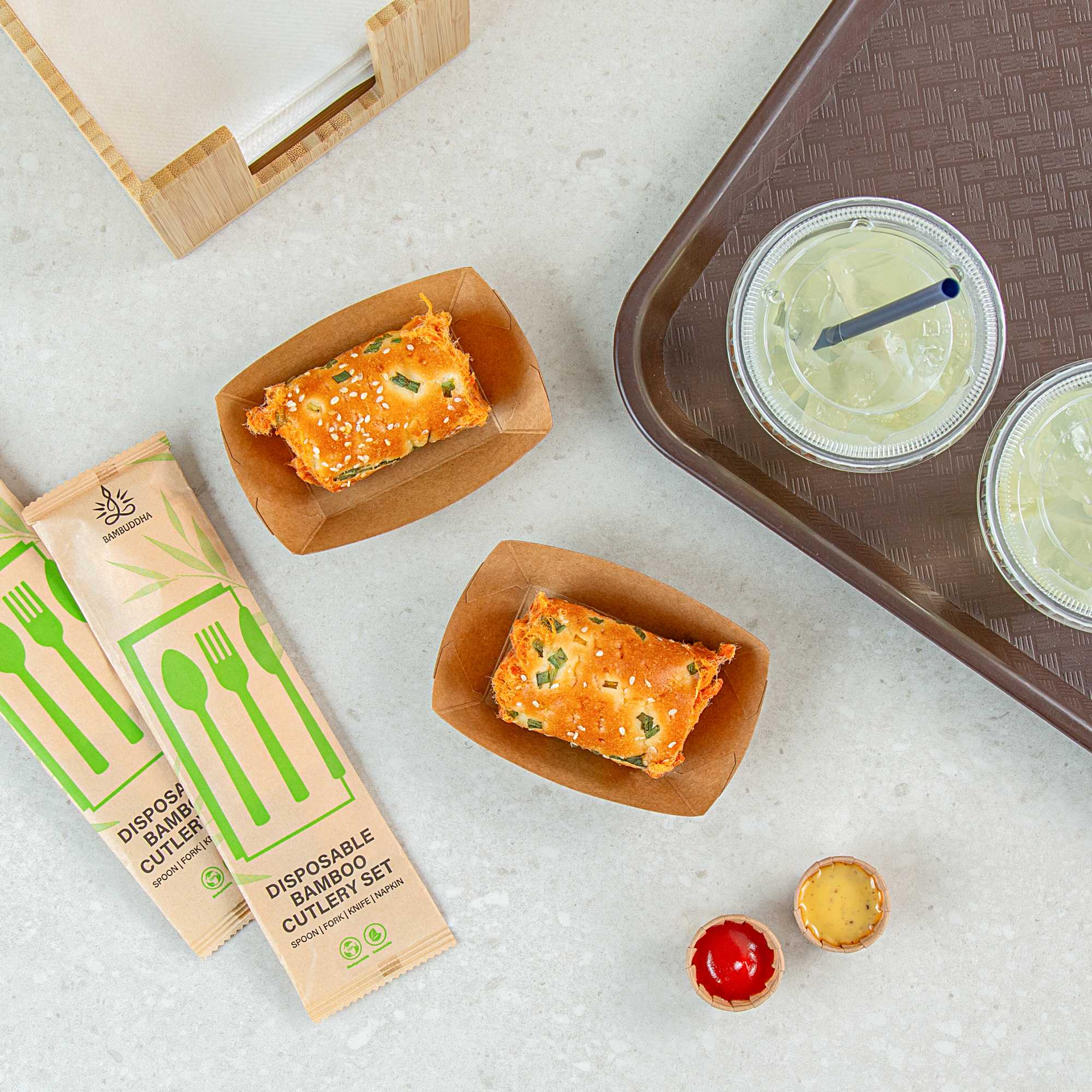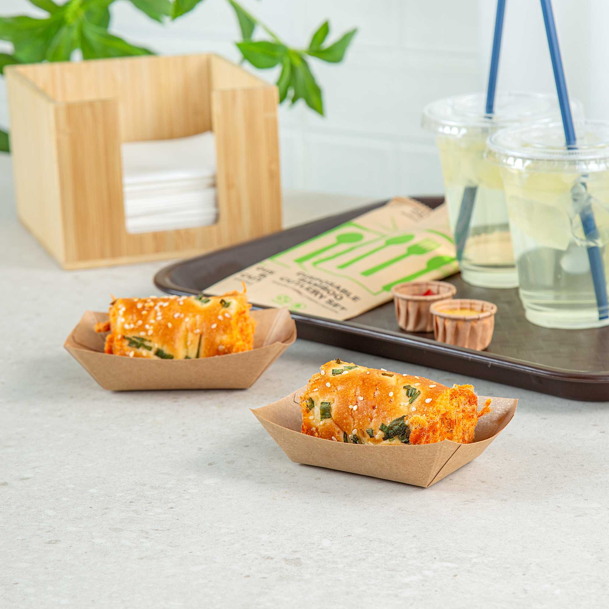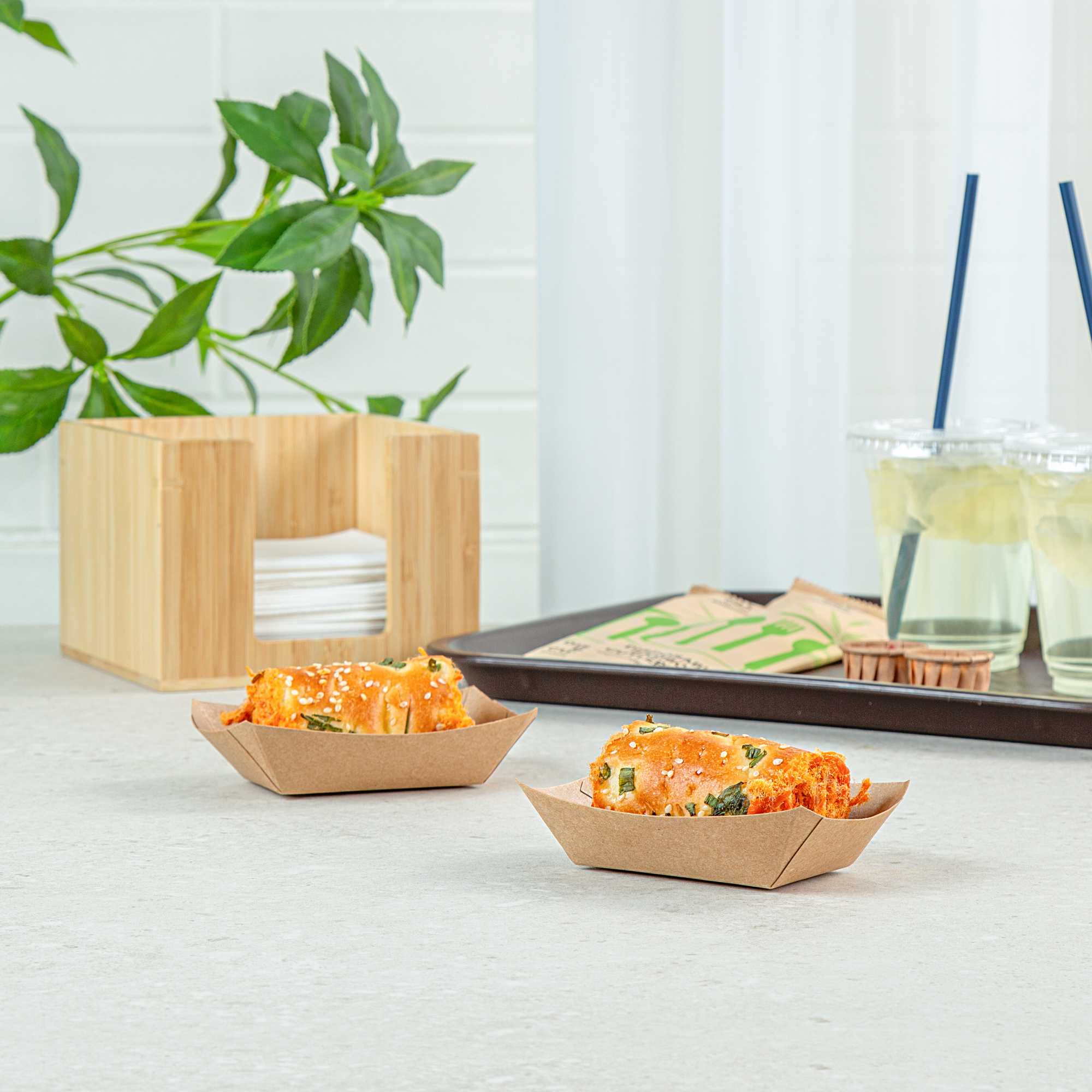 For a simple cleaning process for establishments and guests, these paper food boats are sustainably disposable. Reduce your impact on the environment!