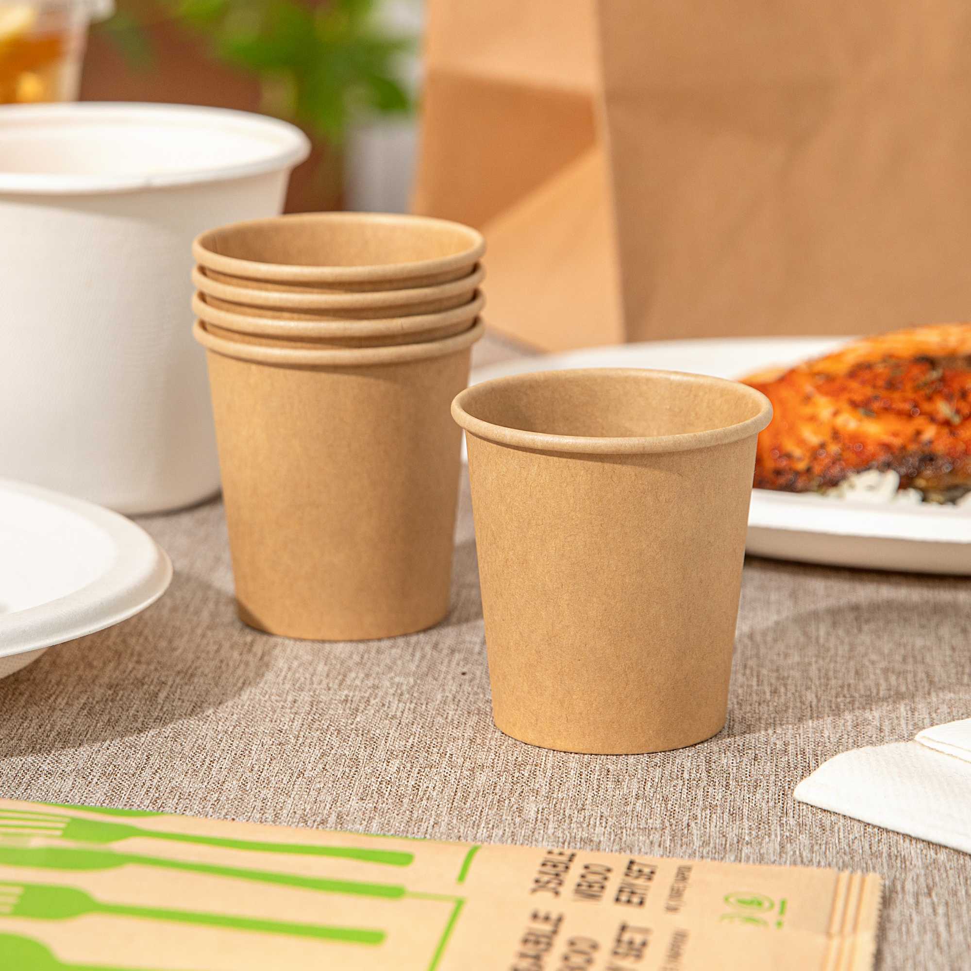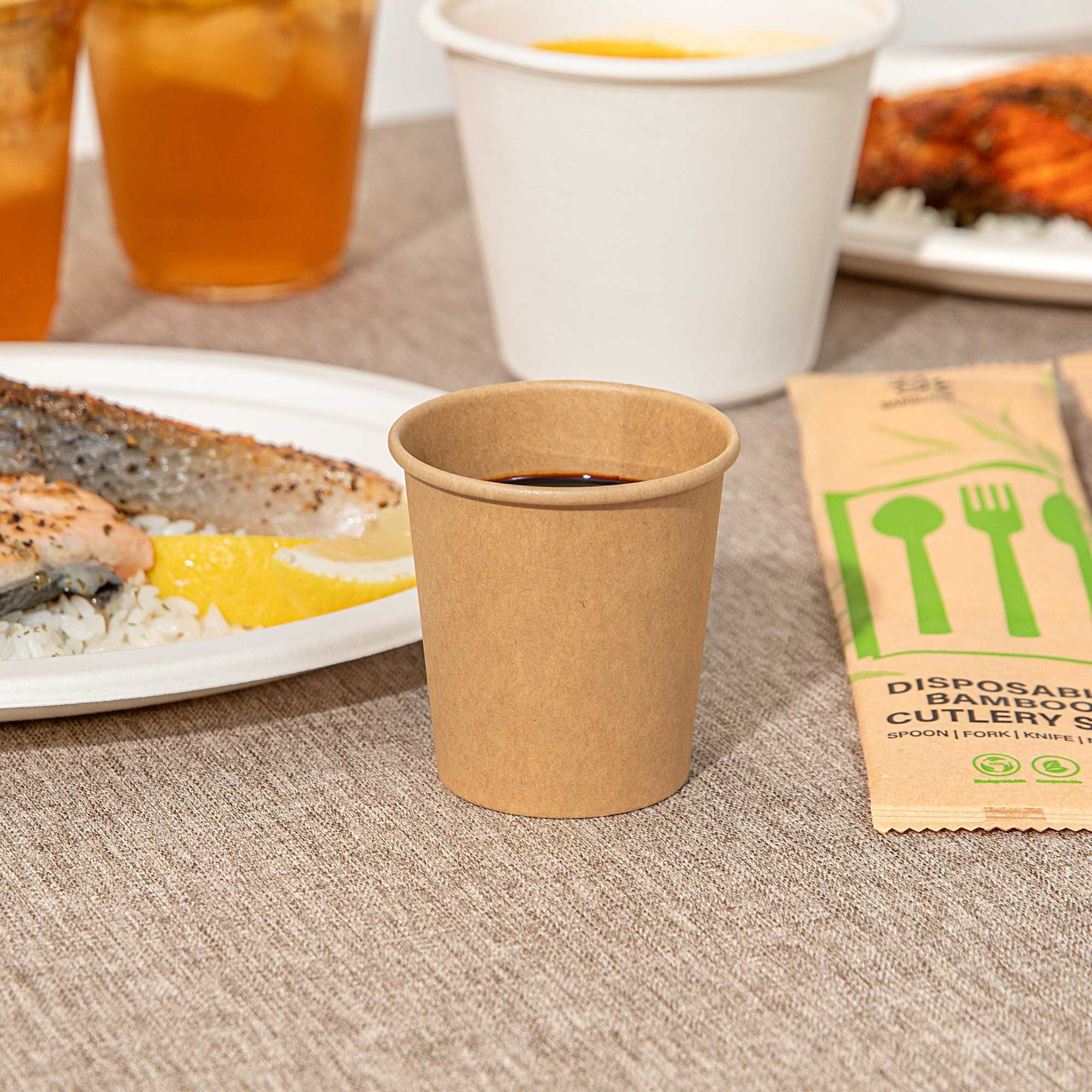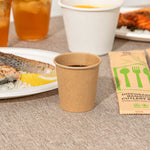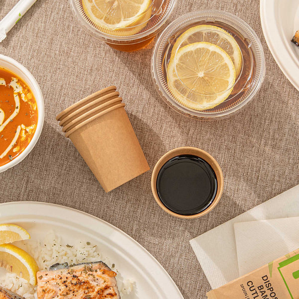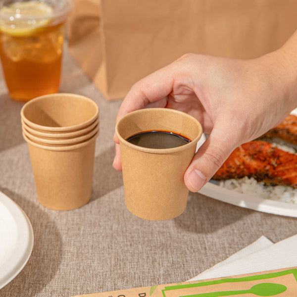 Maintain the perfect temperature and texture of your sauces effortlessly. The Bio Tek 4 oz Kraft Poly-Coated Paper Portion Cup, crafted from 210gsm kraft paper with a PE coating, features a greaseproof, leak-proof, and moisture-resistant design that prevents leaks even with oily foods, ensuring your kitchen remains clean and efficient. This 4-ounce disposable sauce cup is freezer-safe, making it ideal for storing condiments without compromising their taste or quality. Its hot food-friendly structure is perfect for serving chili or stew, giving you the flexibility to handle diverse menu items. With a compact size of 2.44 inches in diameter by 2.56 inches in width, it's a must-have small sauce container for any foodservice professional. Enhance your operational efficiency and maintain food presentation with this indispensable kraft paper sauce cup. Each order includes 2000 Bio Tek 4 oz Kraft Poly-Coated Paper Portion Cups.