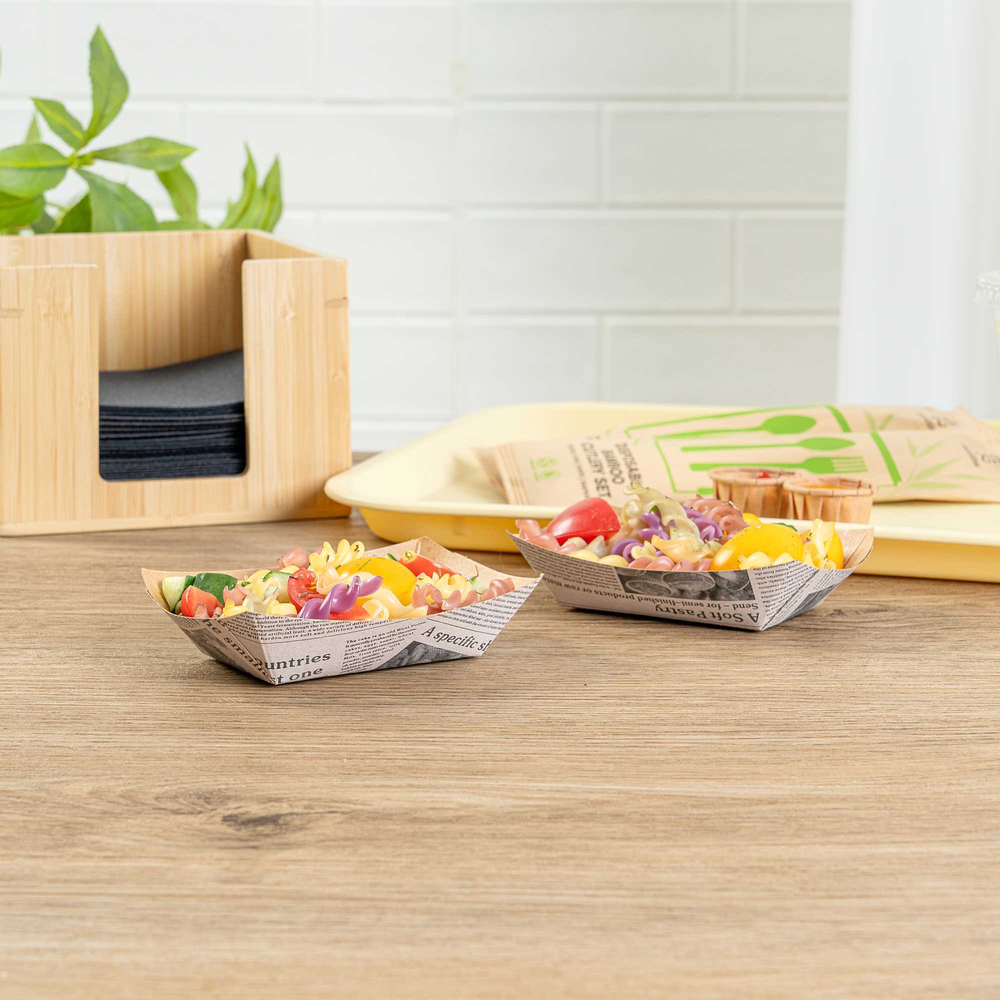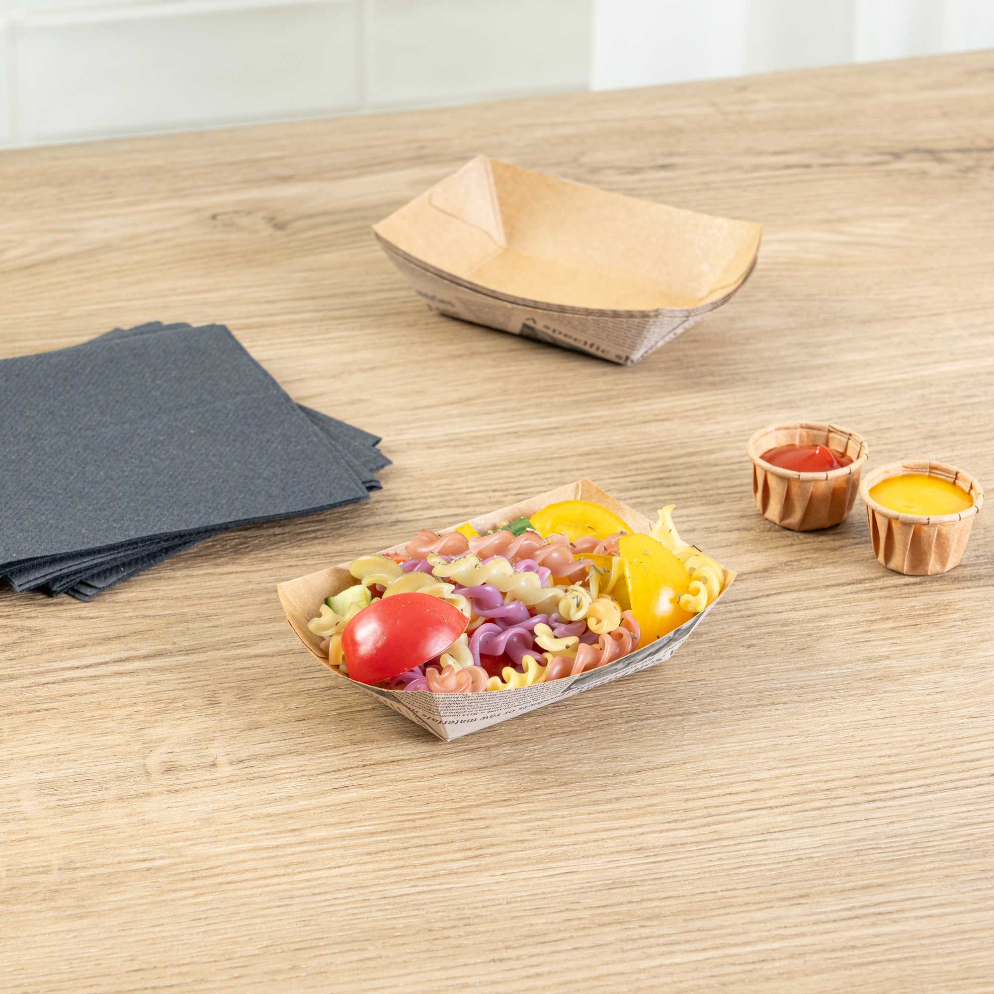 For a simple cleaning process for establishments and guests, these paper food boats are sustainably disposable. Reduce your impact on the environment!