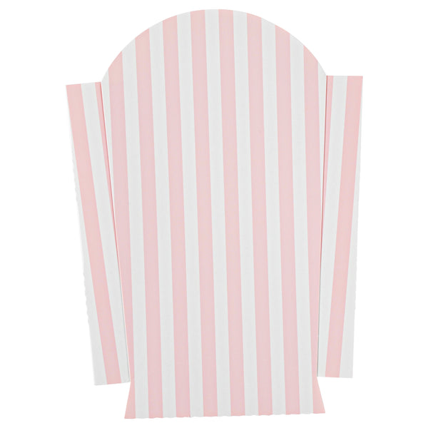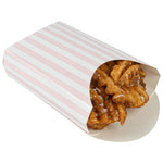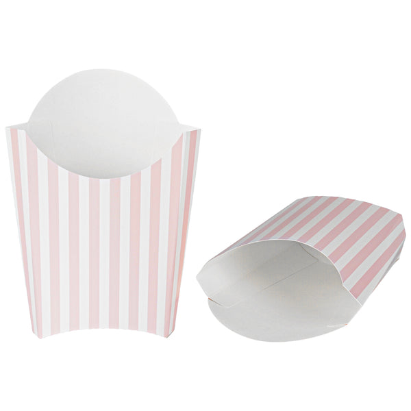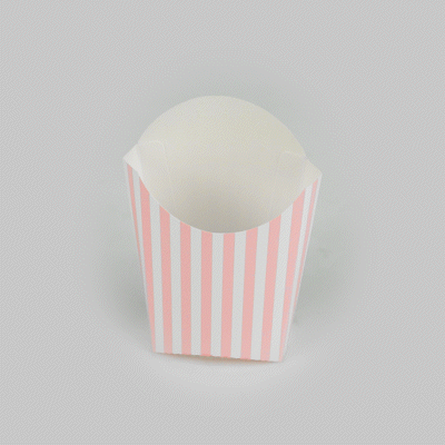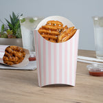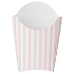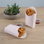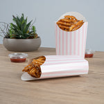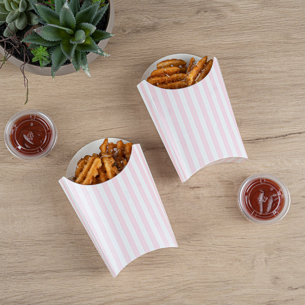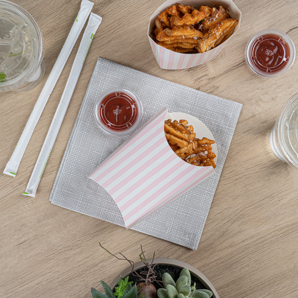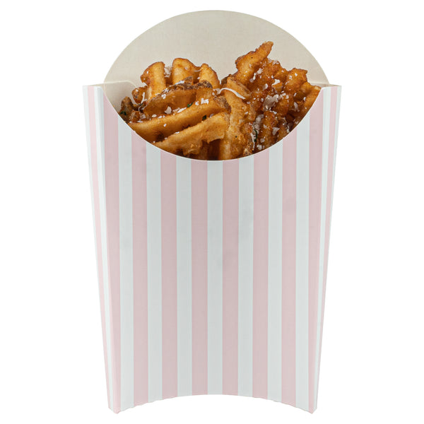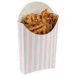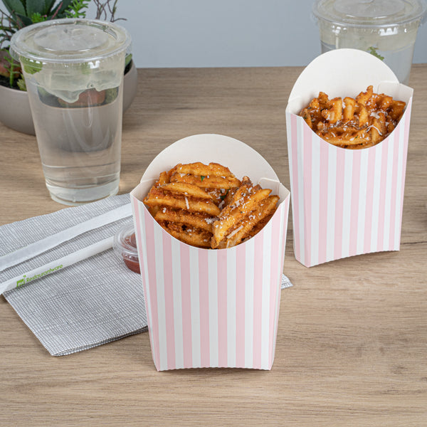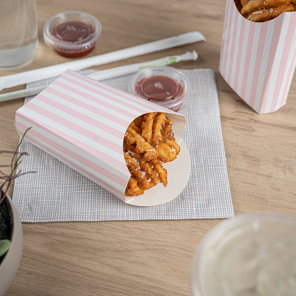 Streamline packing of to-go snacks using our Bio Tek Pink and White Stripe Paper Fry Cups / Snack Containers. Featuring a grease-resistant lining, these disposable fry containers seal in sauces and oils, eliminating leakages. The wide, angled rim of these fry portion cups is designed to allow easy scoping from bins. Made from high-quality paper, these cups offer a strong structure and keep hands cool when carrying hot food. The charming pink and white stripe design adds a delightful touch to your snack presentation. For convenient packaging, these cups can stack with ease, and can be disposed of after use. These 4-ounce cups measure 4.75 inches in length by 3.5 inches in width by 5 inches in height. Sold in a 100 count box.