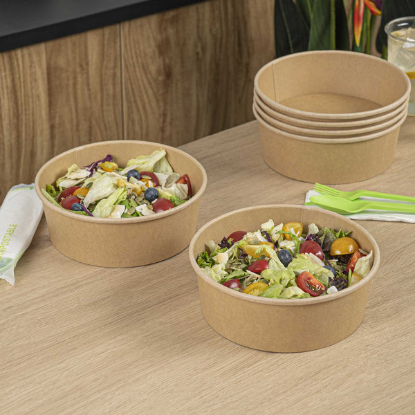 Enhance your foodservice offerings with our Bio Tek 51-ounce Round Kraft Paper Take Out Containers. Pair these takeaway containers with their coordinating plastic lids (SKU: RWA1438C-50) and form a tight seal to protect your culinary creations in transit. The grease-resistant design of these food containers prevents sauces from soaking through and ensures a neat food presentation. To easily reheat your meals, these carry out containers have a PP lining, making them microwave-safe and can withstand temperatures up to 248F. Made from thick kraft paper, these take out food containers are suitable for holding various hot and cold food items. The rustic kraft finish of these to go containers creates a charming look for your take out orders. Designed with sustainability in mind, these disposable food containers are recyclable and offer an environmentally-friendly food packaging solution. These take out boxes are disposable and can be disposed of, offering an easy cleaning experience. Measuring 7.25 inches in diameter by 2.5 inches in height, these take out containers can hold up to 51 ounces. Sold in a 50 count box. Lids are available and sold separately.