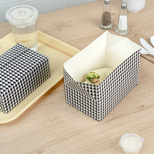 Ensure secure meal transport with spill-resistant takeout solutions. Bio Tek Black Paper Spill-Resistant Takeout Lunch Box features a fast top closure that ensures spill-free food transport, making it the ideal takeout lunch box for restaurants focused on efficient service. With a generous 47-ounce capacity, this paper takeout box accommodates a variety of meal sizes, perfect for businesses offering sizable portions. The greaseproof lining maintains the freshness of fried foods, ensuring customers enjoy crisp dishes with every order. Made from recyclable paper, it supports eco-friendly dining operations, appealing to environmentally conscious consumers and reducing waste. Its stylish black houndstooth pattern elevates your brand presentation, turning ordinary packaging into a visual delight. Whether used as a food delivery container or for grab-and-go services, it provides reliable support with its sturdy 7-inch by 4.5-inch by 2.8-inch dimensions. Elevate your takeout service today with this eco-friendly option. Each order includes 400 Bio Tek Black Paper Spill-Resistant Takeout Lunch Box.