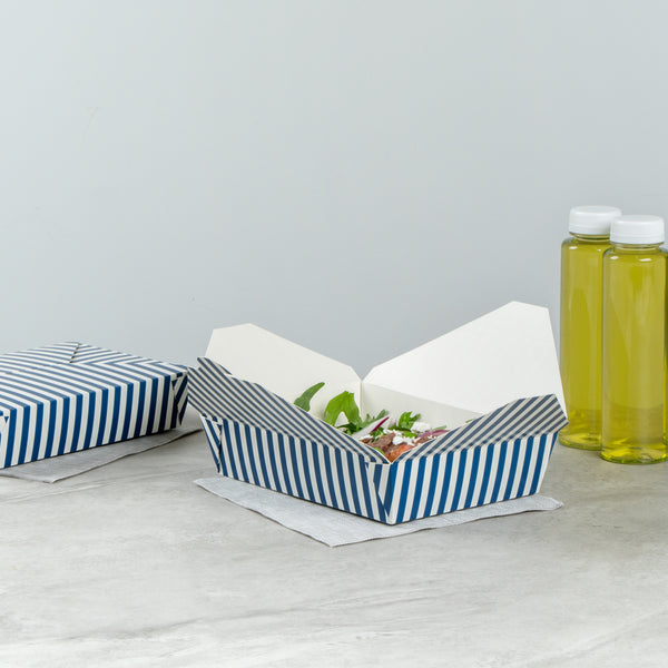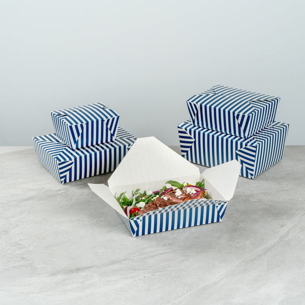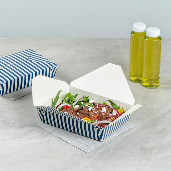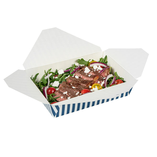 49 OZ BLUE AND WHITE STRIPE PAPER #2 BIO BOX TAKE OUT CONTAINER