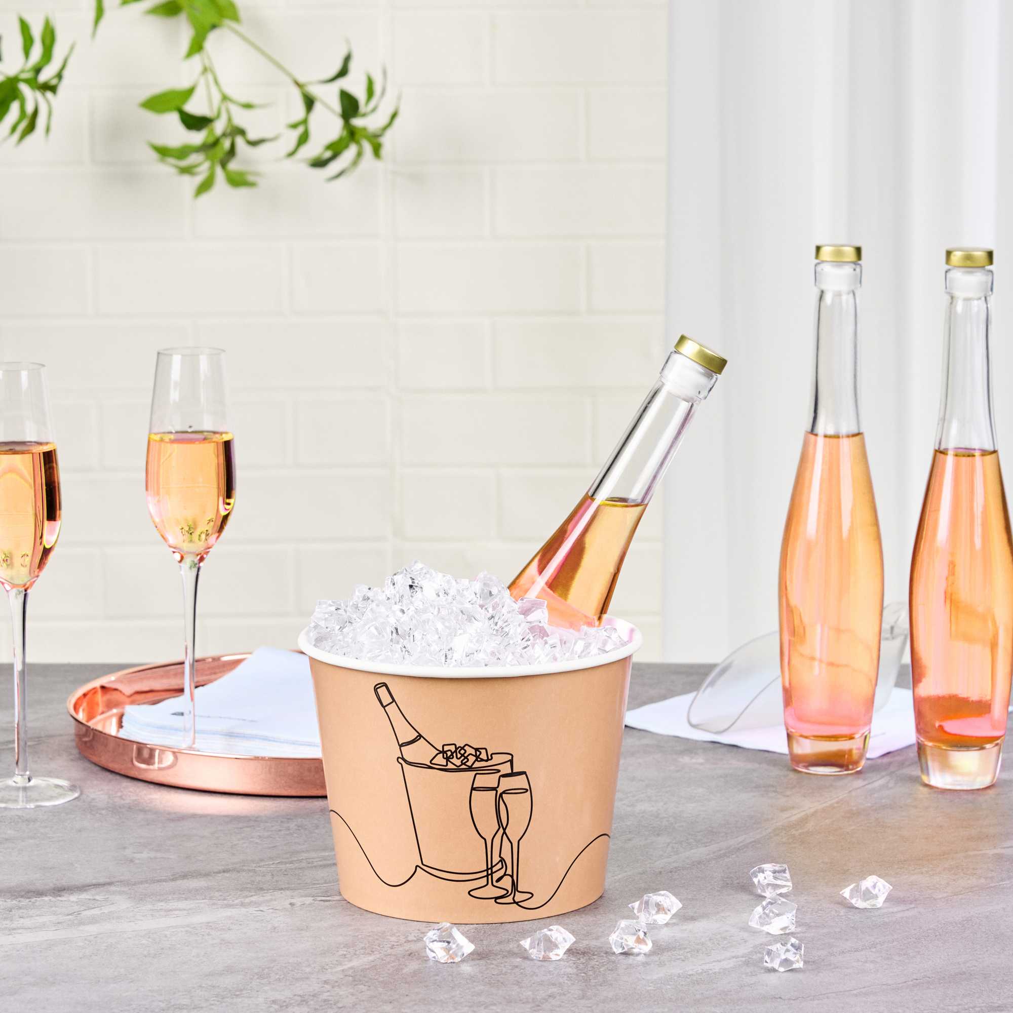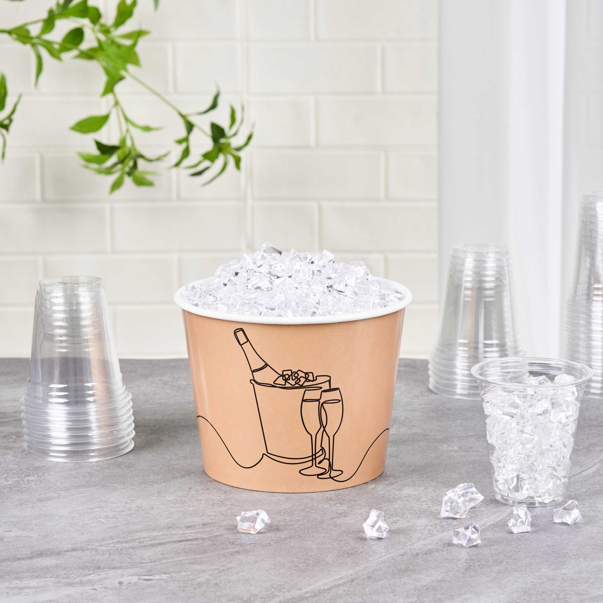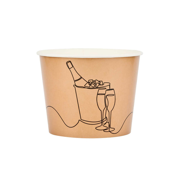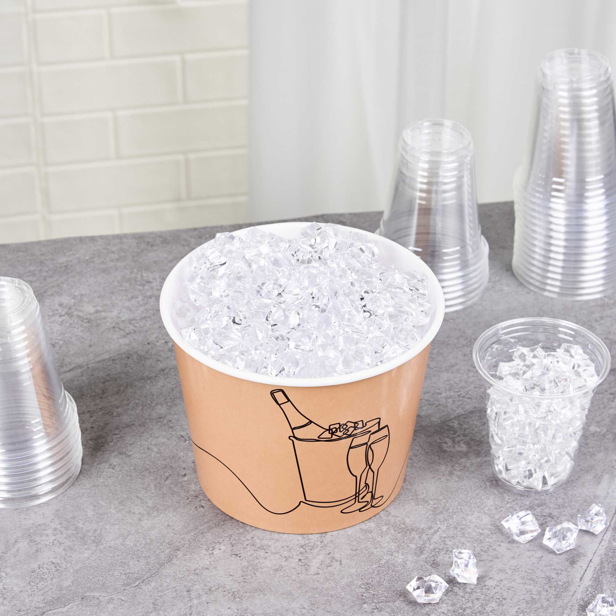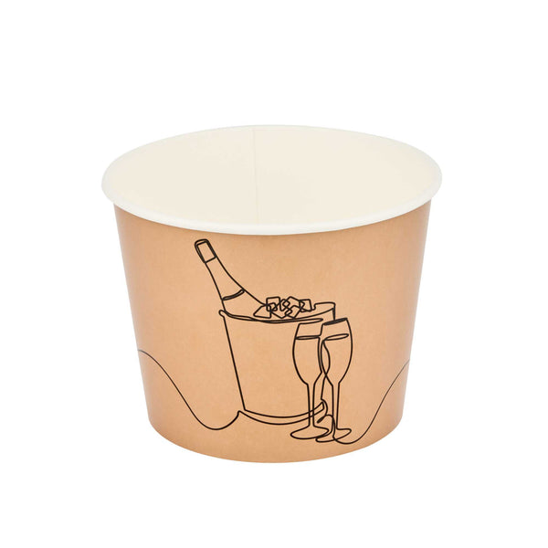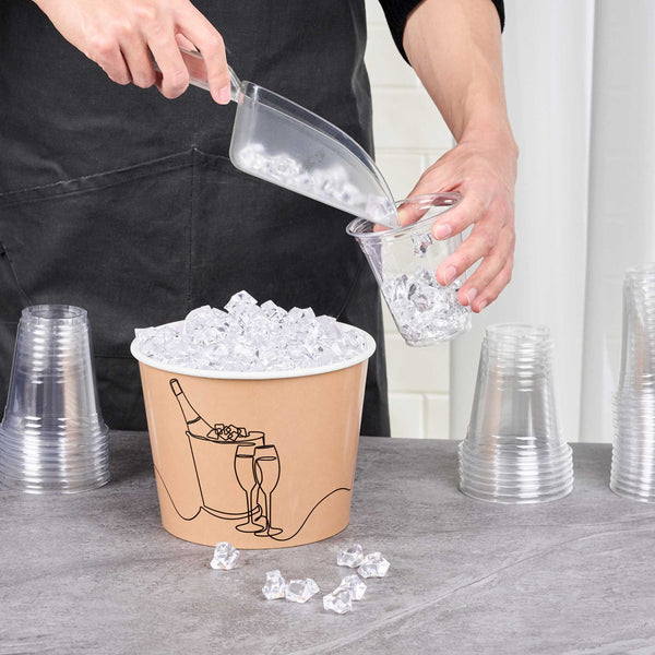 Ensure seamless service with dependable ice storage with our Bio Tek 5 lb Kraft Disposable Paper Ice Bucket. This wide-mouth, kraft-colored bucket features a double liner that expertly maintains ice, making it an ideal disposable ice bucket for extended service times. Constructed from sturdy, double-sided poly-coated paper, this hotel room ice bucket is both hot food friendly and cold food friendly, providing versatile use. The insulated design, measuring 7.5 inches by 7.5 inches by 5.75 inches, is freezer-friendly, making it perfect for pre-prepared chilled items, ensuring it meets various foodservice needs. Its kraft color and printed design complement rustic themes, enhancing the visual appeal of catering events or outdoor gatherings. Elevate your service with this dependable insulated ice bucket, designed to keep contents at their ideal temperature. Sold in a 100 count box.
