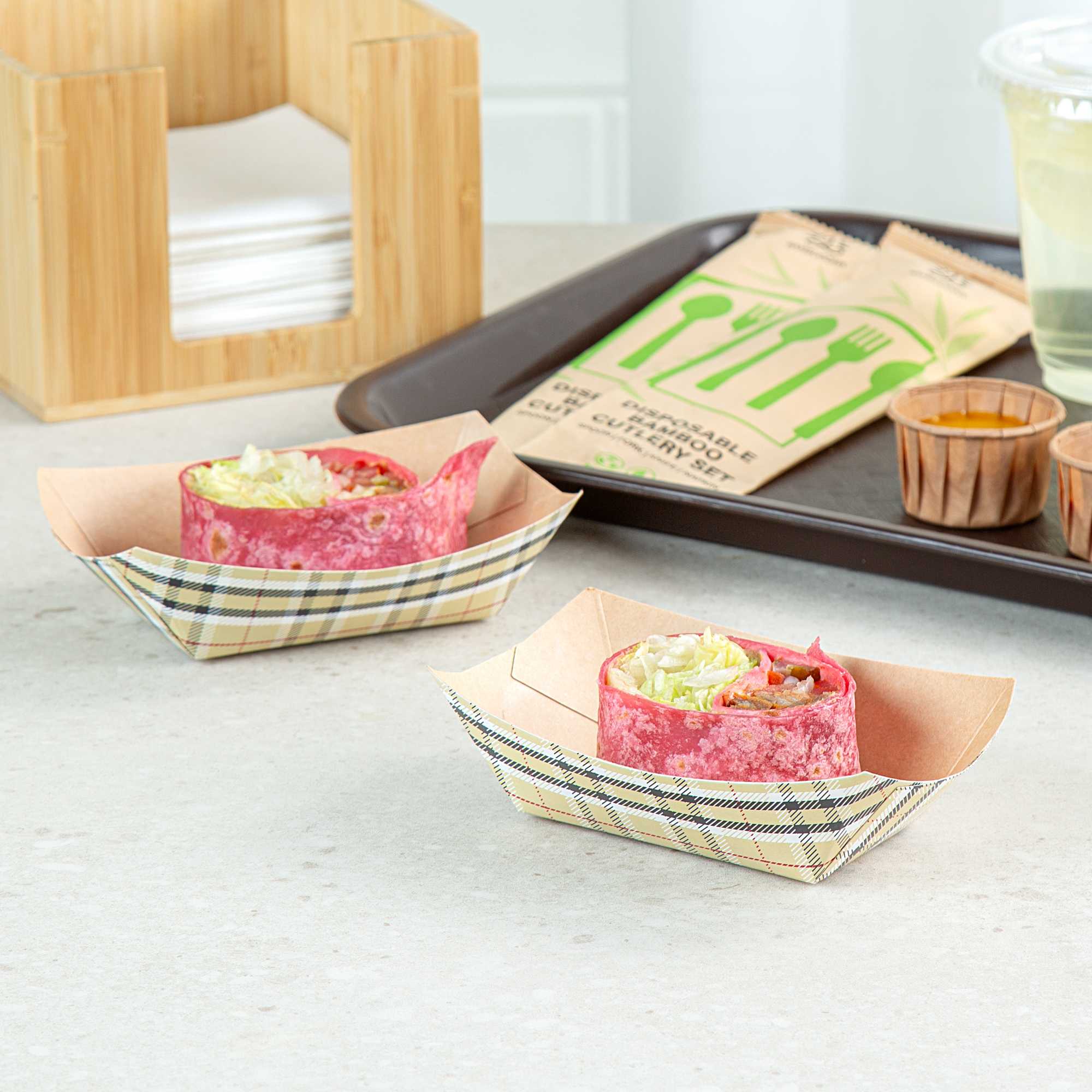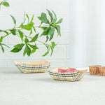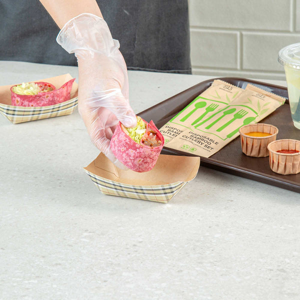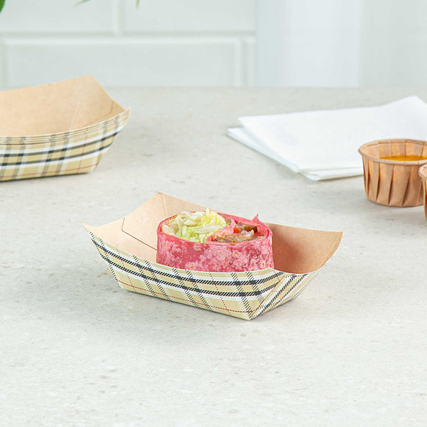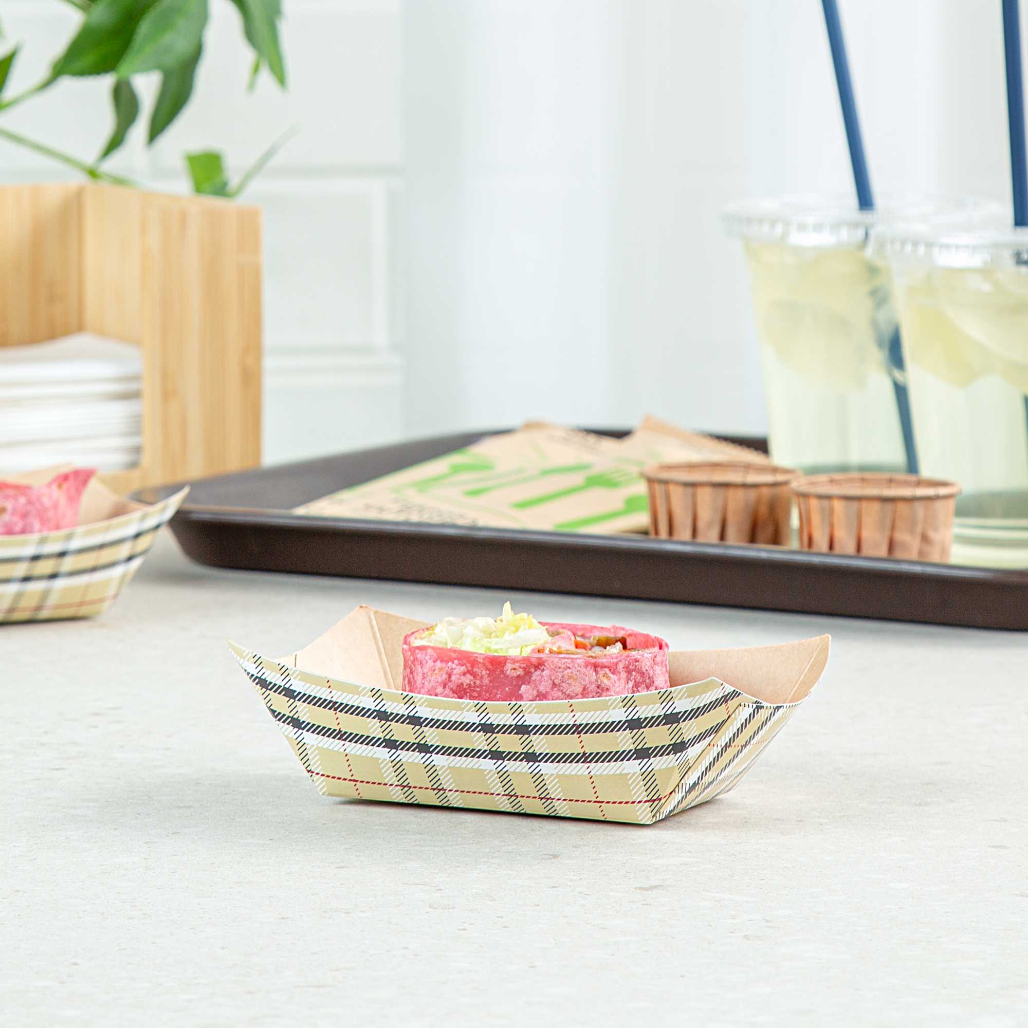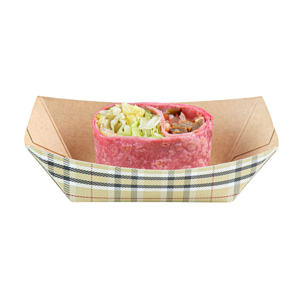 Discover the pinnacle of convenience with our Bio Tek 6-ounce Plaid Paper #40 Food Tray / Boats. Made from premium greaseproof paper, these cardboard snack trays come with sturdy bases and strong walls, providing a neat way to enjoy side dishes, finger foods, and appetizers while on the move. Employ these small paper food trays to effortlessly serve sweet potato fries at your food truck or to present elegant portions of your signature appetizers without any oil or grease spills. The trendy plaid print adds an enchanting touch, making them a splendid choice for weddings, corporate luncheons, cocktail parties, and other catered gatherings. Simplify the task of cleaning up after events with these disposable paper food boats. These small food boats measure 3.25 inches long by 2 inches wide by 1.5 inches tall, and these #40 paper food trays hold up to 6 ounces. Sold in a 50 count box.