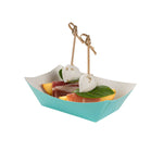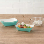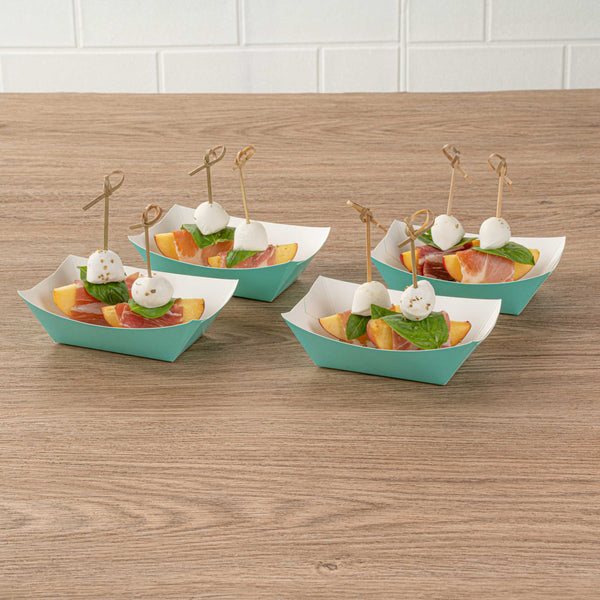 Elevate your catering experience with our Bio Tek 6-ounce Turquoise Paper #40 Food Tray / Boats. Crafted from premium greaseproof paper, these cardboard snack trays feature sturdy bases and robust walls, ensuring a mess-free solution for enjoying side dishes, finger foods, and appetizers on the move. Utilize these small paper food trays to serve up sweet potato fries at your food truck or to present elegant portions of your signature appetizers. These disposable food boats are tailored for easy event cleanup. The attractive turquoise finish adds an enchanting touch, making them a superb choice for weddings, corporate luncheons, cocktail gatherings, and various catered occasions. These small food boats measure 3.25 inches long by 2 inches wide by 1.5 inches tall, and these #40 paper food trays hold up to 6 ounces. Sold in a 400 count box.