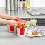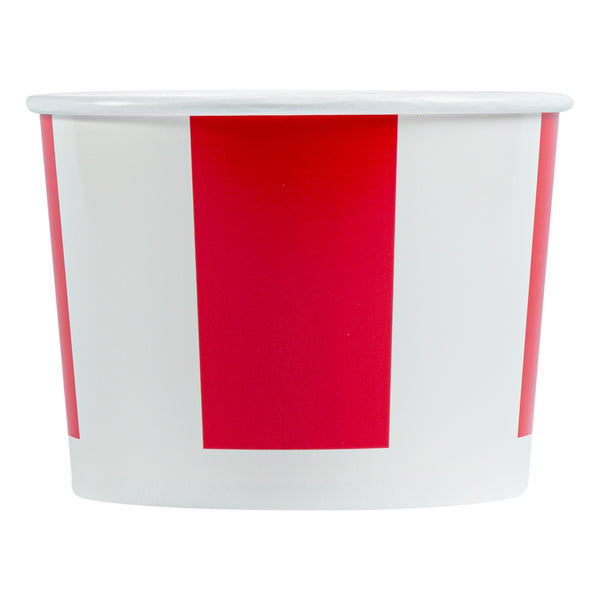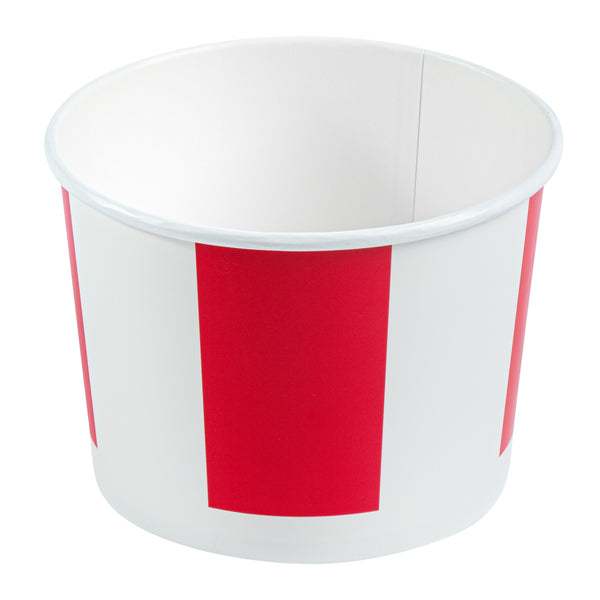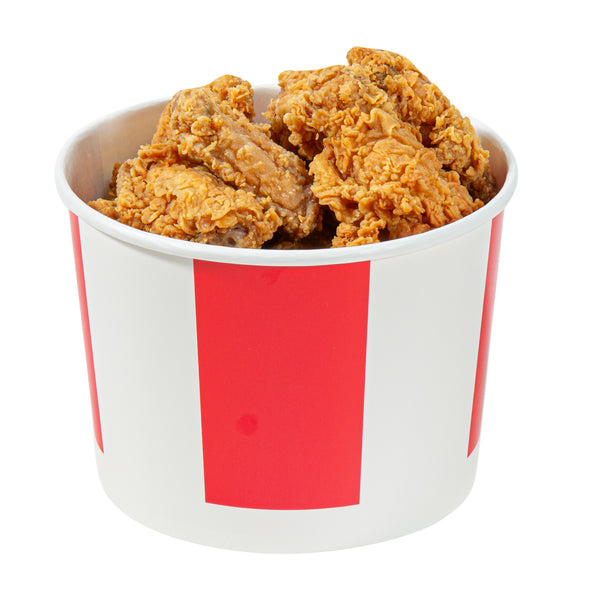 Elevate your food-serving experience with our Bio Tek 64-ounce Red and White Paper Chicken Buckets, designed for efficiency and style. Made with a double PE coating, these durable paper chicken buckets are greaseproof ensuring they block oil or grease from seeping through, keeping surfaces clean. The included vented lid, made from single PE-coated paper, enhances insulation, ensuring that food remains hot and fresh during take out orders and delivery. Perfect for restaurants and caterers, this chicken bucket with lid provides a reliable and visually appealing packaging solution. Our chicken buckets are recyclable, making them an eco-friendly choice for your food packaging needs. The striped red and white design of these disposable chicken buckets adds a professional touch, enhancing the presentation of your food and leaving a lasting impression on customers. These freezable chicken buckets with lids are perfect for conveniently storing leftovers. Measuring 6.61 inches in diameter by 4.84 inches in hieght, these buckets are both practical and spacious, boasting a generous 64-ounce capacity. Sold in a 25 count box.