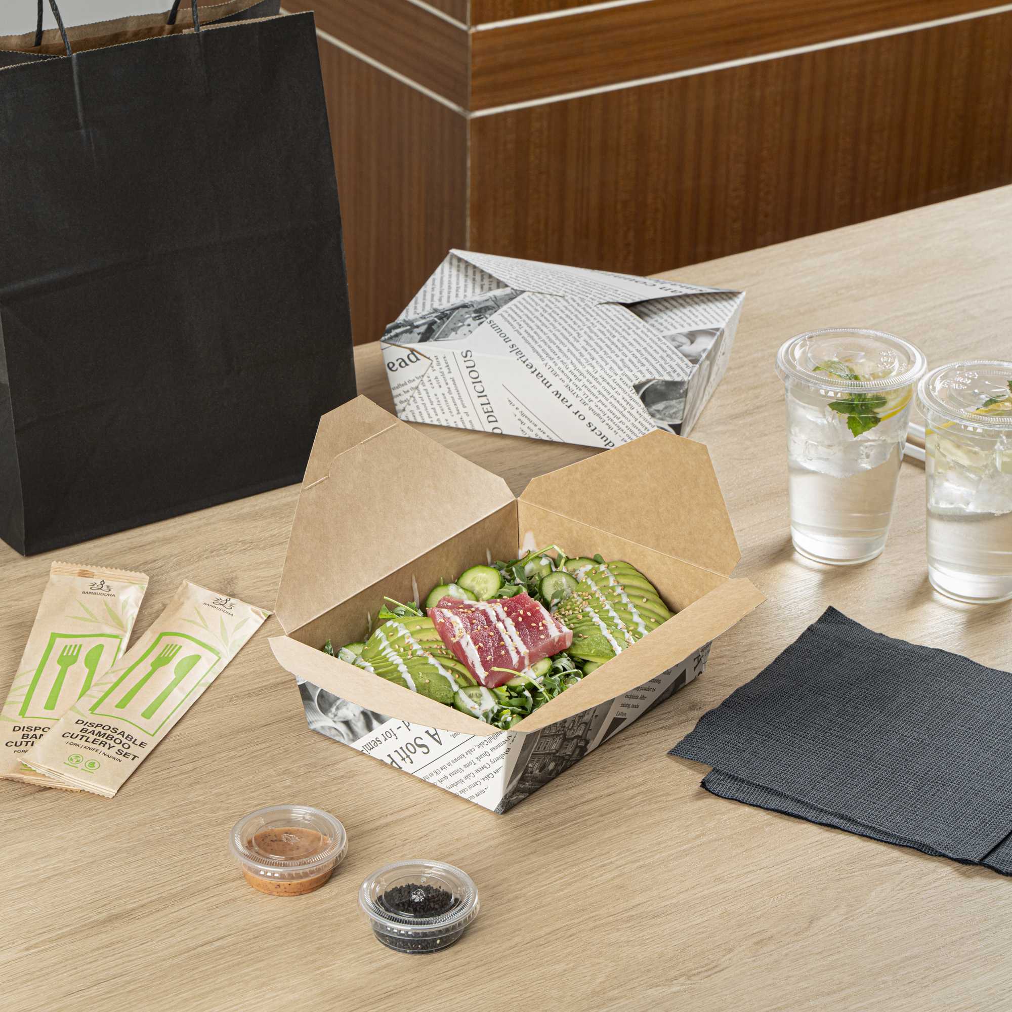 No matter the size of your dish, our disposable food boxes are available in different capacities to accommodate any meal. Choose from our soup, noodle, salad, or rectangle containers to easily pack and take food anywhere.
