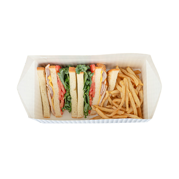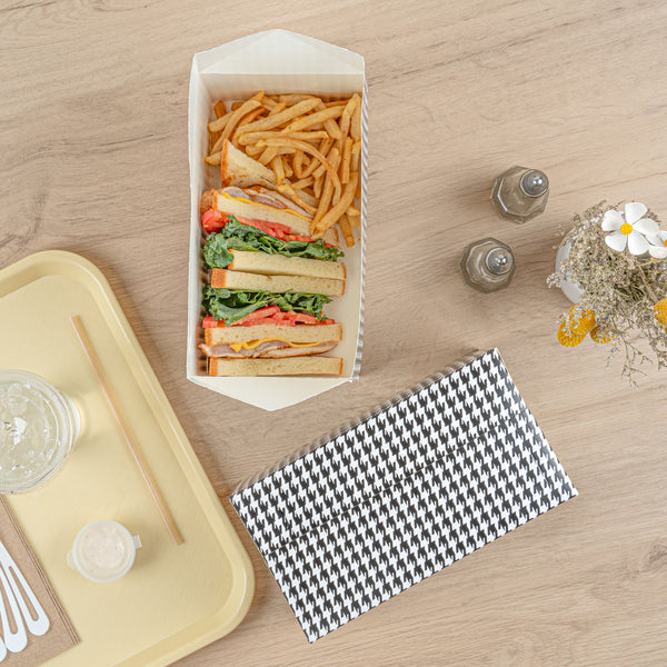 Enhance your foodservice efficiency with spill-resistant takeout solutions. The Bio Tek Spill-Resistant Takeout Box features a fast top closure, ensuring a secure seal that prevents spills during transport—perfect for takeout boxes. With its greaseproof lining, this black paper box effectively prevents oil leaks, maintaining the freshness of your meals while enhancing the presentation with a stylish black houndstooth pattern. Its recyclable paper construction minimizes waste, making it an eco-friendly choice that aligns with sustainability initiatives. Ideal for large portions, the 80-ounce capacity accommodates family-sized meals or bulk orders, and its 9 inches by 5 inches by 5 inches dimensions provide sturdy support for heavy or saucy dishes. This hot food container is suitable for both hot and cold foods, offering versatility for various menu items. Elevate your takeout services with reliable and environmentally conscious packaging. Each order includes 100 Bio Tek Spill-Resistant Takeout Box.