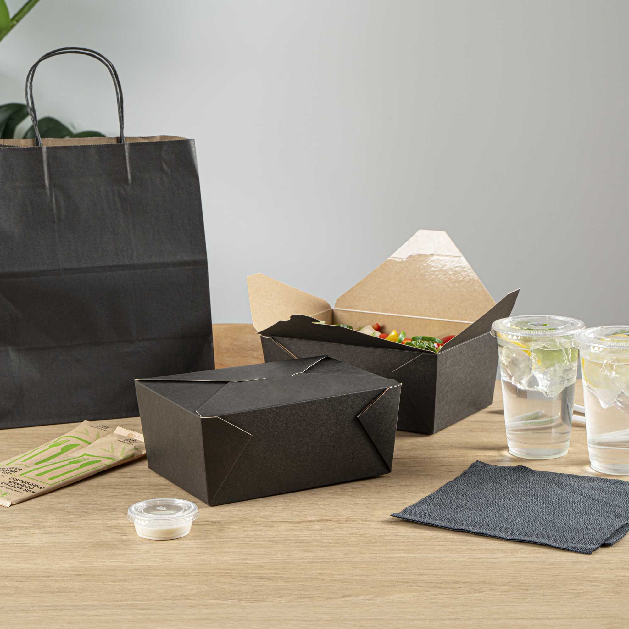 Find food containers with colorful designs such as our black, green, or red finishes to match with your restaurant’s color scheme or logo. Add a pop of color to your take out presentations!