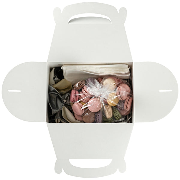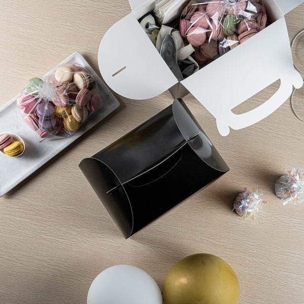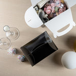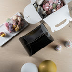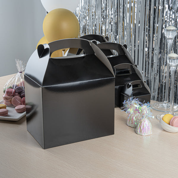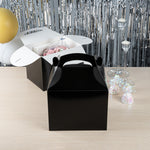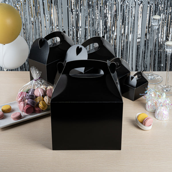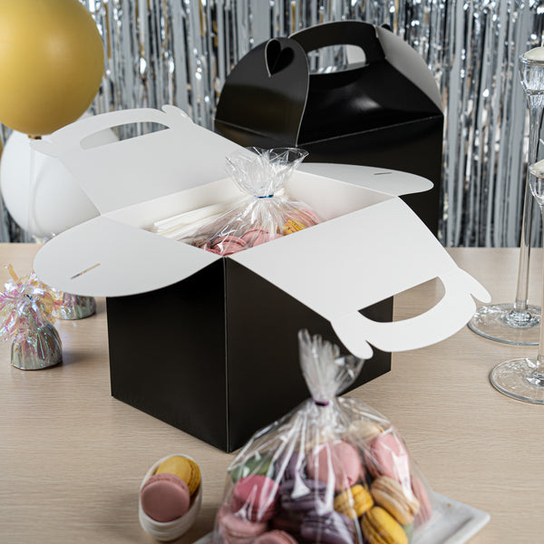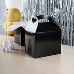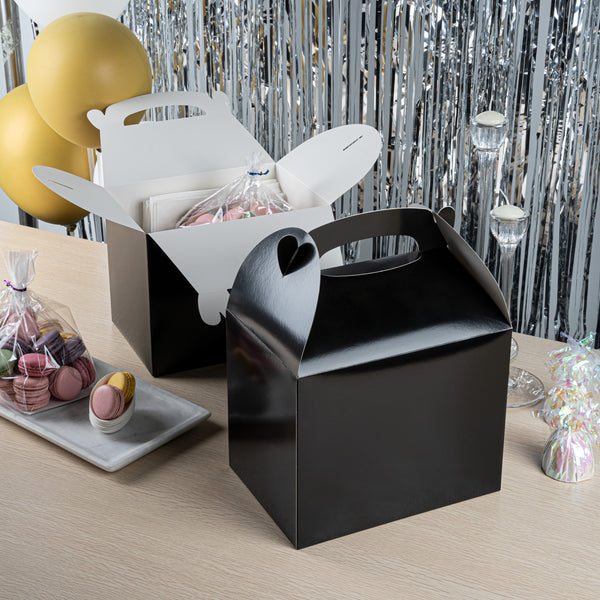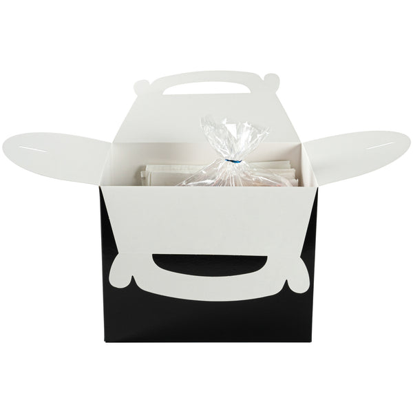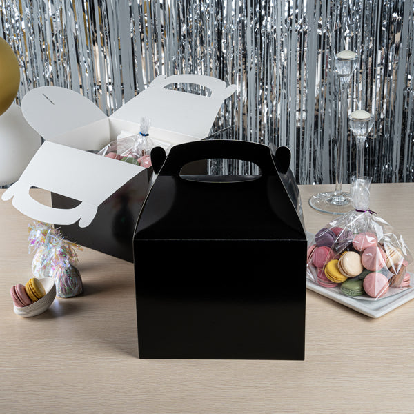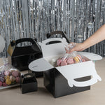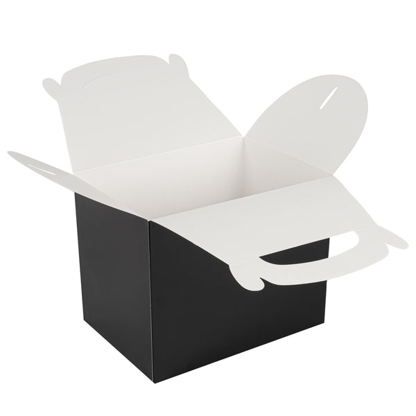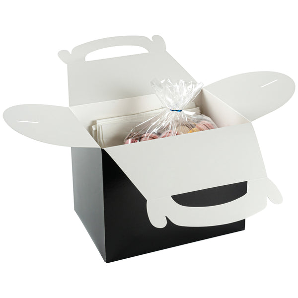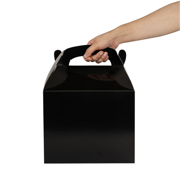 Transport meals confidently with greaseproof black kraft gable boxes. The Bio Tek Greaseproof Black Paper Gable Boxes feature a greaseproof lining that prevents oils from seeping through, ensuring your food remains fresh and your packaging clean. Designed with an ergonomic handle, these kraft paper gift boxes enable comfortable carrying of orders, making them ideal for busy catering events or take out operations. Measuring 10 inches long, 7 inches wide, and 8 inches high, these black boxes have a freezer-safe construction, allowing you to store frozen treats without worry. Constructed from recyclable paper, they offer an eco-friendly solution to your packaging needs. Enhance the presentation and functionality of your take out service with these versatile boxes. Each order includes 25 Bio Tek Greaseproof Black Paper Gable Boxes.