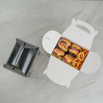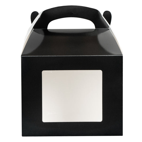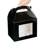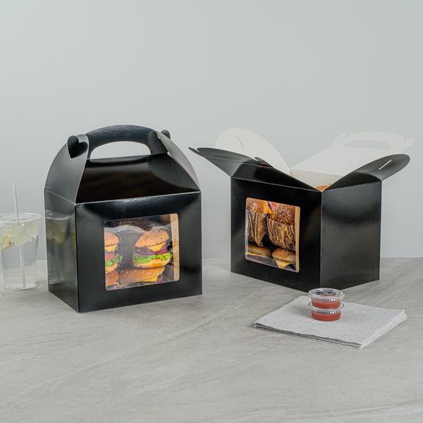 Ensure effortless and mess-free transport with greaseproof packaging. Bio Tek Black Paper Gable Boxes / Take Out Containers feature a greaseproof lining that prevents oil stains on surfaces, ideal for maintaining pristine presentation on countertops. These kraft paper boxes include an integrated plastic window, offering an enticing sneak peek of your baked goods or deli sandwiches, enhancing the customer experience. The built-in handle allows easy transport of orders, making these wedding favor boxes perfect for caterers and event planners who need reliable and stylish solutions. Crafted from sturdy paper, these boxes measure 10 inches in length, 7 inches in width, and 8 inches in height, accommodating a variety of food items while being cold food friendly and freezer-safe. Elevate your packaging game and showcase your creations with these versatile gift boxes with windows. Sold in a 25 count box.