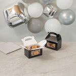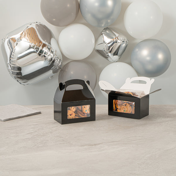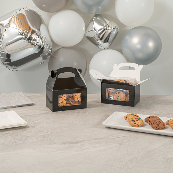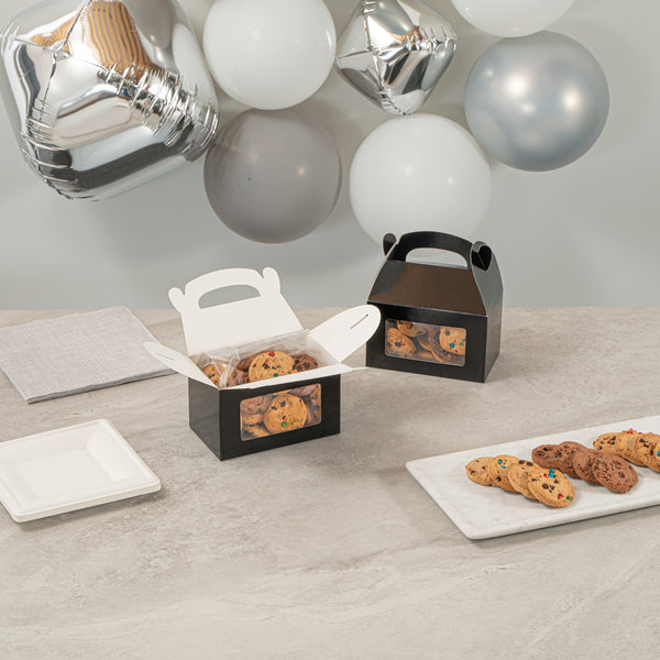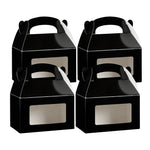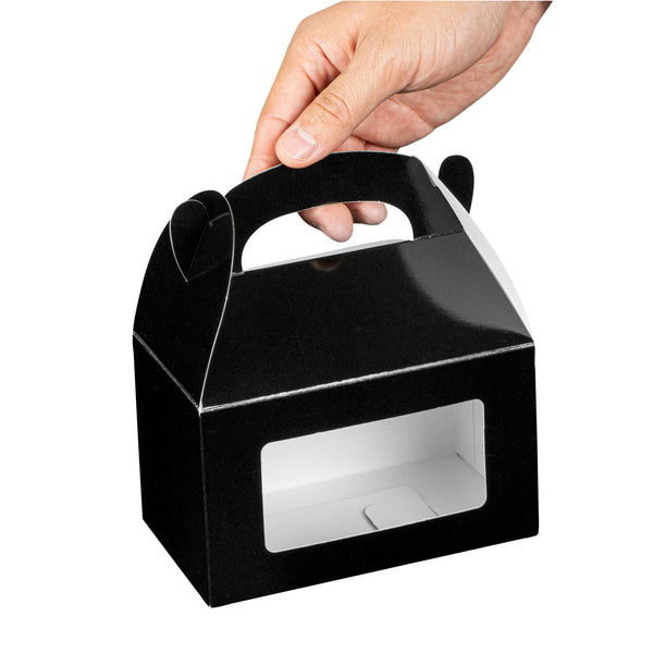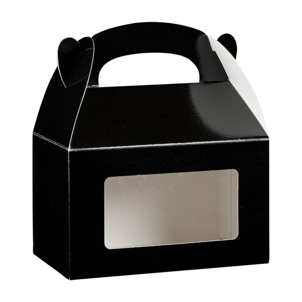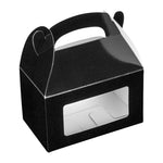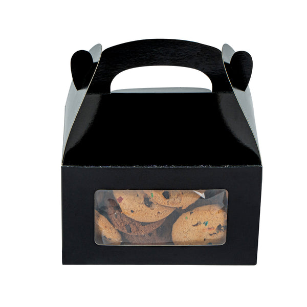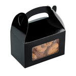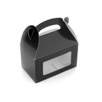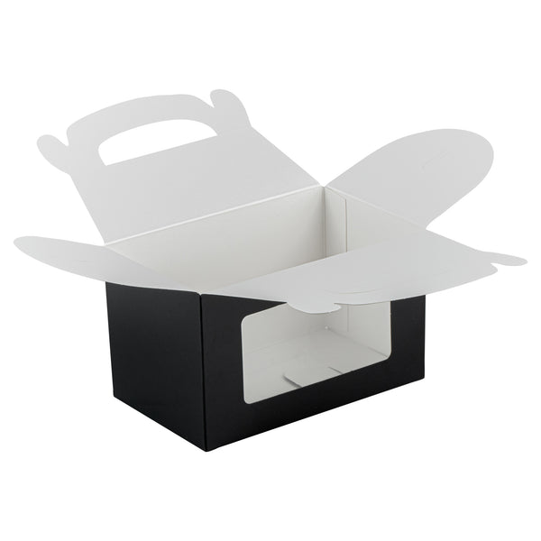 Present food with sophistication using Bio Tek Black Paper Gable Boxes / Take Out Containers, featuring a built-in window that provides a clear view of the items inside. Crafted from sturdy black paper, these containers are recyclable and bring a sleek, modern touch to packaging. Their greaseproof lining prevents leaks from oily or saucy foods, while the freezer-safe construction helps maintain freshness. A built-in handle ensures comfortable portability, making them convenient for customers and staff. Measuring 6 inches in length, 3.5 inches in width, and 3.5 inches in height, these versatile boxes are well-suited for desserts, snacks, or small meals. Shipped in a 100 count box, they balance durability with elevated presentation.