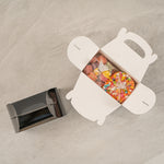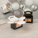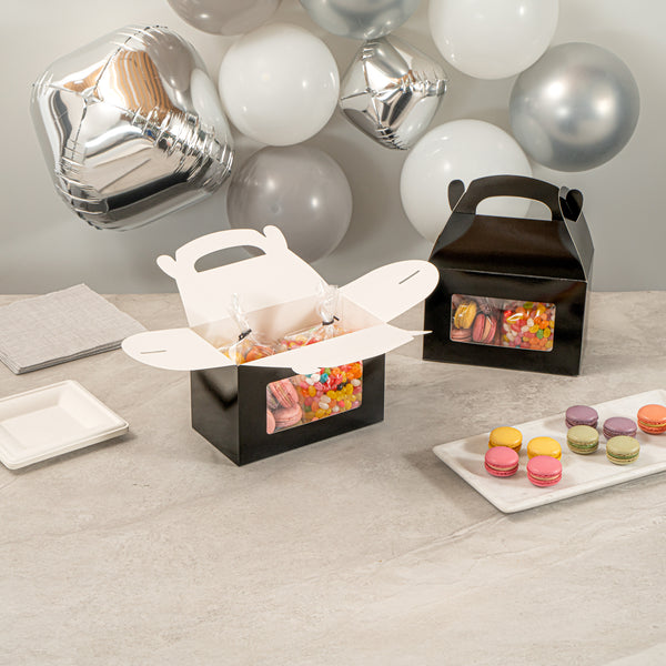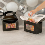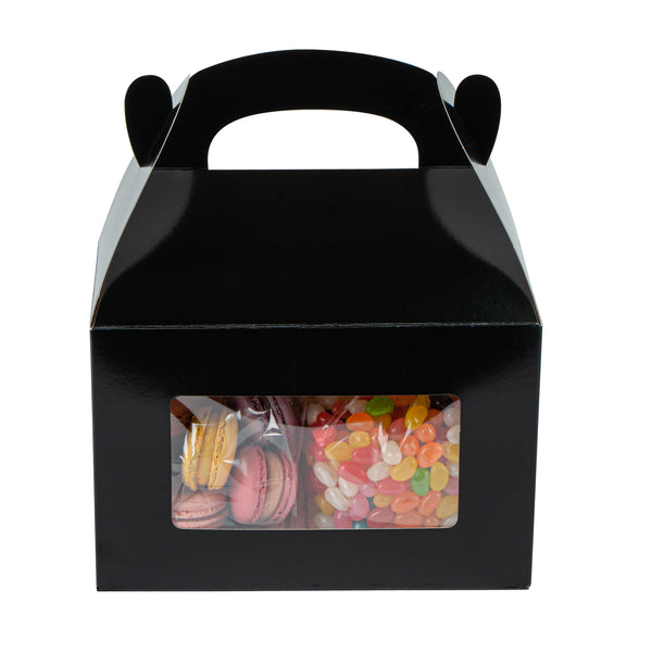 Enhance your presentation with greaseproof paper gift boxes. Bio Tek Black Paper Gable Boxes / Take Out Containers With Handle feature a greaseproof lining that keeps surfaces clean and oil-free, ensuring your baked goods arrive in pristine condition. These elegant black gift boxes with handle are equipped with an integrated plastic window, offering an enticing peek at the contents and enhancing product visibility for customers. Perfect for foodservice professionals, these window gift boxes include a built-in handle, simplifying the carrying of large orders comfortably and efficiently. Measuring 8.5 inches in length, 4.75 inches in width, and 5.5 inches in height, these gable gift boxes are crafted from durable paper, making them both recyclable and eco-friendly. Elevate your packaging solutions with these practical and stylish boxes, designed for both hot and cold food applications. Sold in a 100 count box.